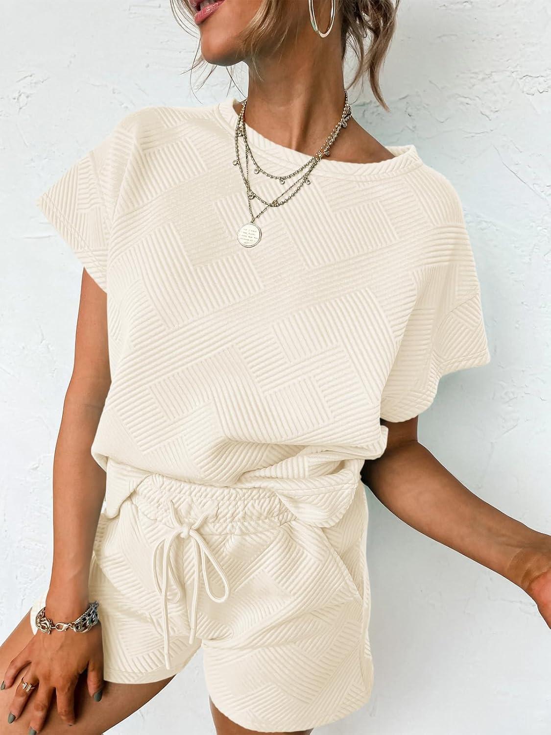 Tankaneo Womens Loungewear Set Short Sleeve Tops and Shorts 2 Piece Outfits Matching Lounge Pajama Set with Pockets(Beige)