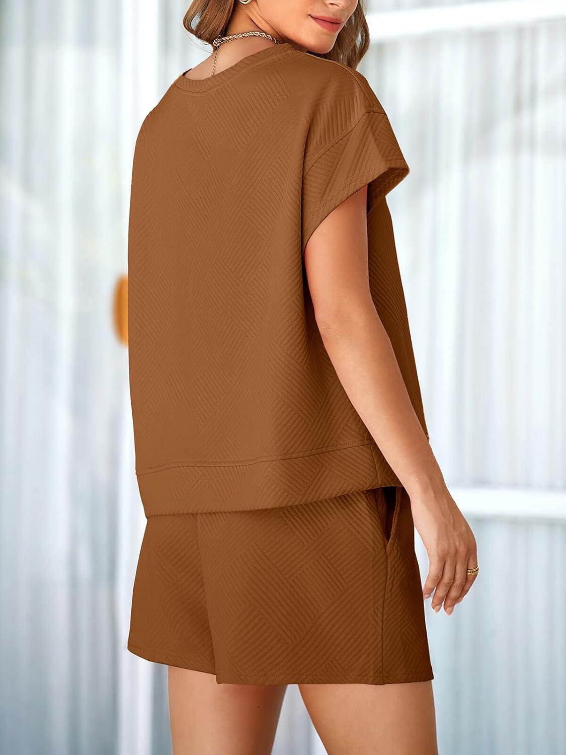 Tankaneo Womens Loungewear Set Short Sleeve Tops and Shorts 2 Piece Outfits Matching Lounge Pajama Set with Pockets(Brown)