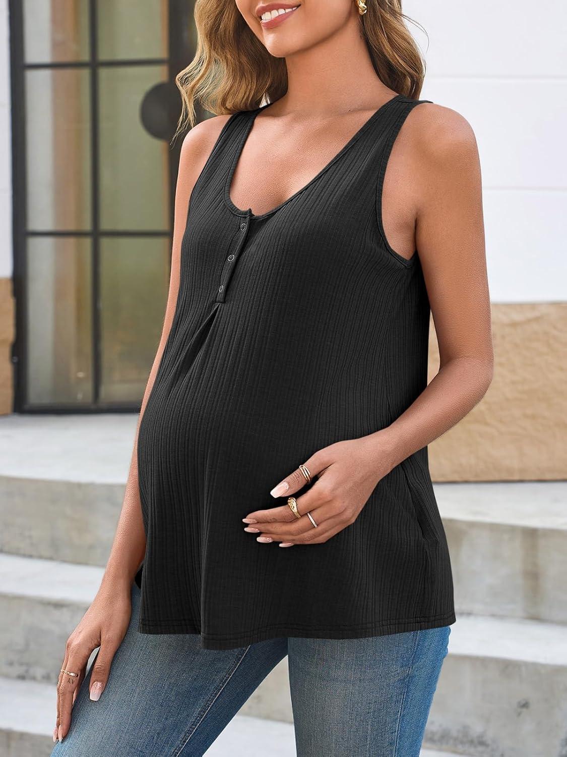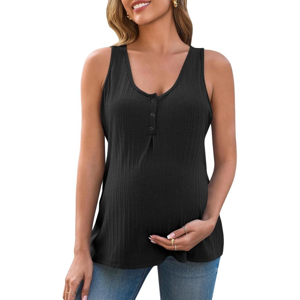 Tankaneo Womens Maternity Henley Tank Tops Summer Scoop Neck Ribbed Knit Sleeveless Shirts Casual Loose fit Pregnancy Clothes(Black)
