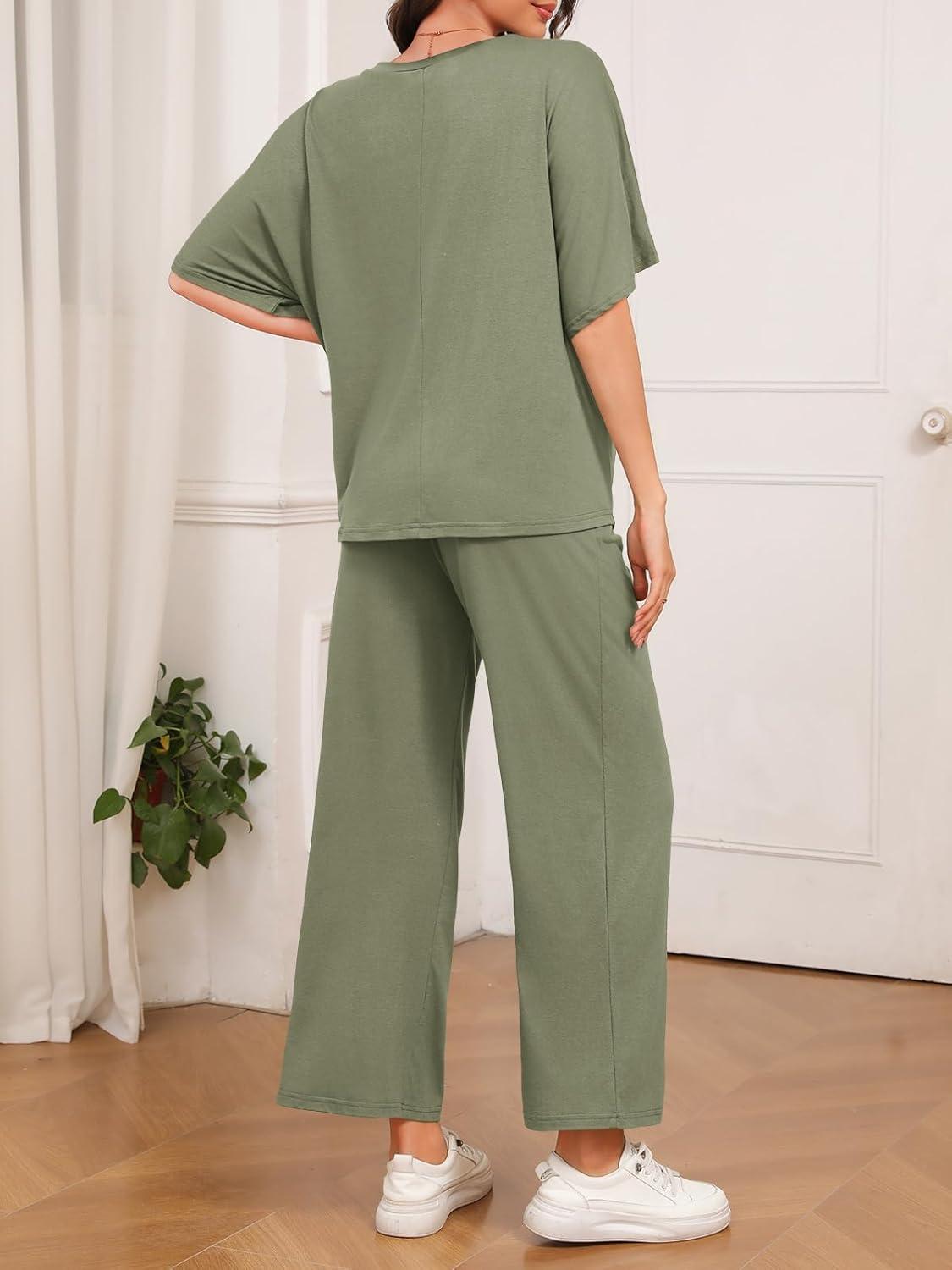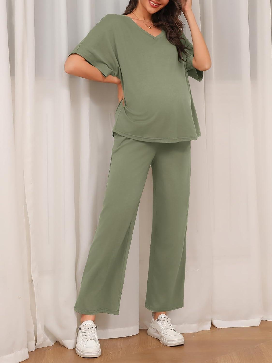 Tankaneo Womens Maternity Pajamas 2 Piece Lounge Set Soft Short Sleeve V Neck T-shirt Cropped Pants Pregnancy Loungewear(Pea Green)