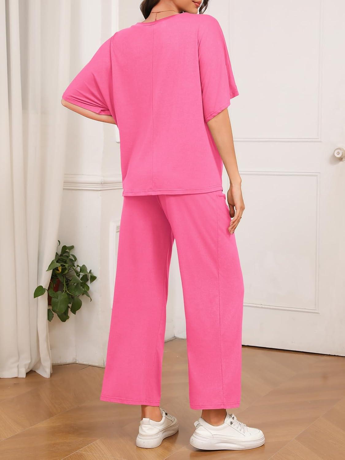 Tankaneo Womens Maternity Pajamas 2 Piece Lounge Set Soft Short Sleeve V Neck T-shirt Cropped Pants Pregnancy Loungewear(Pink)