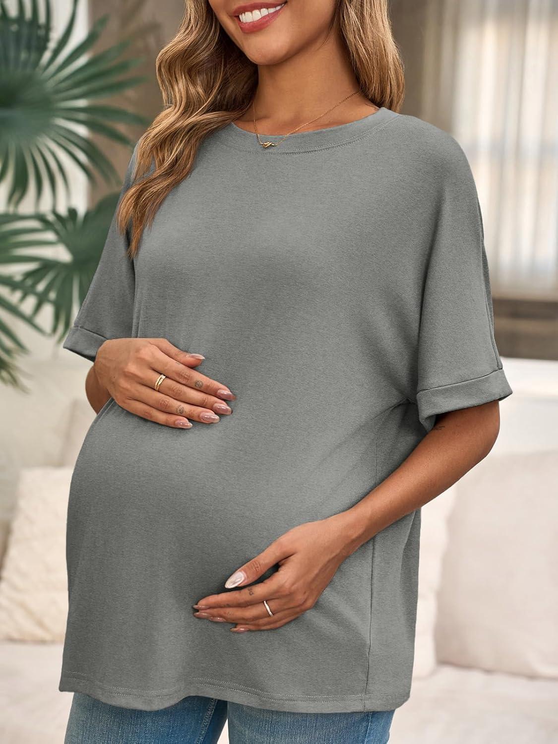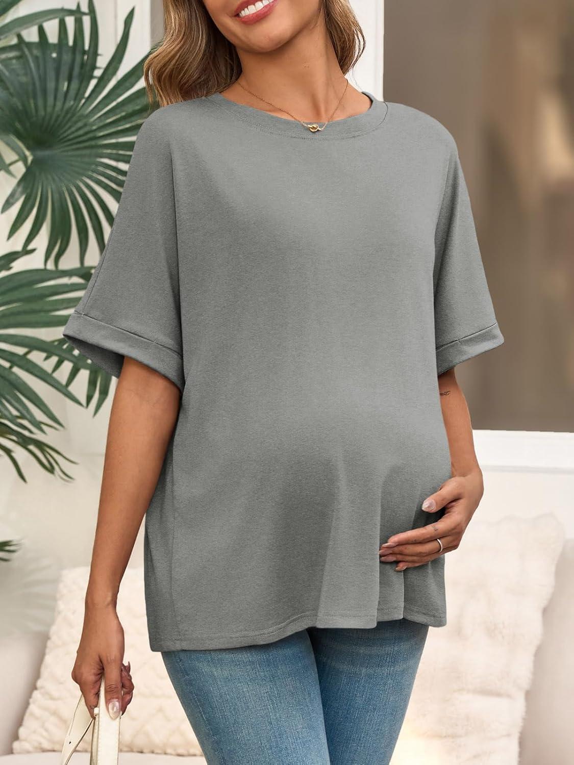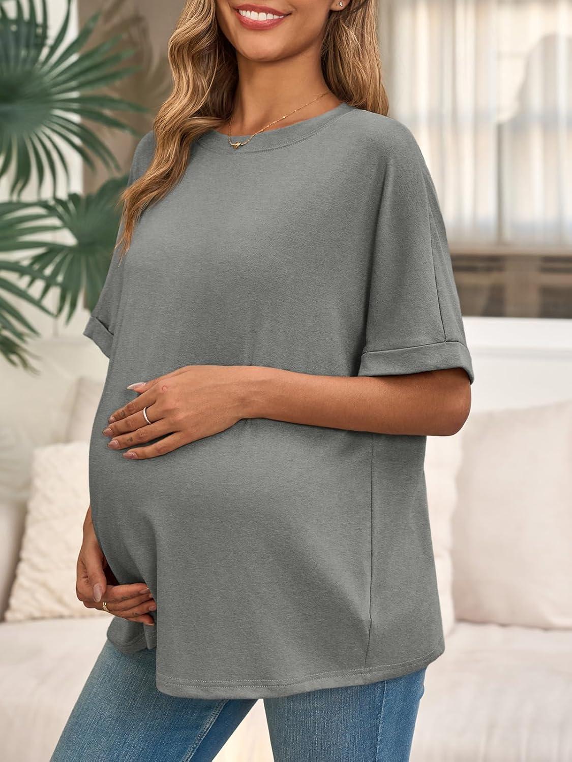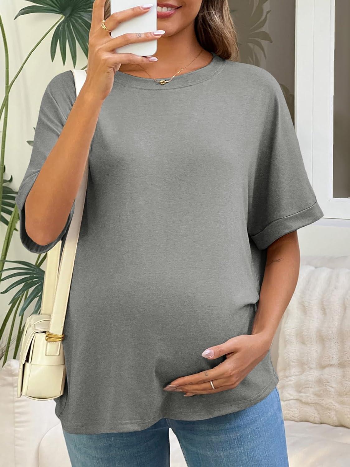 Tankaneo Womens Maternity T Shirts Oversized Short Sleeve Tunic Tops Casual Summer Loose Fit Crewneck Pregnancy Clothes(Grey)
