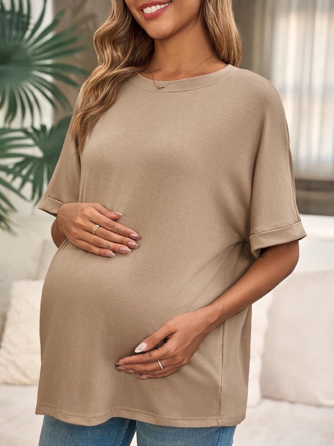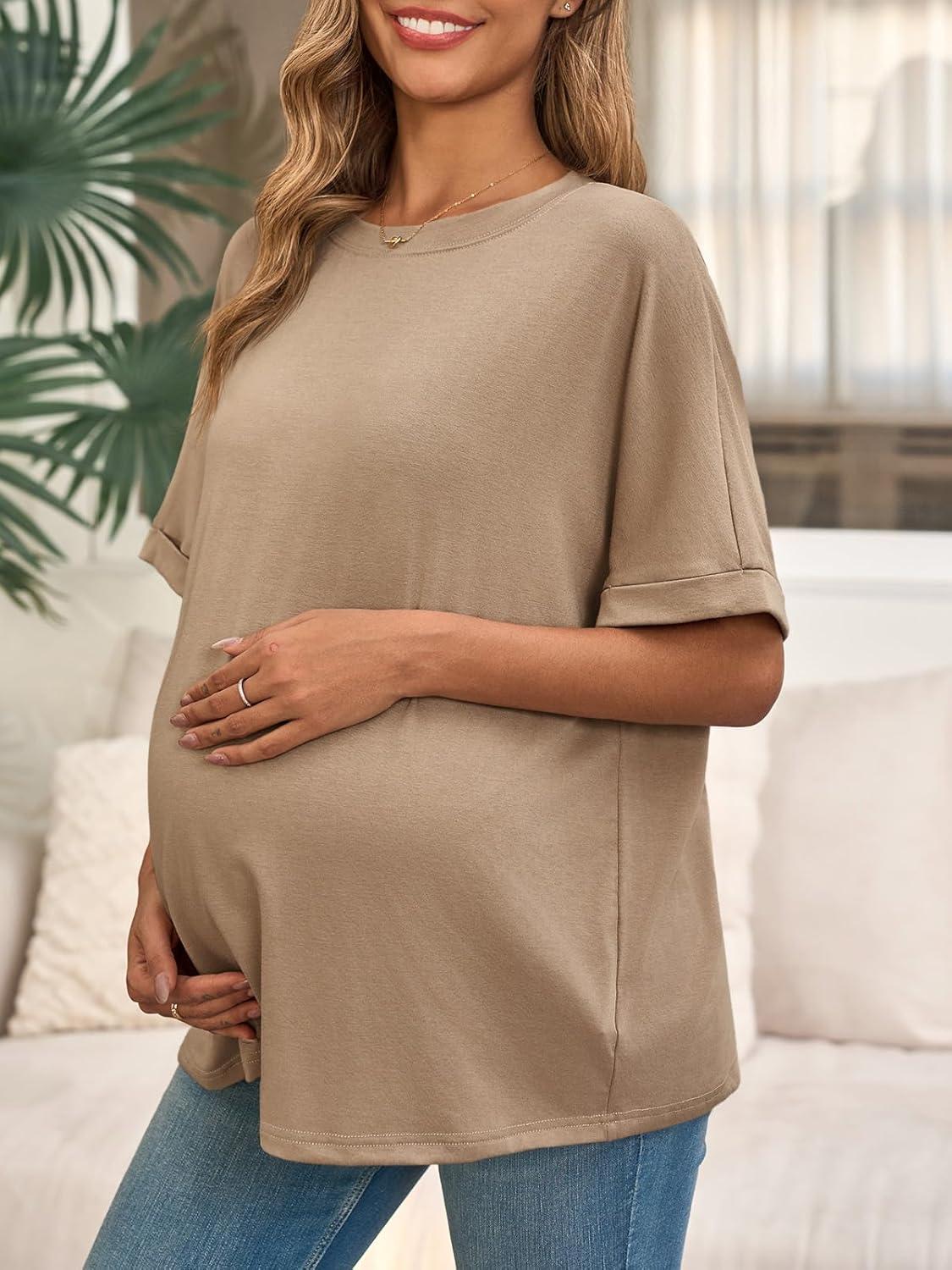 Tankaneo Womens Maternity T Shirts Oversized Short Sleeve Tunic Tops Casual Summer Loose Fit Crewneck Pregnancy Clothes(Khaki)