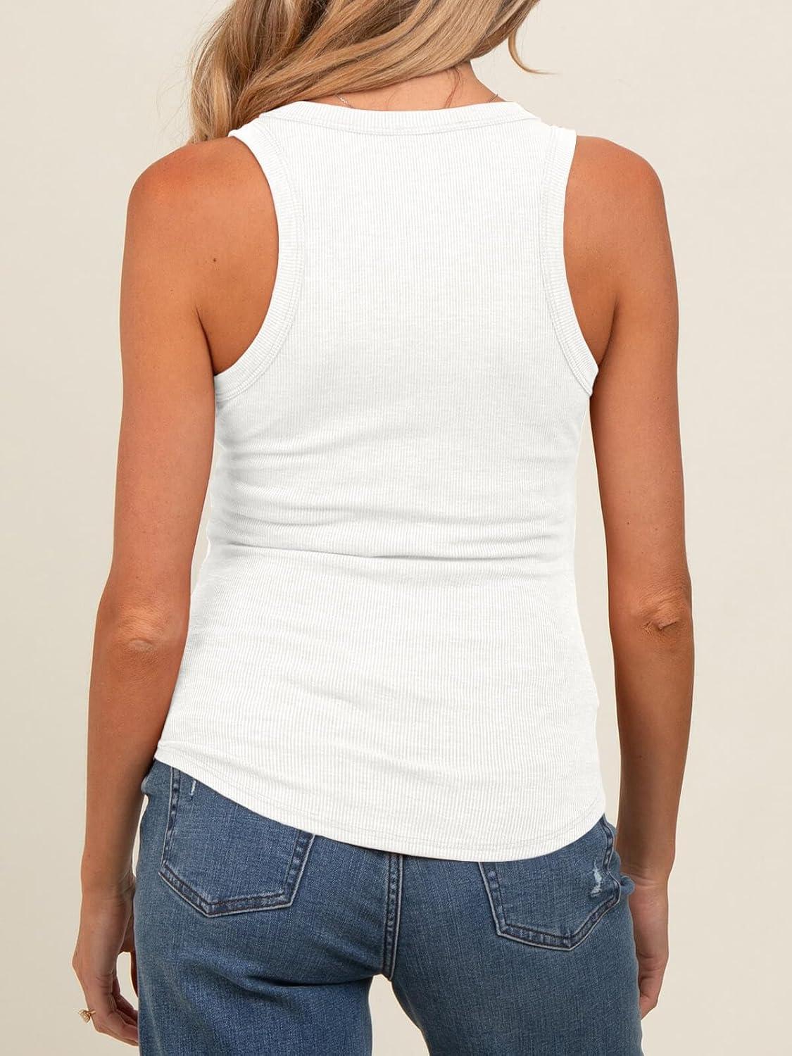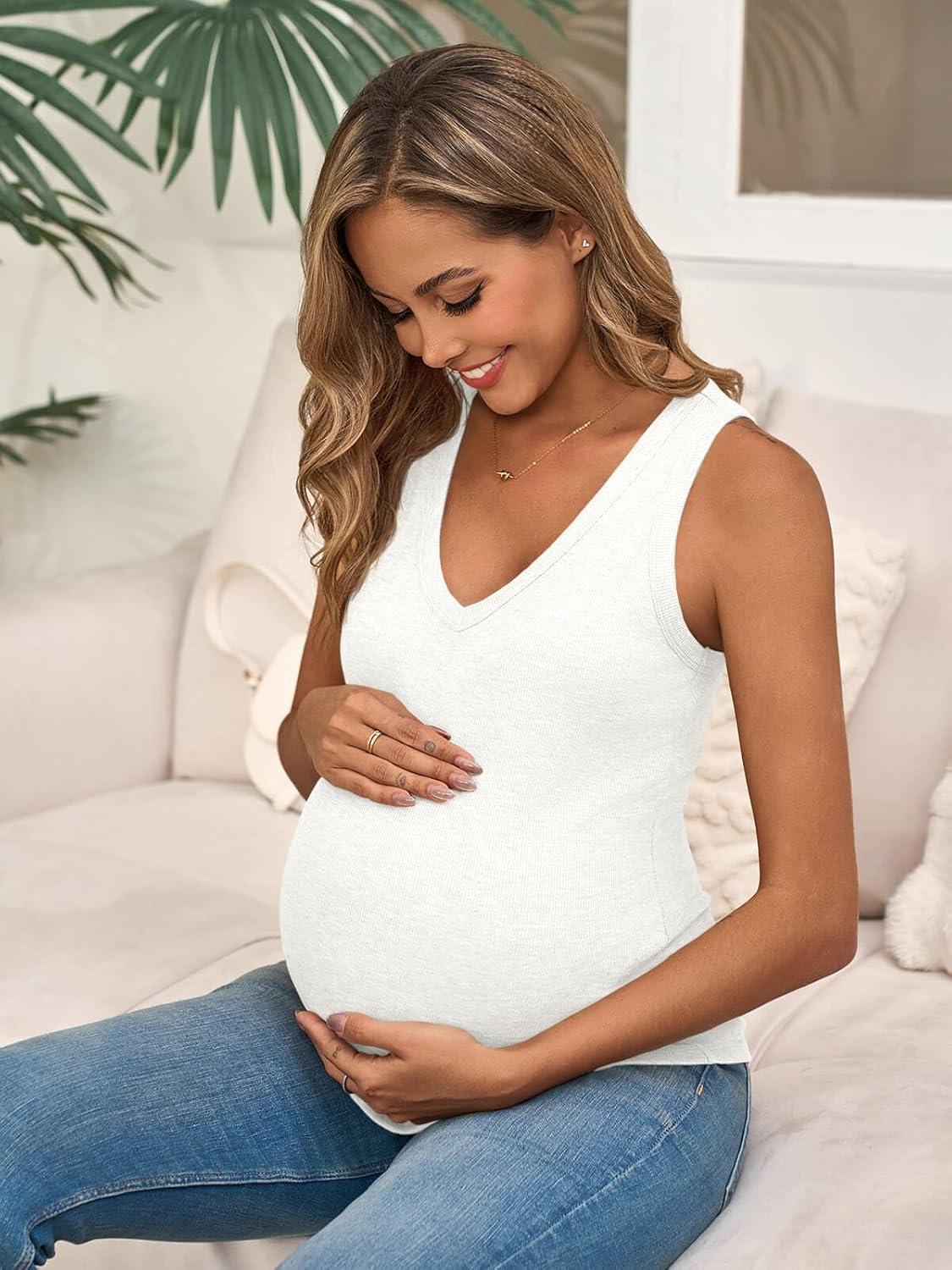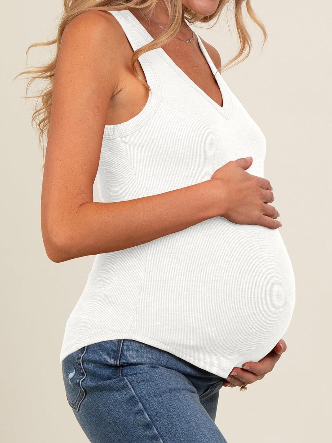 Tankaneo Womens Maternity Tank Tops Sleeveless V Neck Ribbed Knit Shirts Fitted Summer Casual Curved Hem Pregnancy Clothes(White)