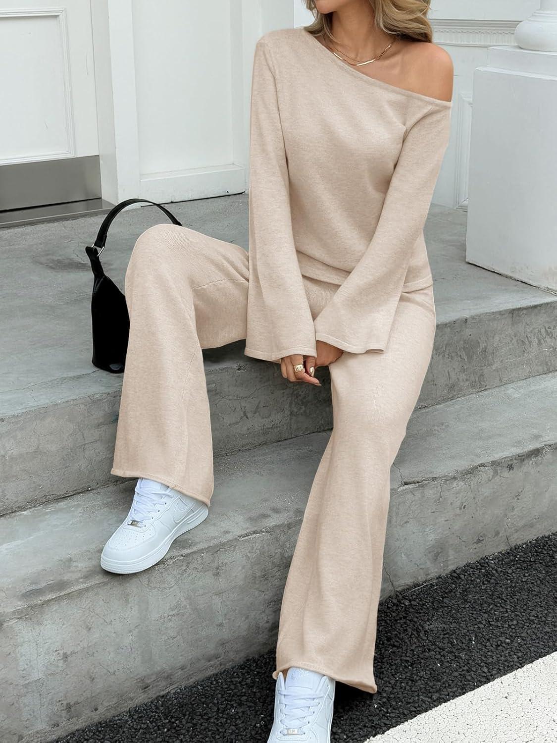 Tankaneo Womens Off the Shoulder 2 Piece Outfits Sweater Sets Bell Sleeve Tops Pants Casual Trendy Matching Lounge Sets(Beige)