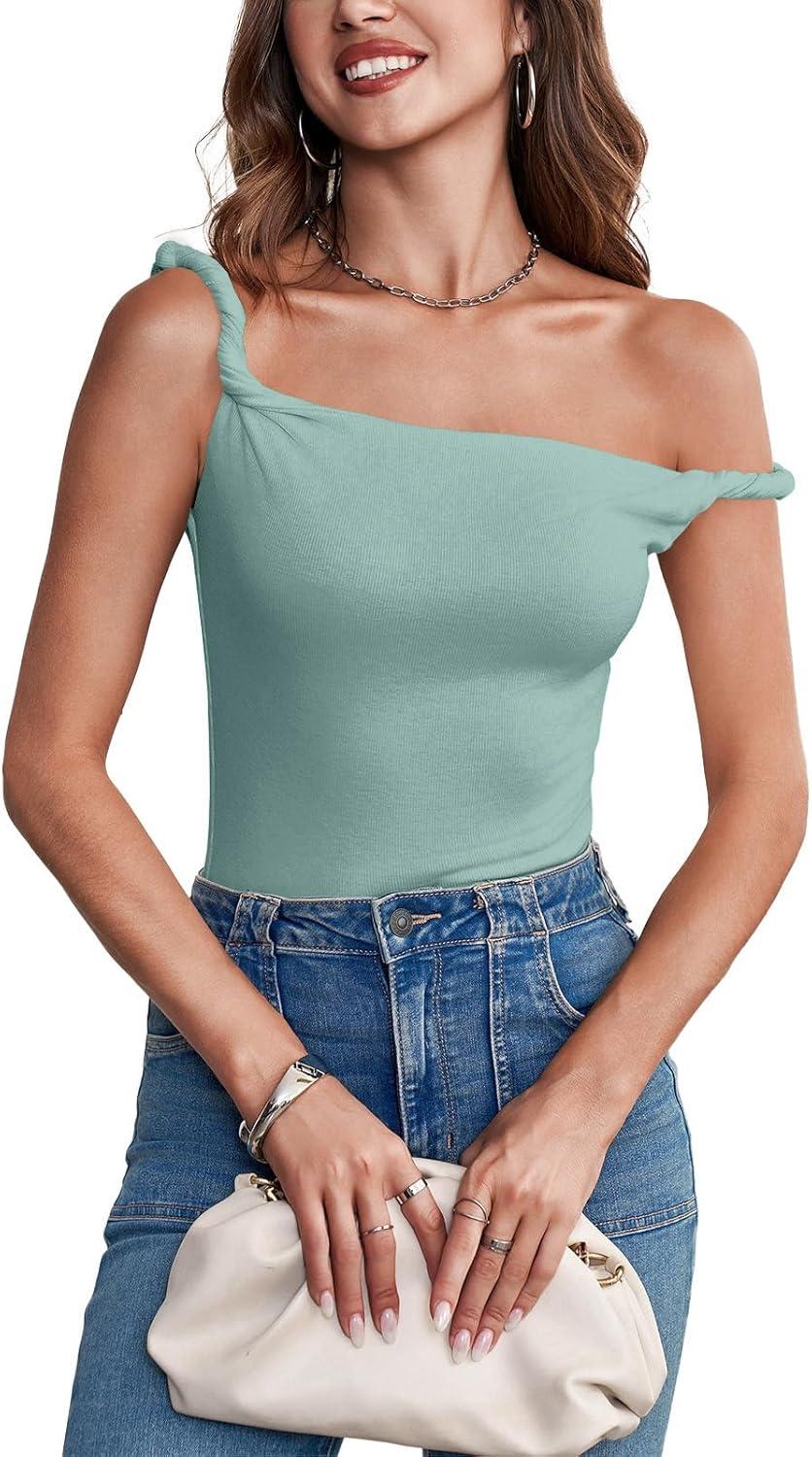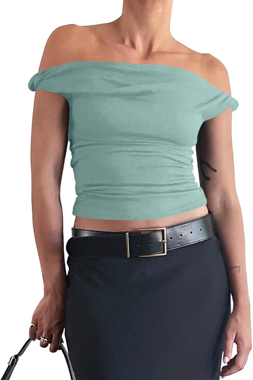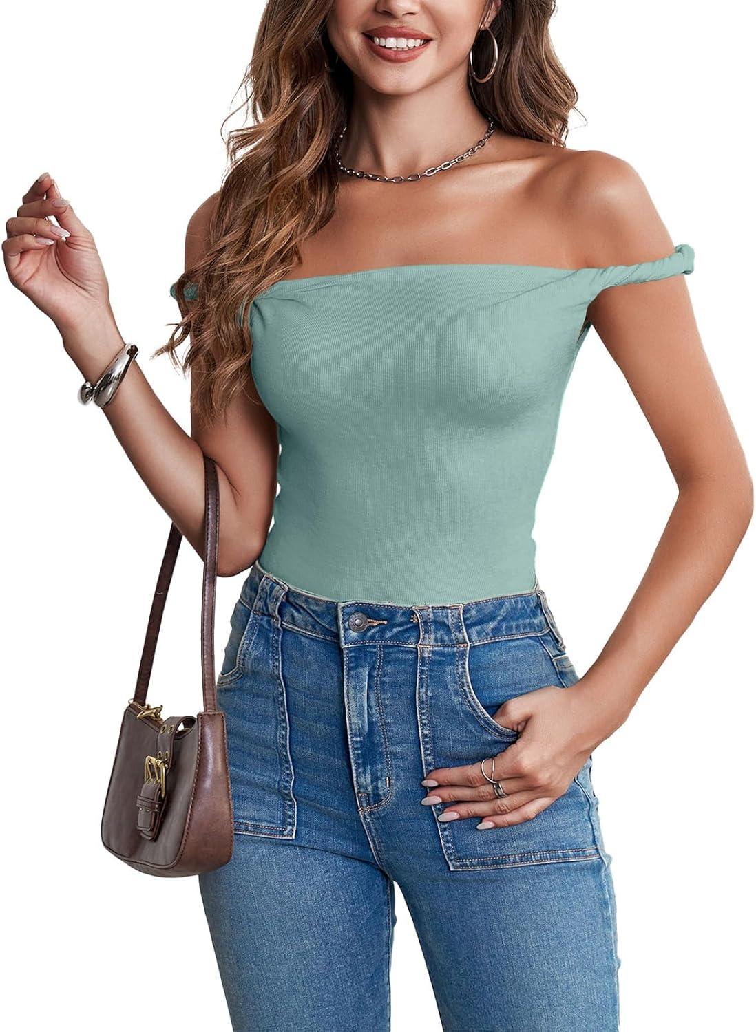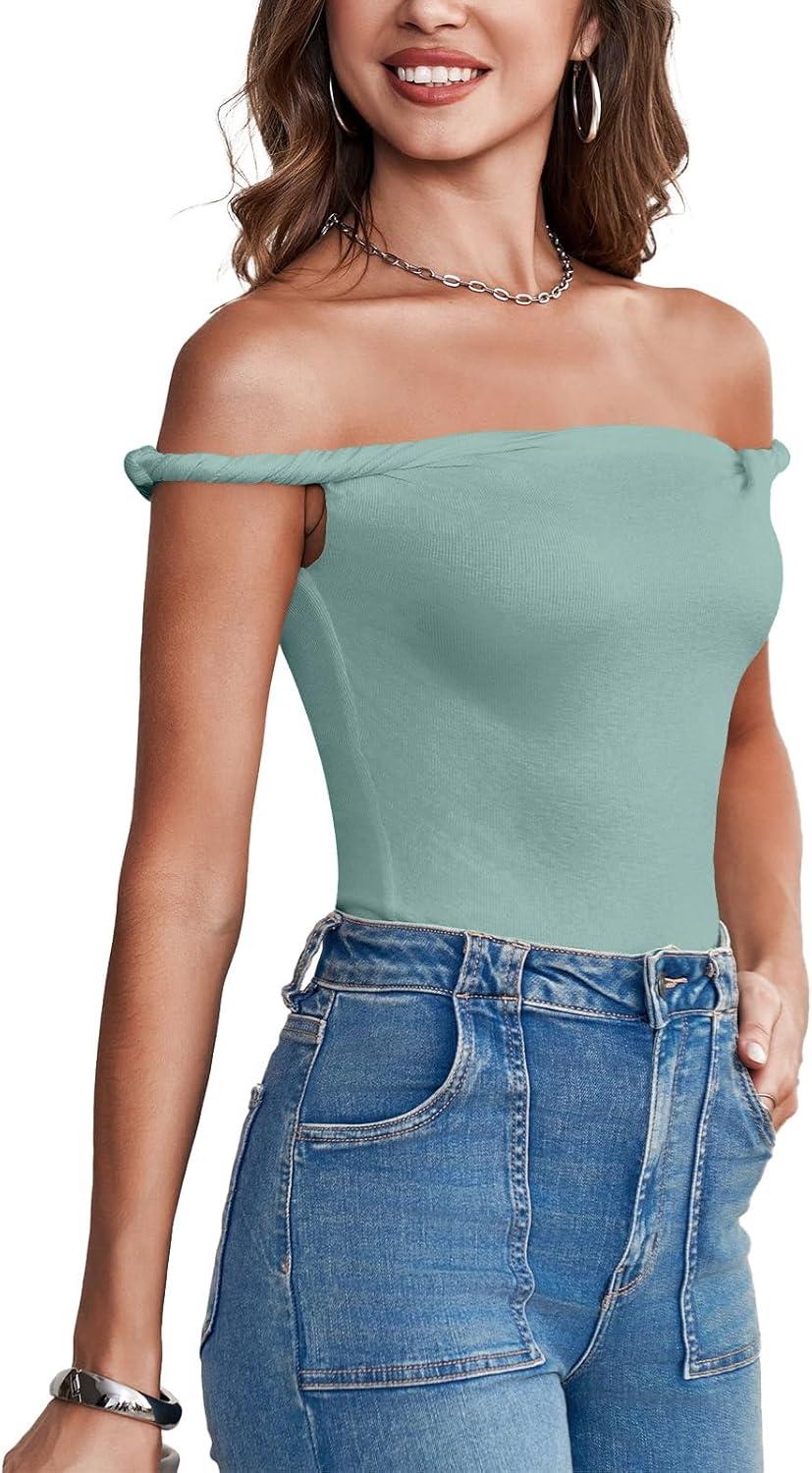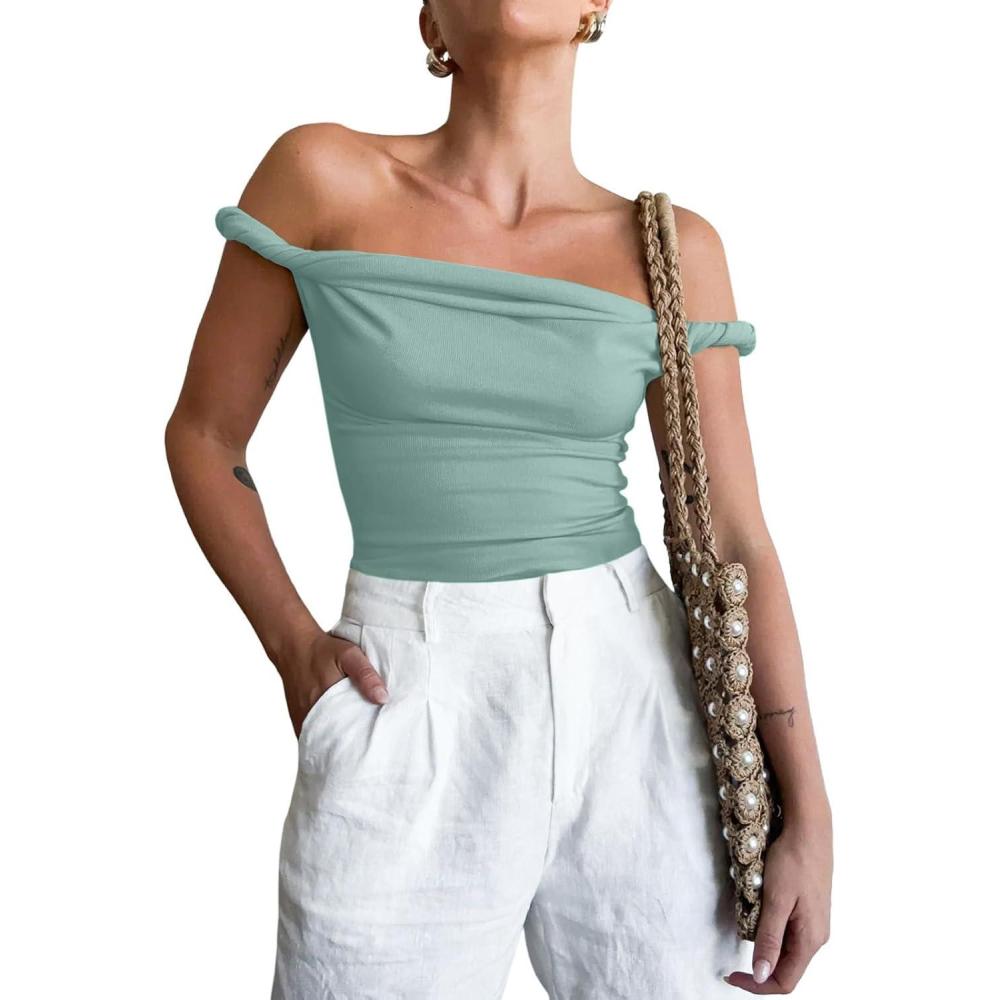 Tankaneo Womens Off The Shoulder Top Sleeveless Slim Fit Stretchy Tank Top Y2k Casual T Shirts(Blue Green)