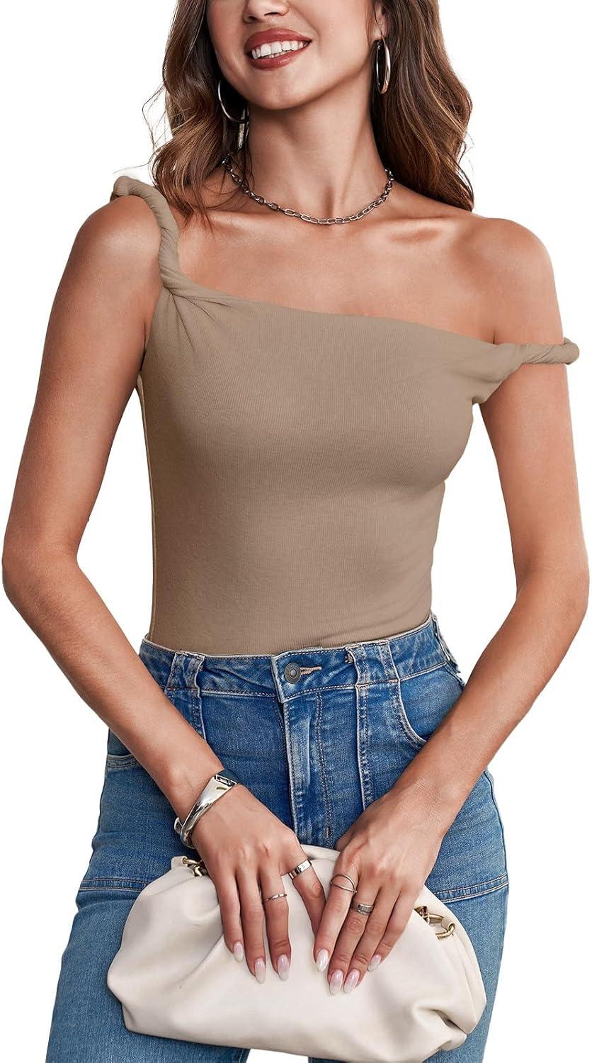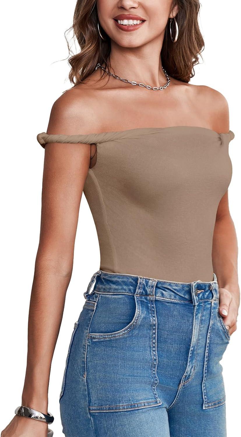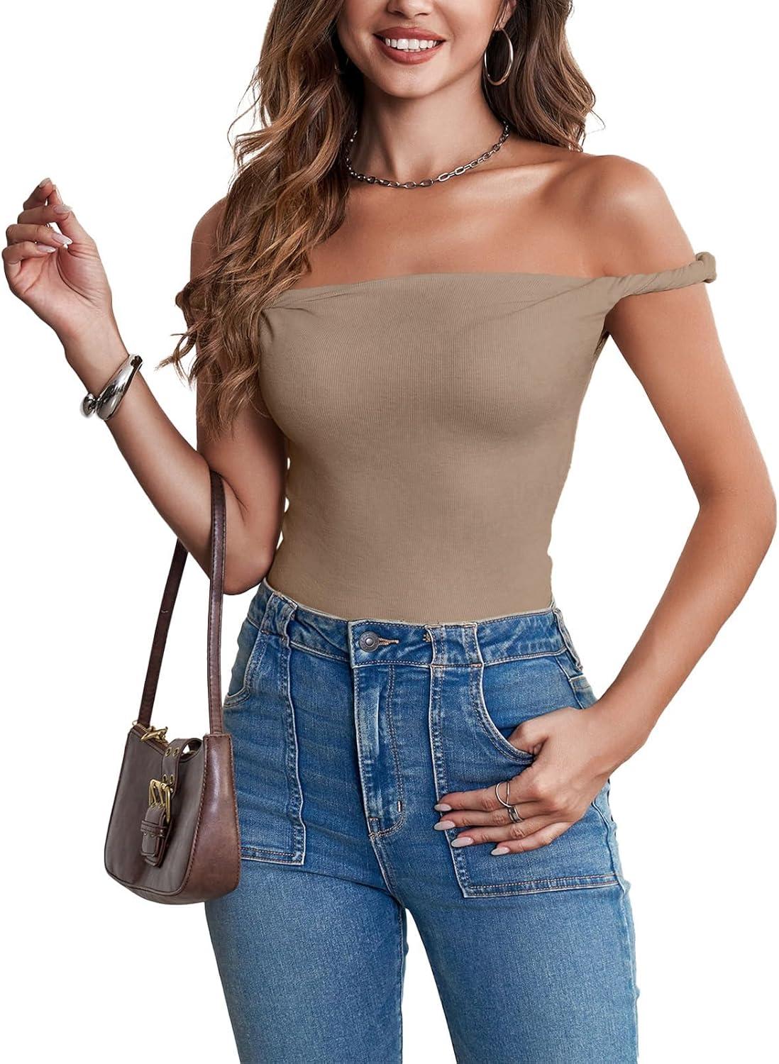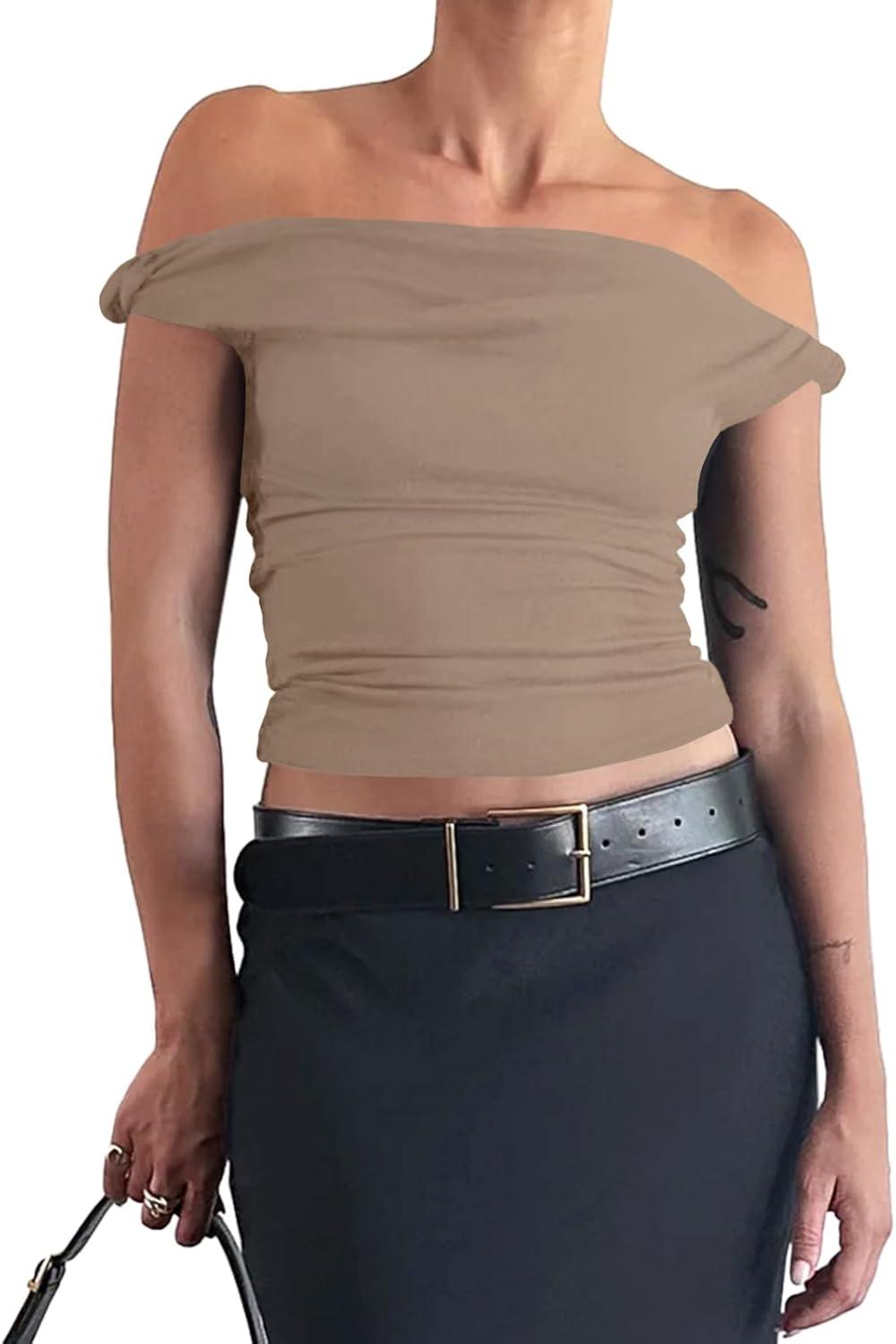 Tankaneo Womens Off The Shoulder Top Sleeveless Slim Fit Stretchy Tank Top Y2k Casual T Shirts(Khaki)