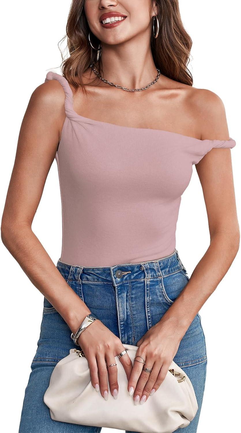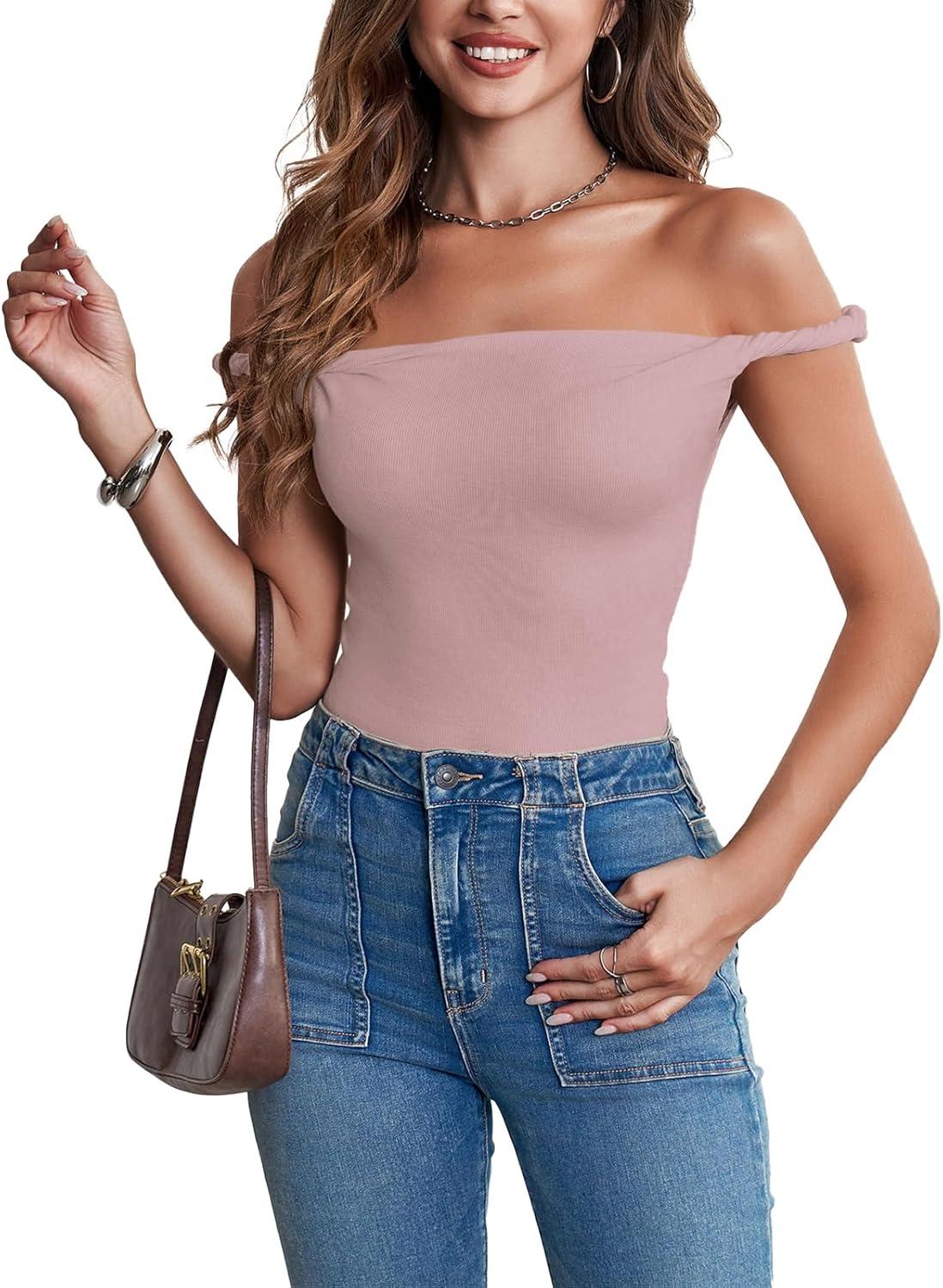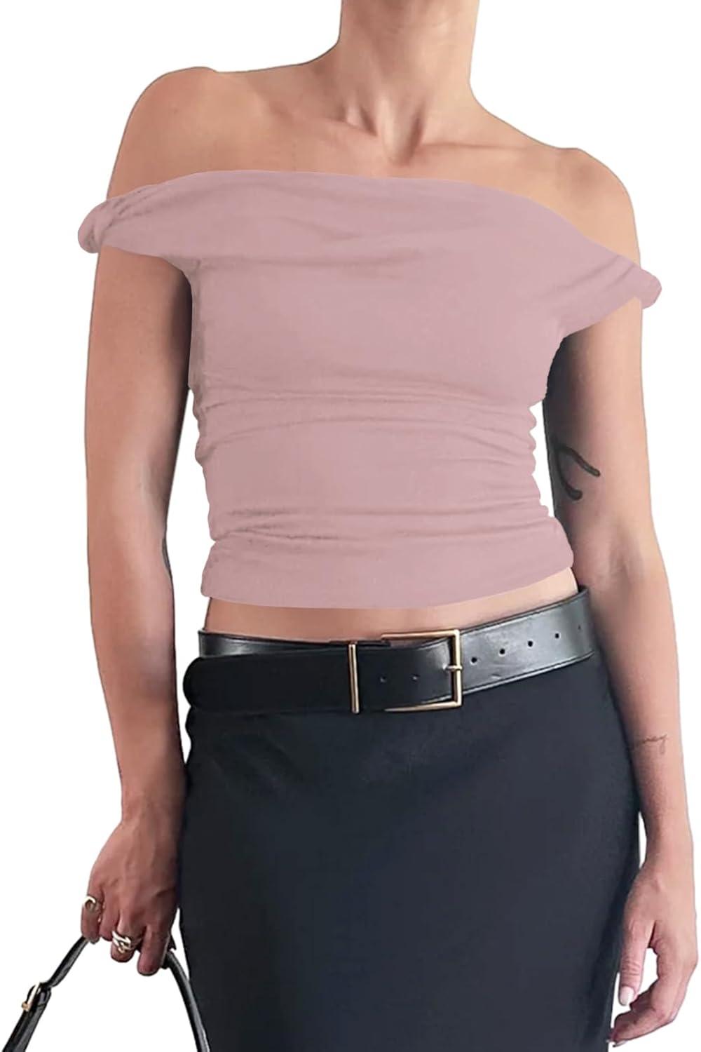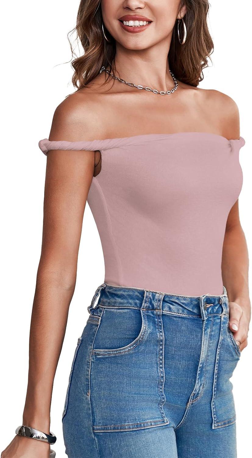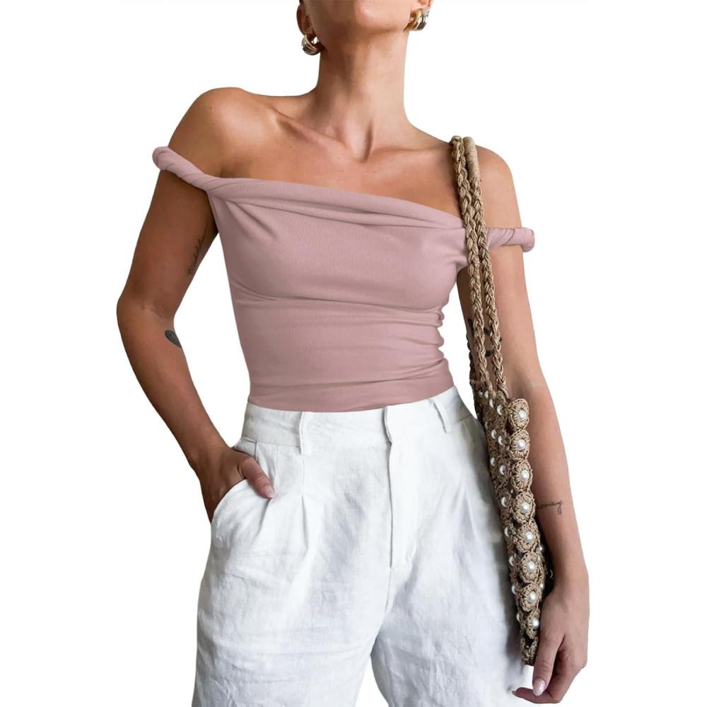 Tankaneo Womens Off The Shoulder Top Sleeveless Slim Fit Stretchy Tank Top Y2k Casual T Shirts(Pink)
