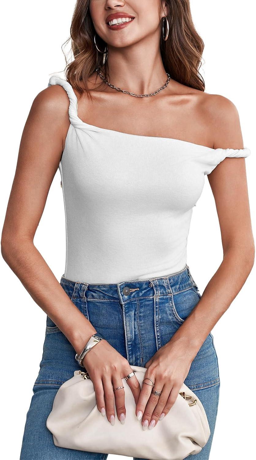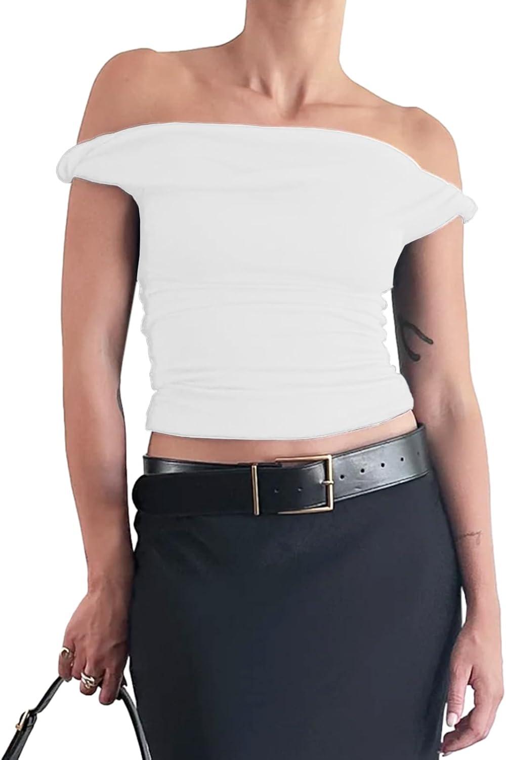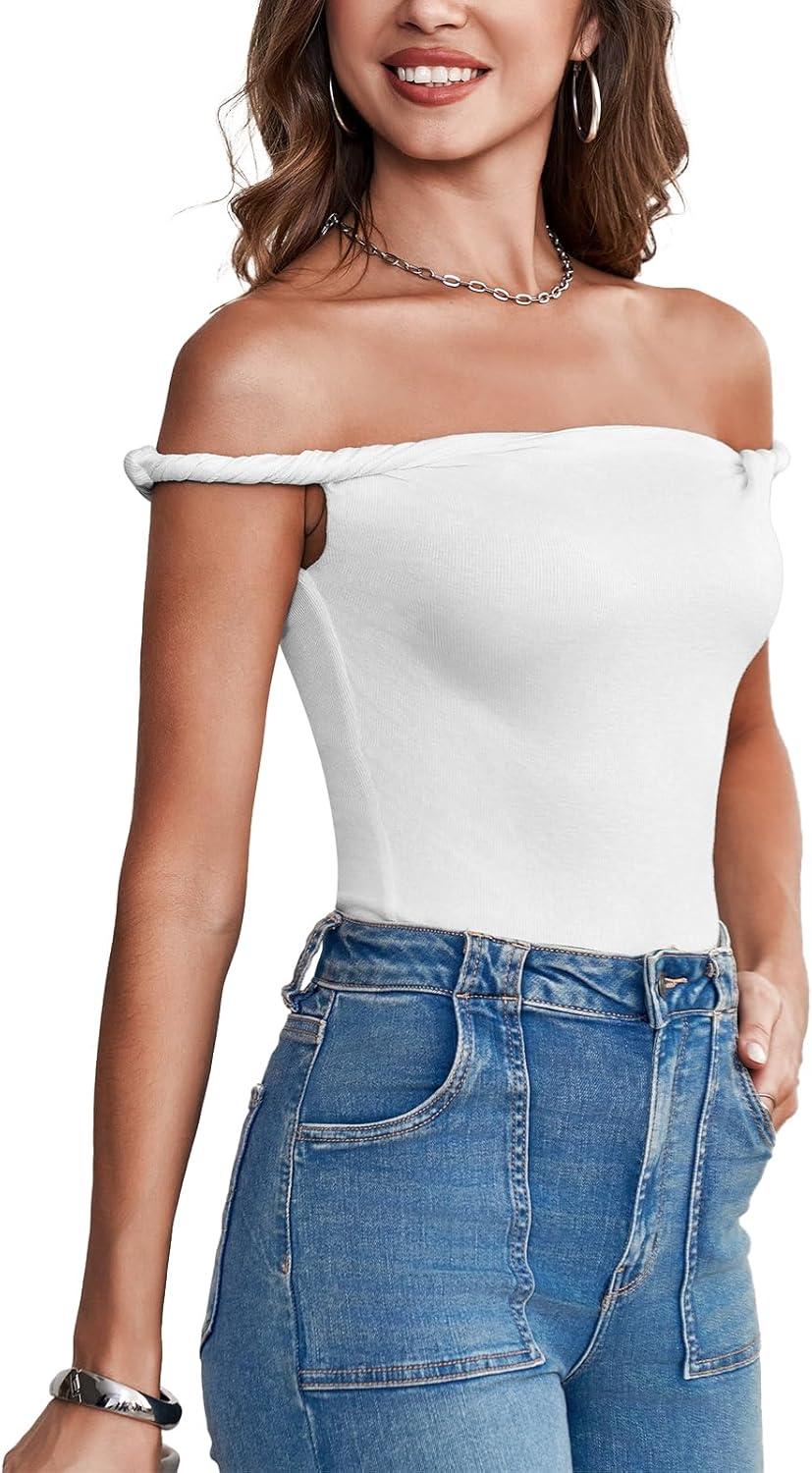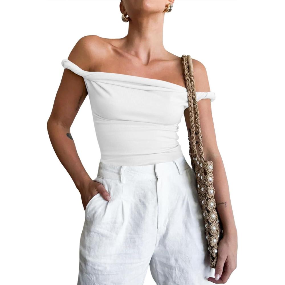 Tankaneo Womens Off The Shoulder Top Sleeveless Slim Fit Stretchy Tank Top Y2k Casual T Shirts(White)