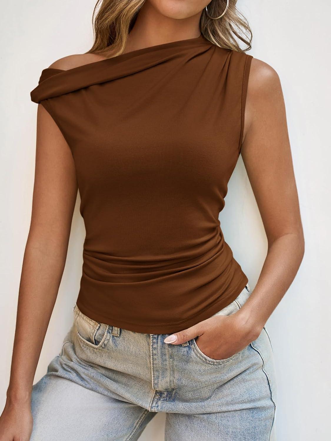 Tankaneo Womens Off The Shoulder Tops Boat Neck Fitted Ruched Shirt Summer Trendy Y2K Going Out Tank Tops(Brown)