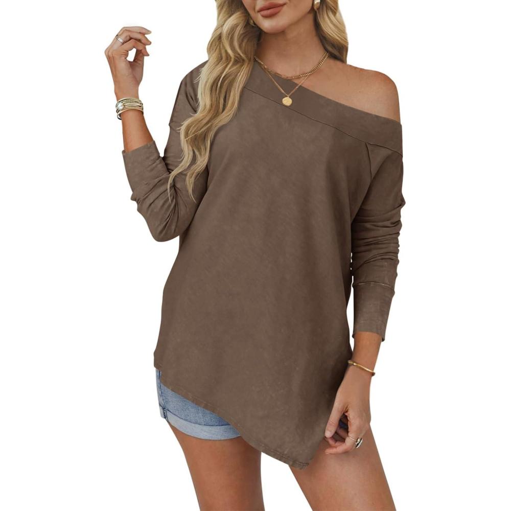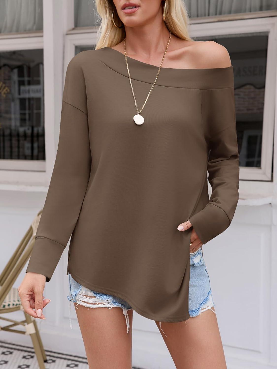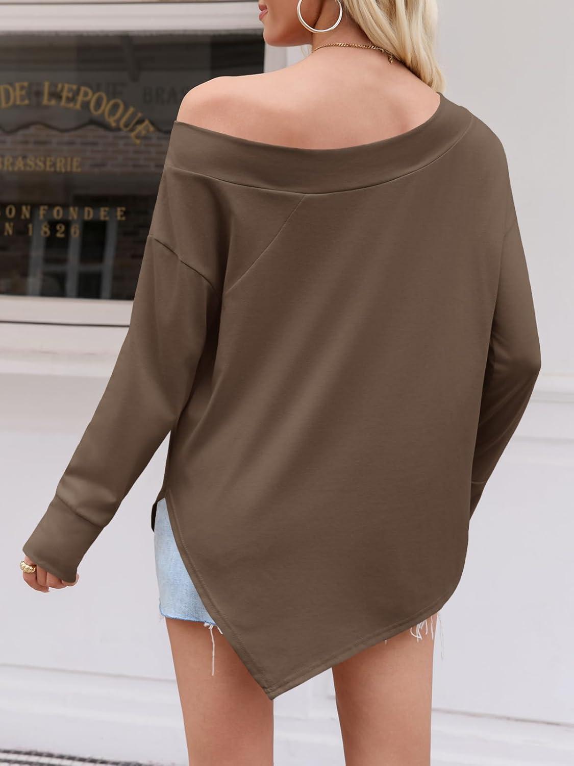 Tankaneo Womens Off The Shoulder Tops Casual Long Sleeve T Shirts Irregular Hem Split Tunics Loose Fall Blouse Shirt(Brown)