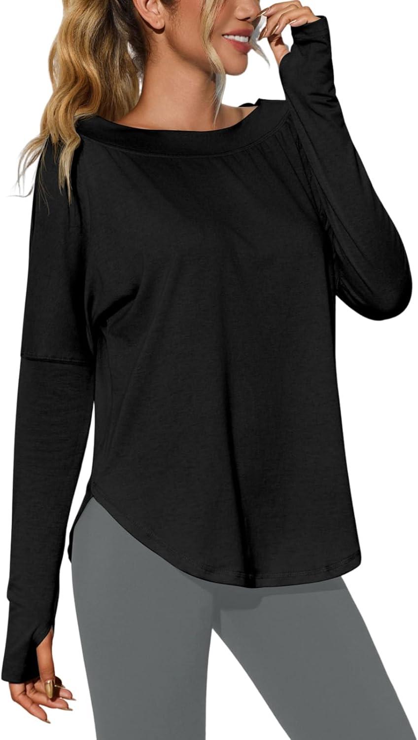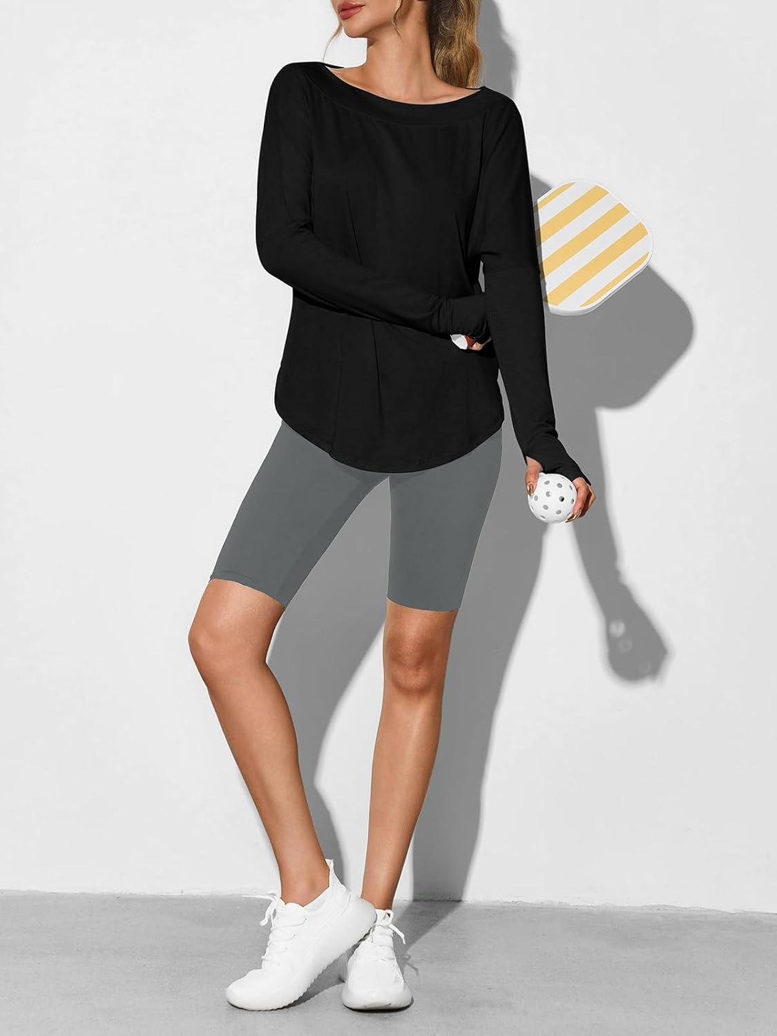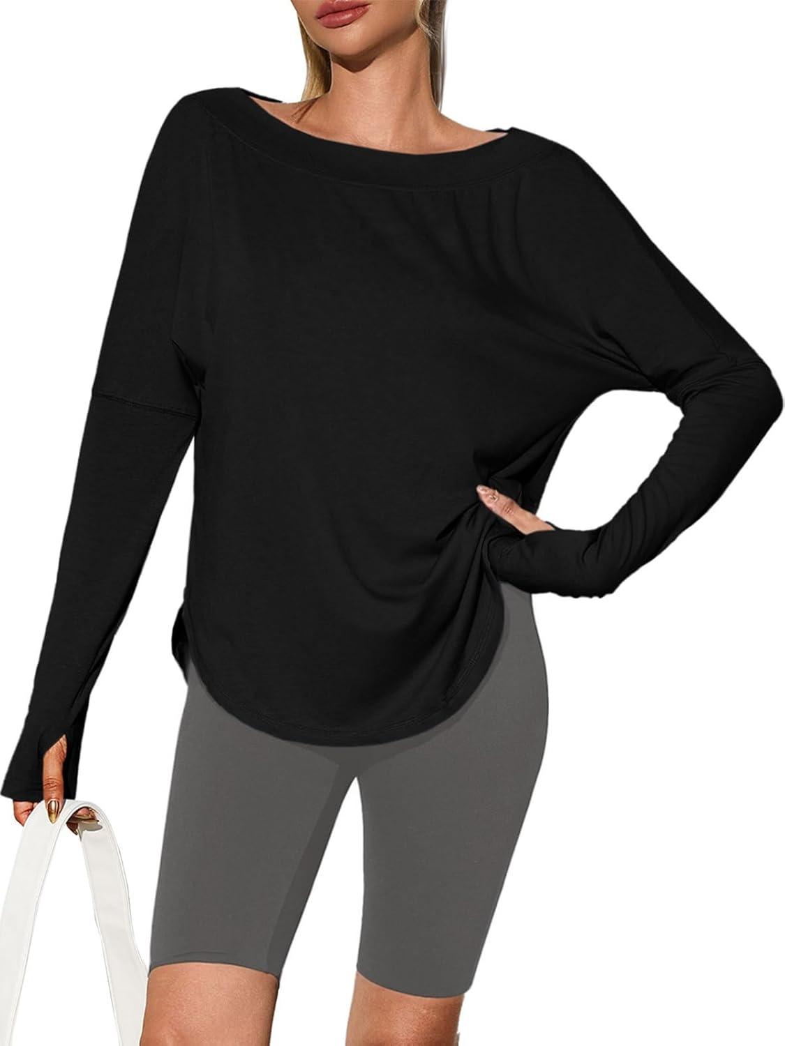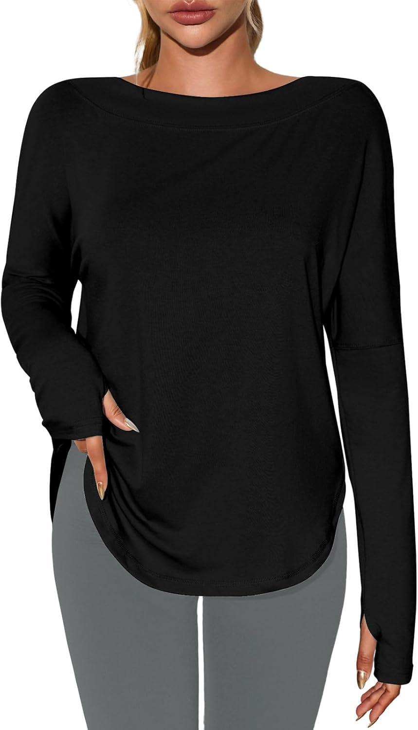 Tankaneo Womens Open Back Workout Shirts Casual Long Sleeve Boat Neck Tops Athletic Gym Yoga Tees with Thumb Holes(Black)