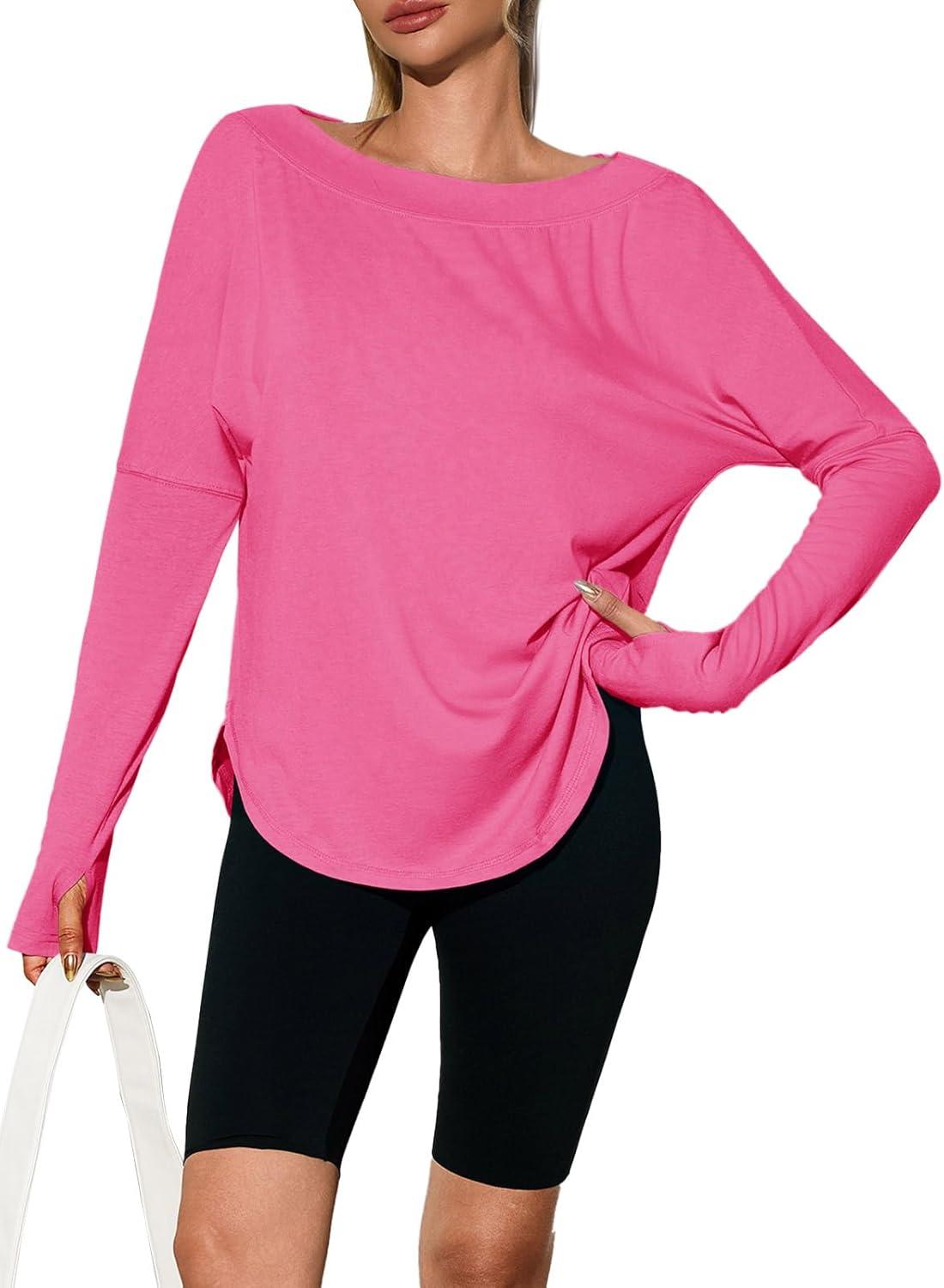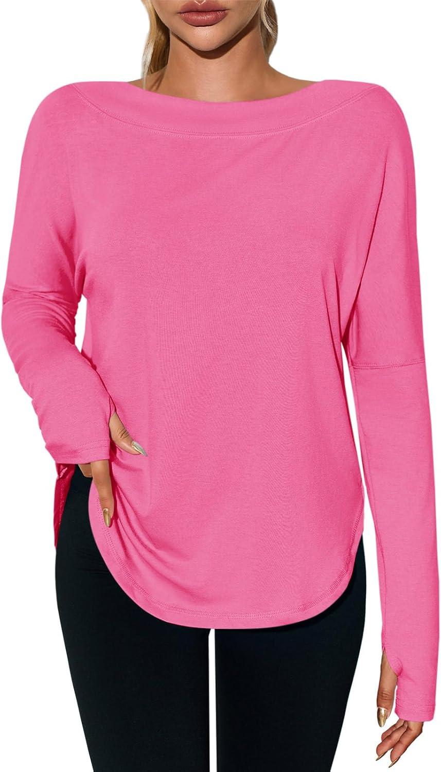 Tankaneo Womens Open Back Workout Shirts Casual Long Sleeve Boat Neck Tops Athletic Gym Yoga Tees with Thumb Holes(Pink)