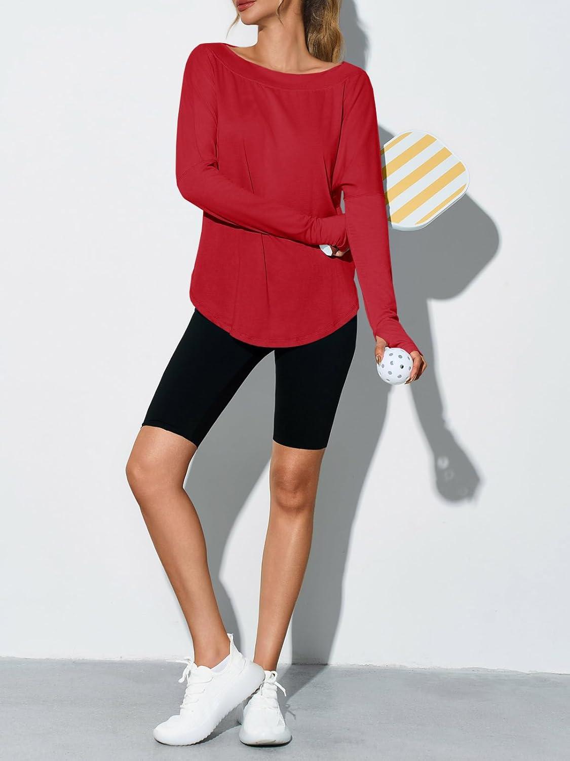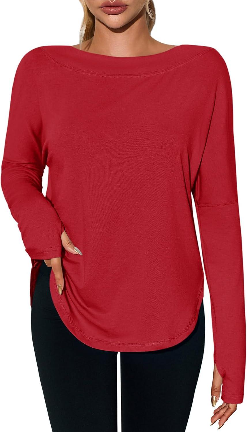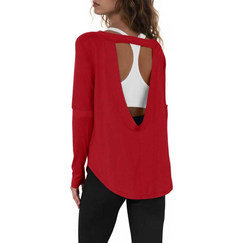 Tankaneo Womens Open Back Workout Shirts Casual Long Sleeve Boat Neck Tops Athletic Gym Yoga Tees with Thumb Holes(Red)