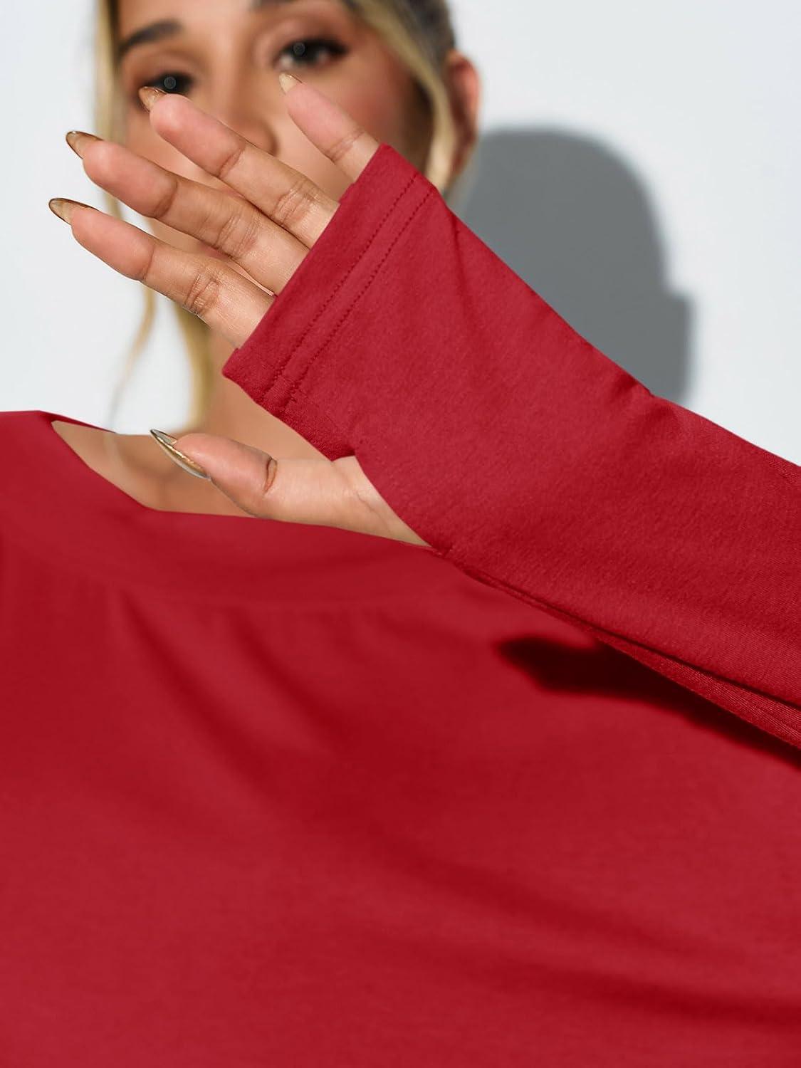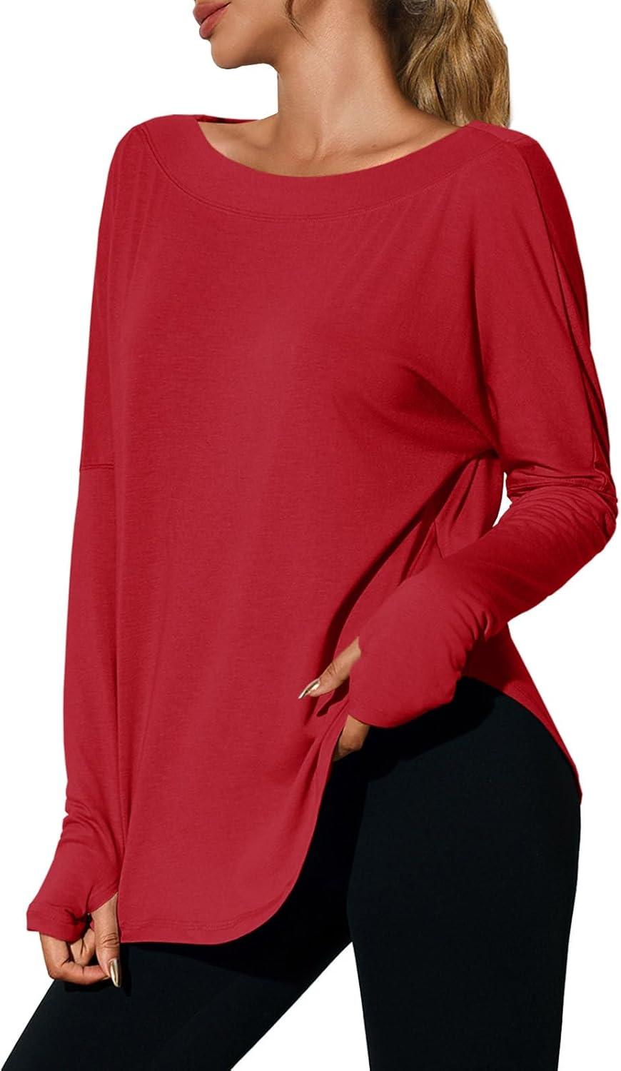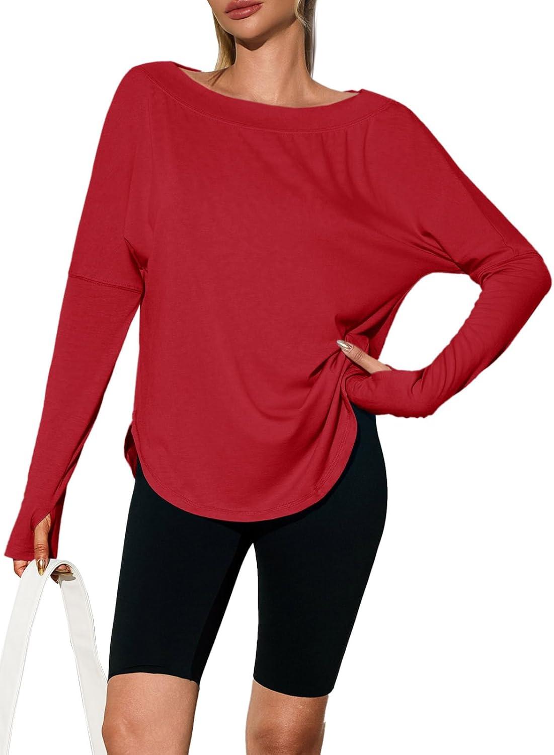 Tankaneo Womens Open Back Workout Shirts Casual Long Sleeve Boat Neck Tops Athletic Gym Yoga Tees with Thumb Holes(Red)