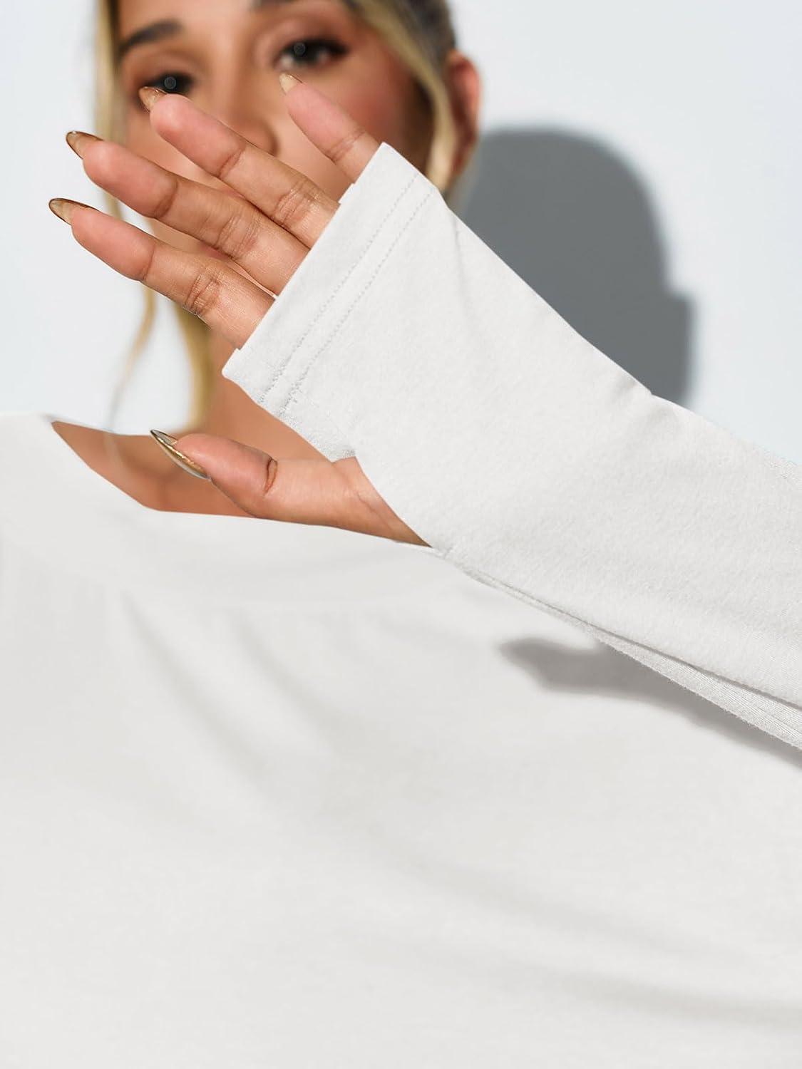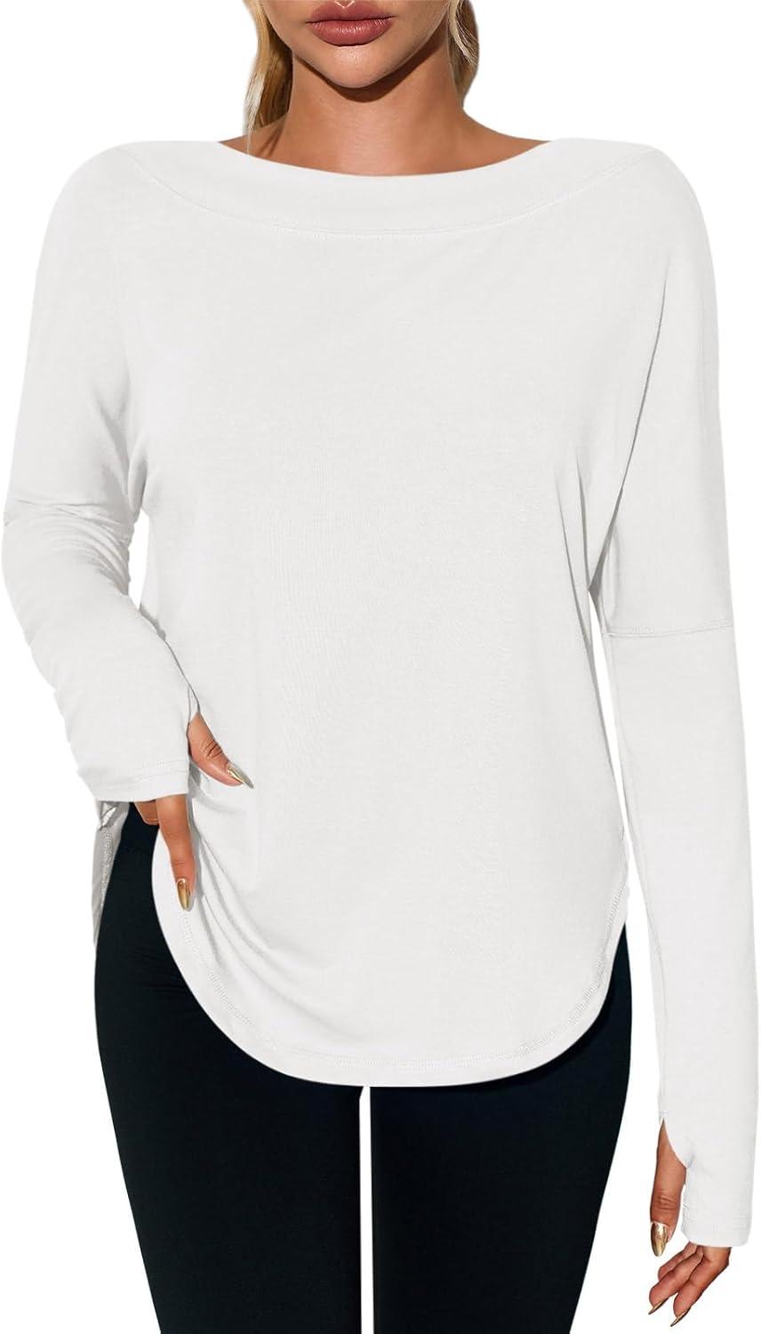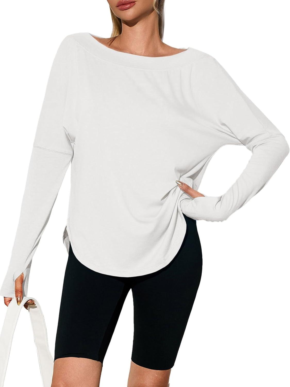 Tankaneo Womens Open Back Workout Shirts Casual Long Sleeve Boat Neck Tops Athletic Gym Yoga Tees with Thumb Holes(White)