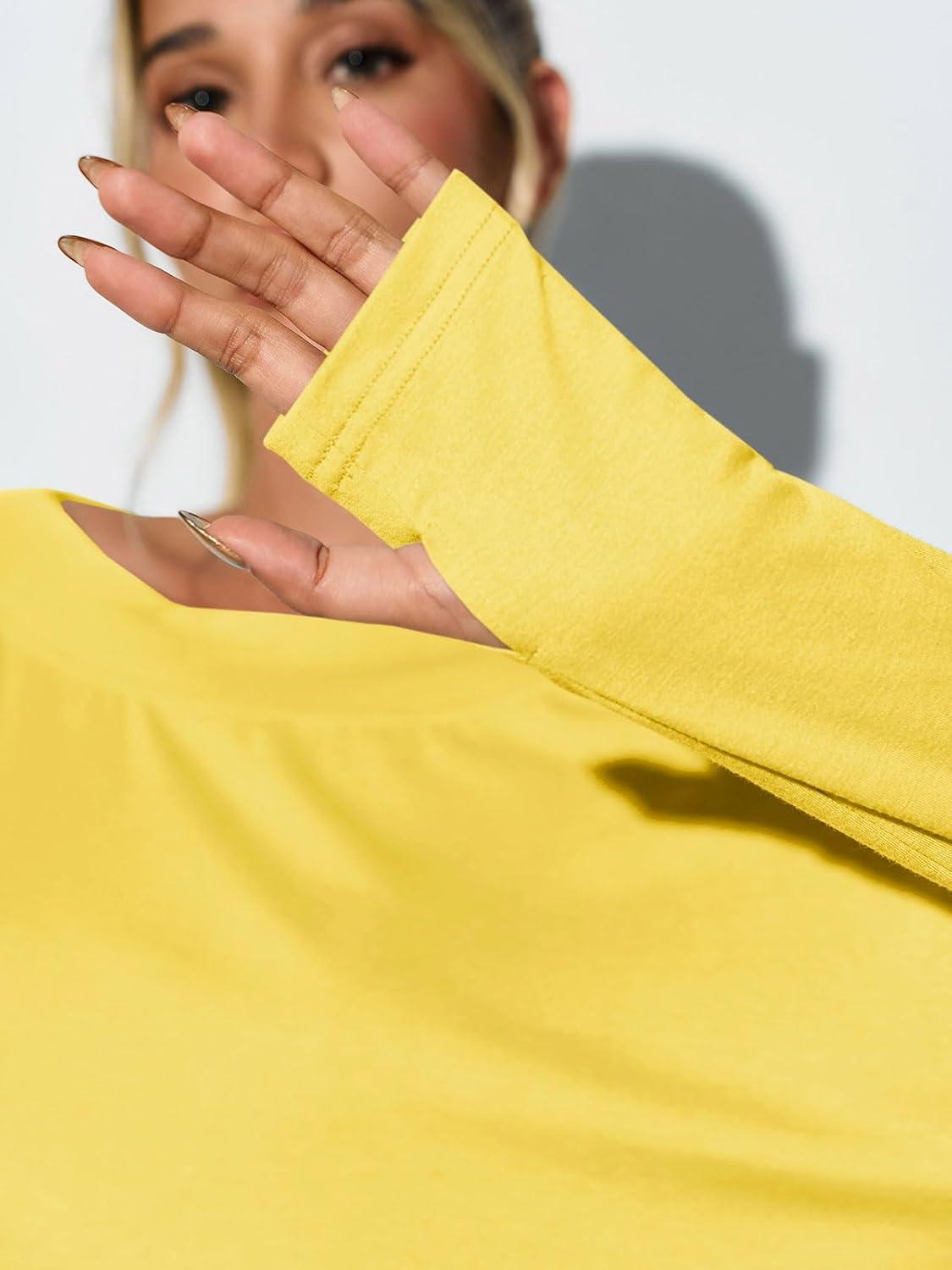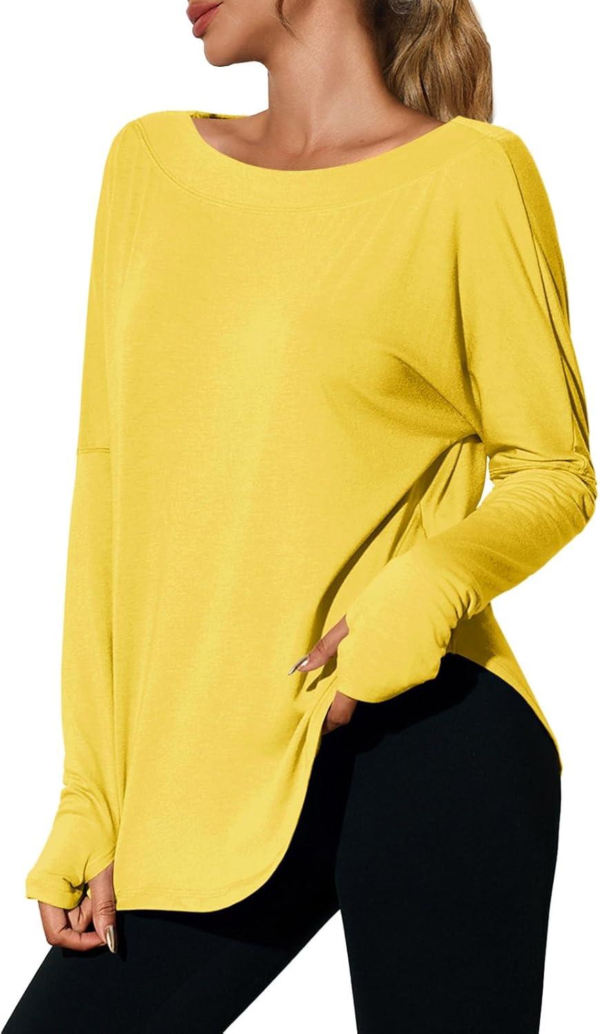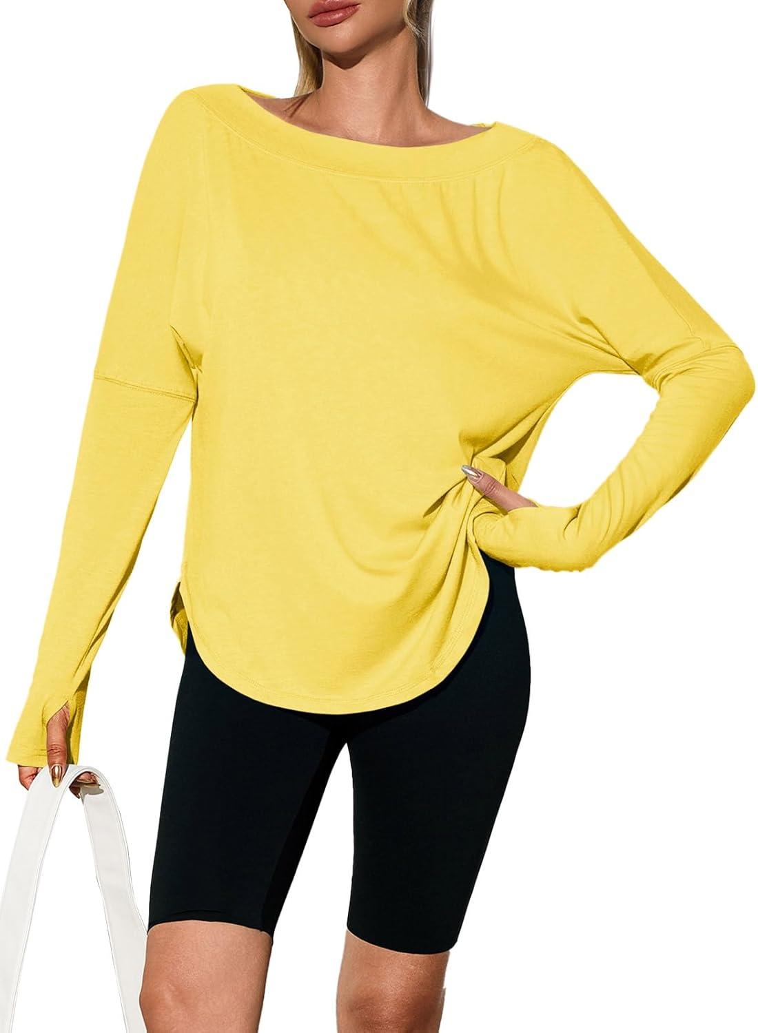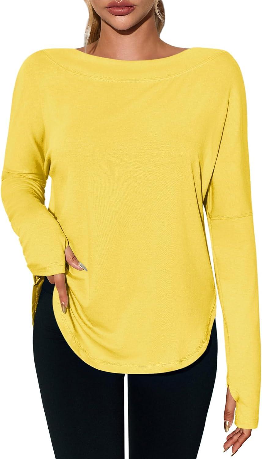 Tankaneo Womens Open Back Workout Shirts Casual Long Sleeve Boat Neck Tops Athletic Gym Yoga Tees with Thumb Holes(Yellow)