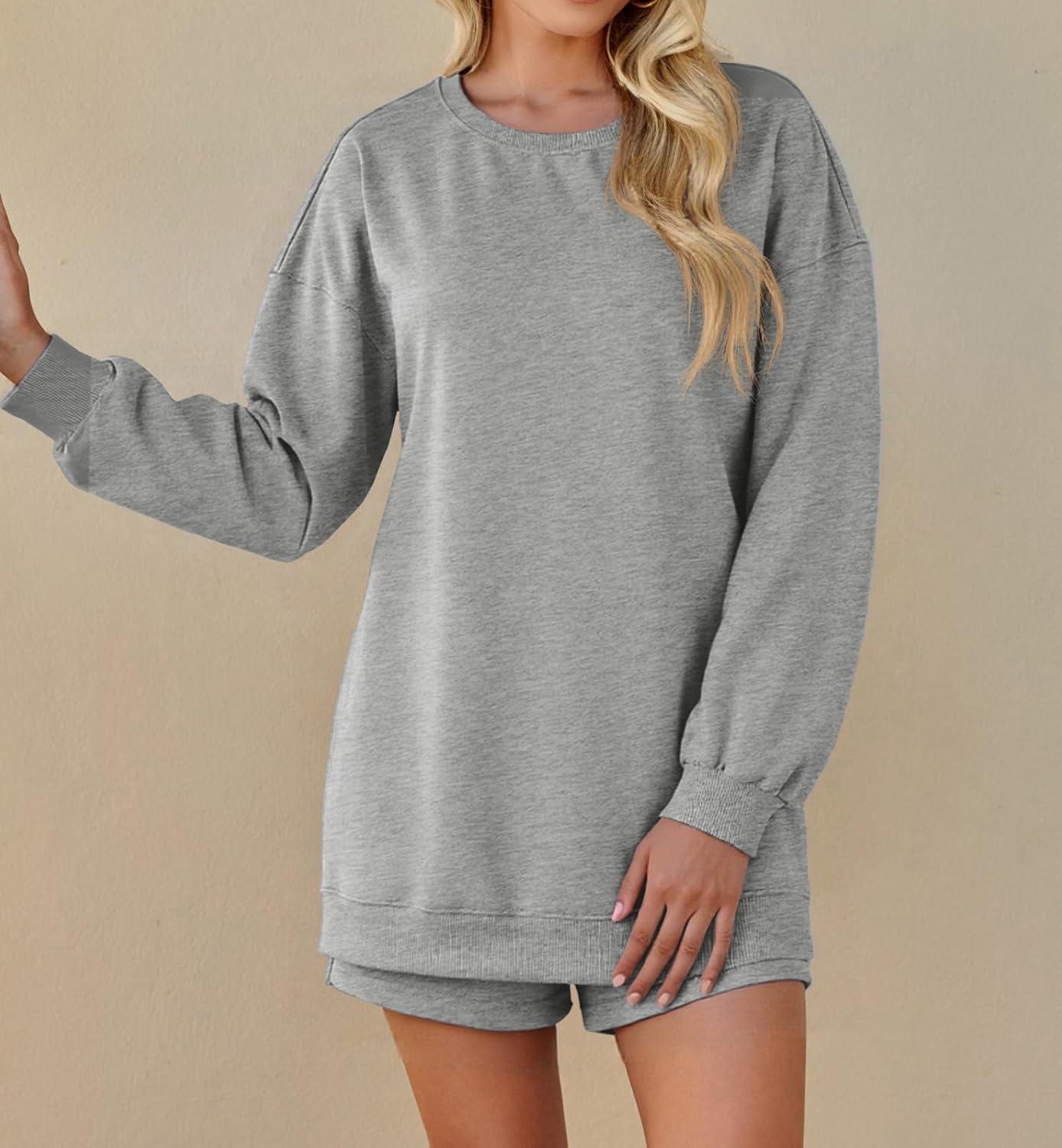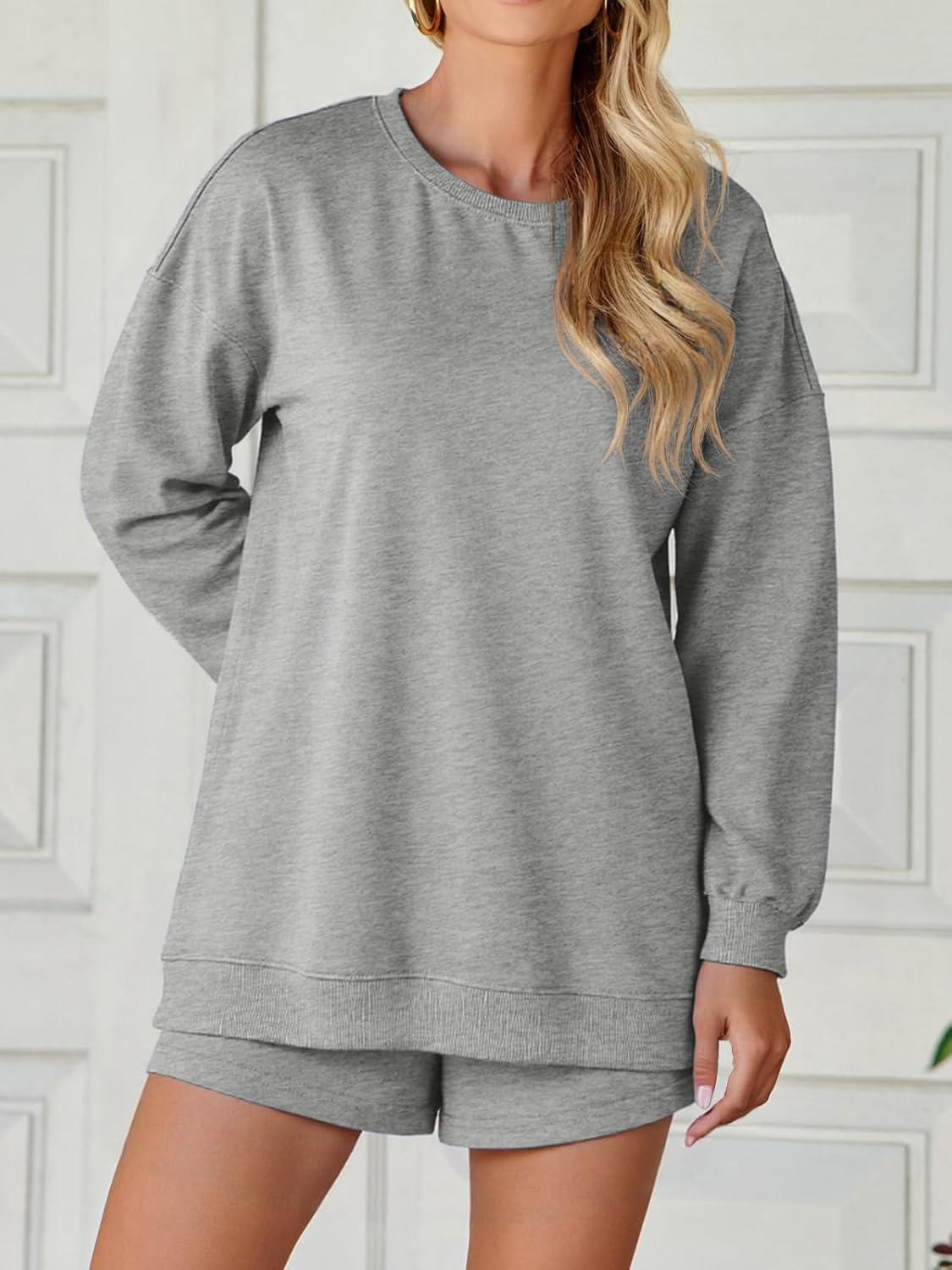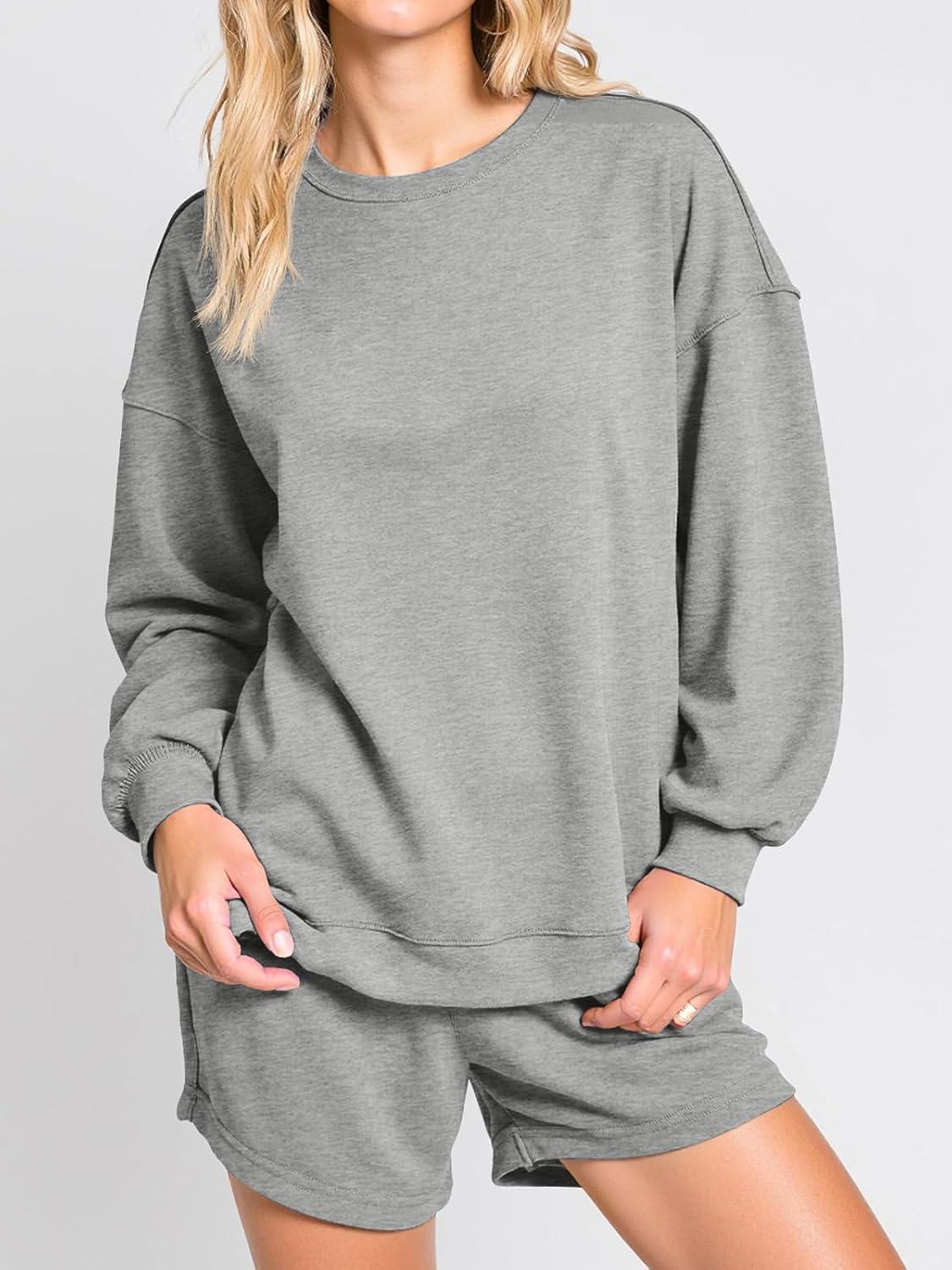 Tankaneo Womens Oversized 2 Piece Outfits Sweatsuit Casual Long Sleeve Crewneck Sweatshirts Sweat Shorts Fall Lounge Sets(Grey)