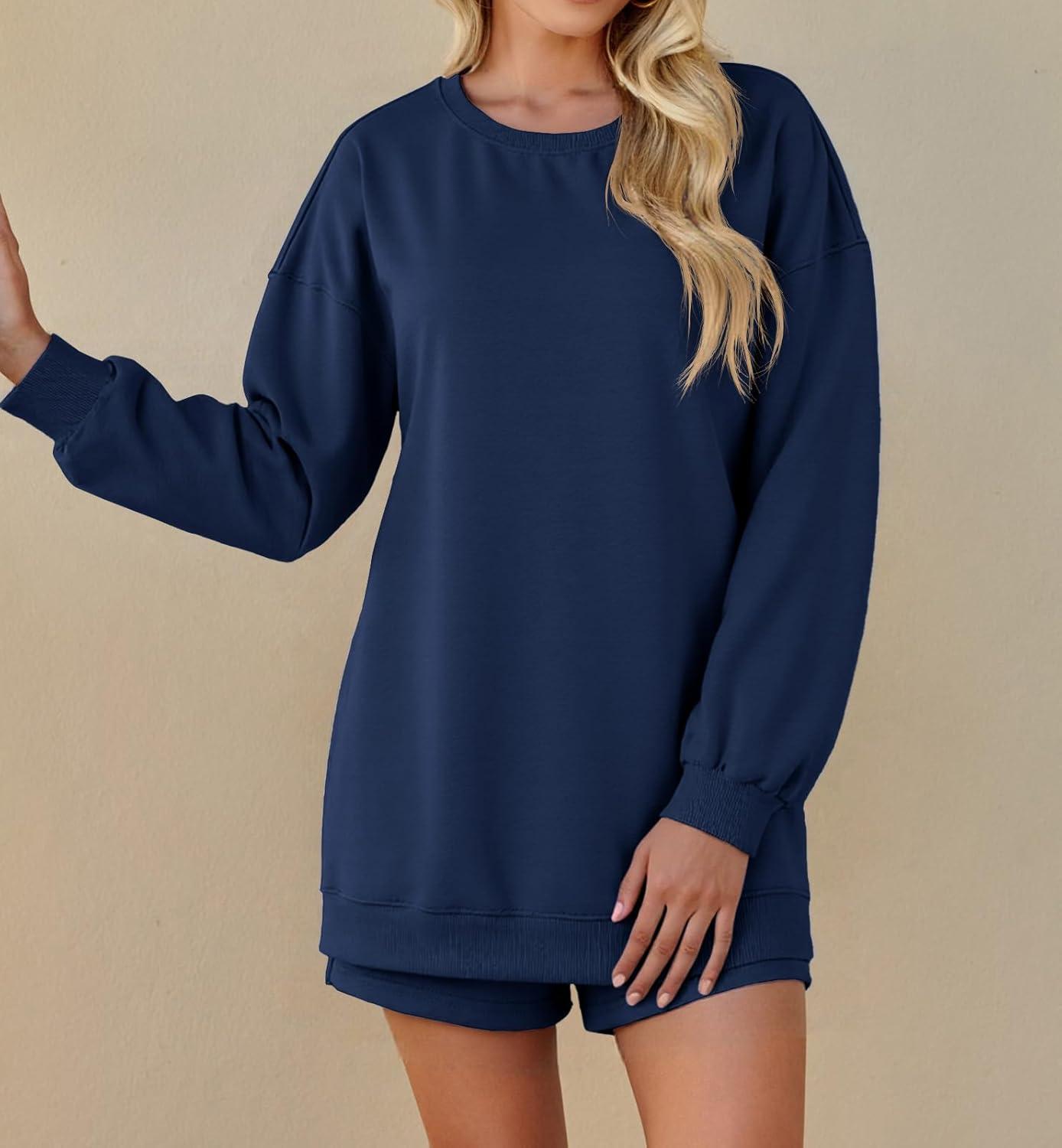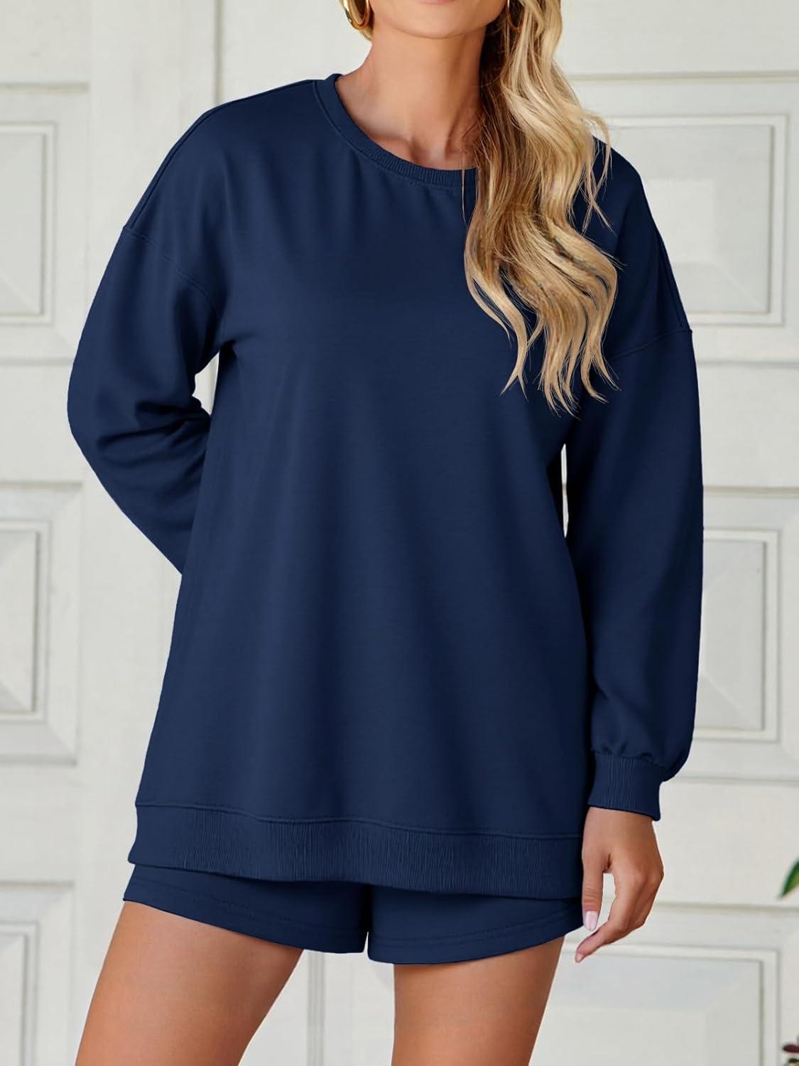 Tankaneo Womens Oversized 2 Piece Outfits Sweatsuit Casual Long Sleeve Crewneck Sweatshirts Sweat Shorts Fall Lounge Sets(Navy Blue)