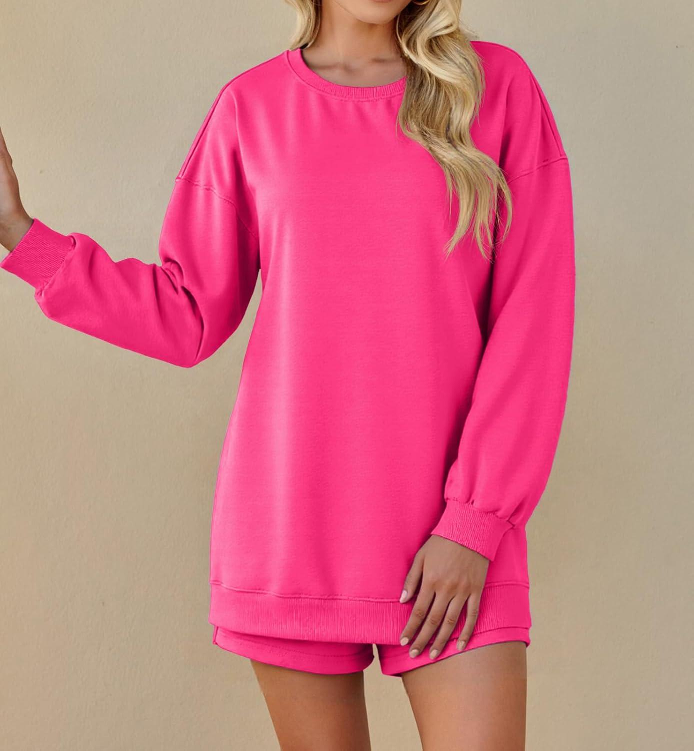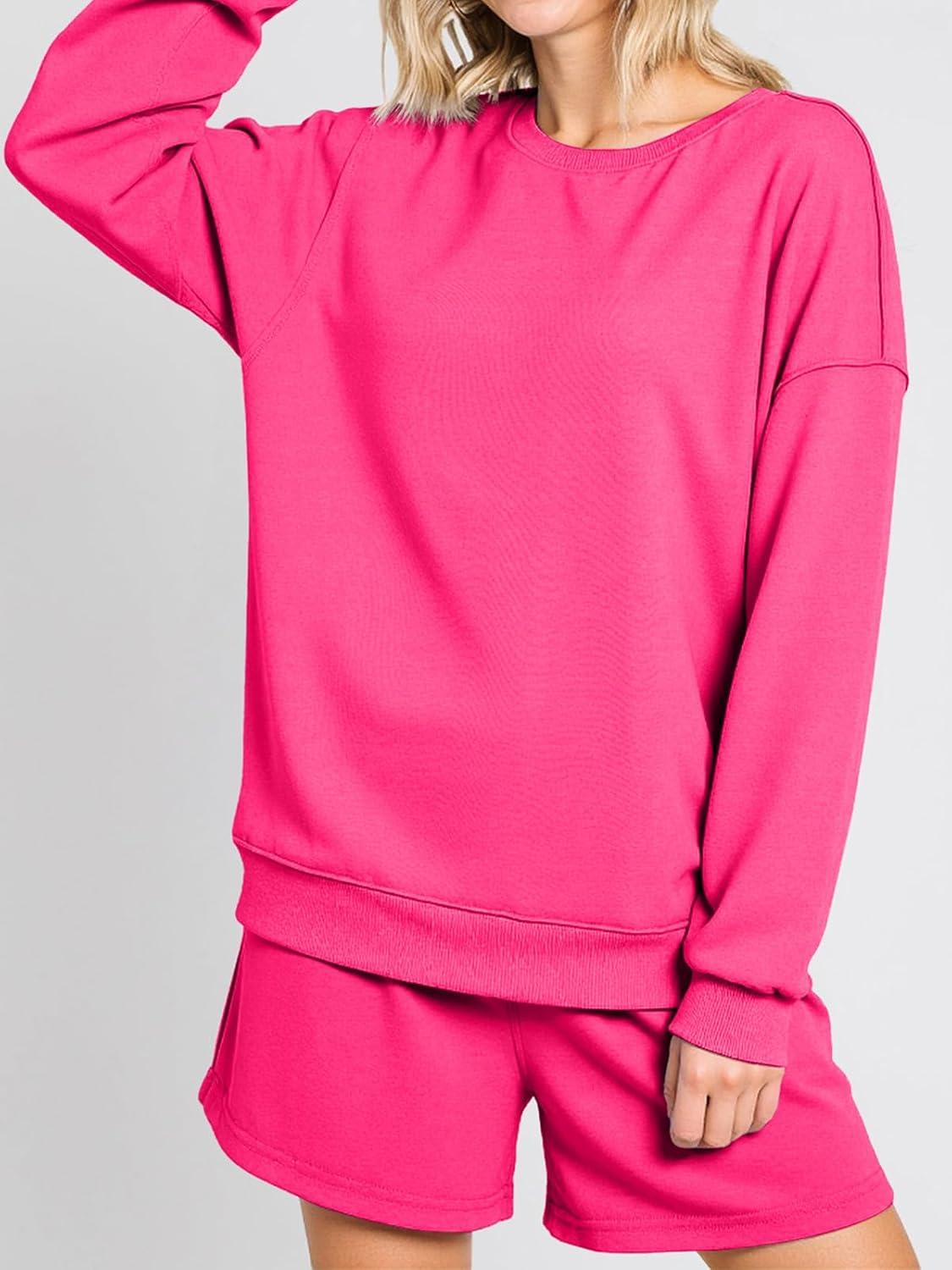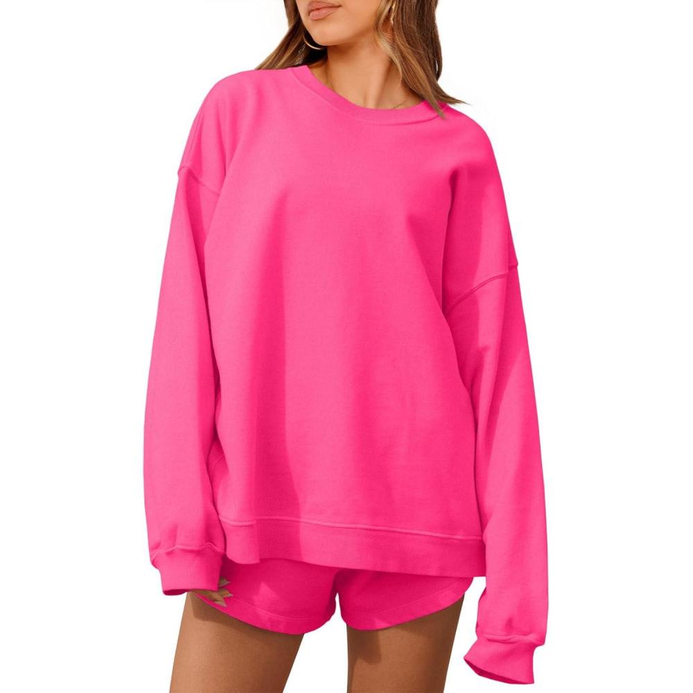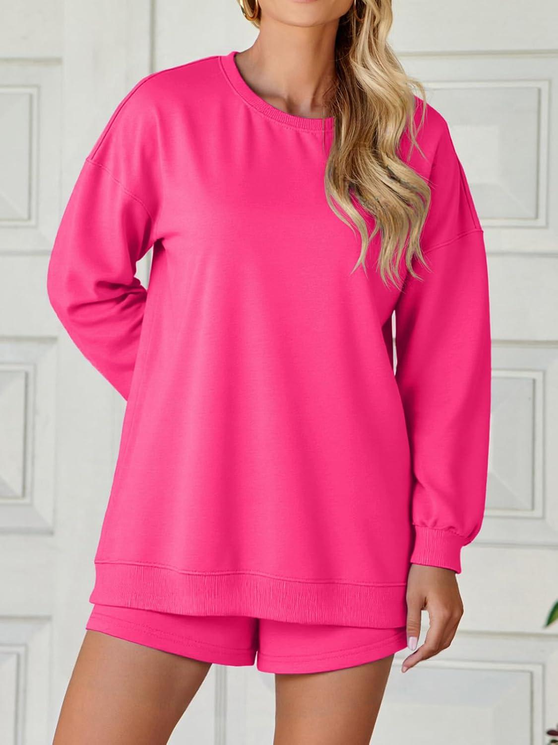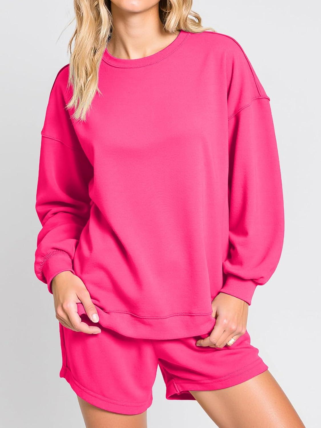 Tankaneo Womens Oversized 2 Piece Outfits Sweatsuit Casual Long Sleeve Crewneck Sweatshirts Sweat Shorts Fall Lounge Sets(Rose Red)