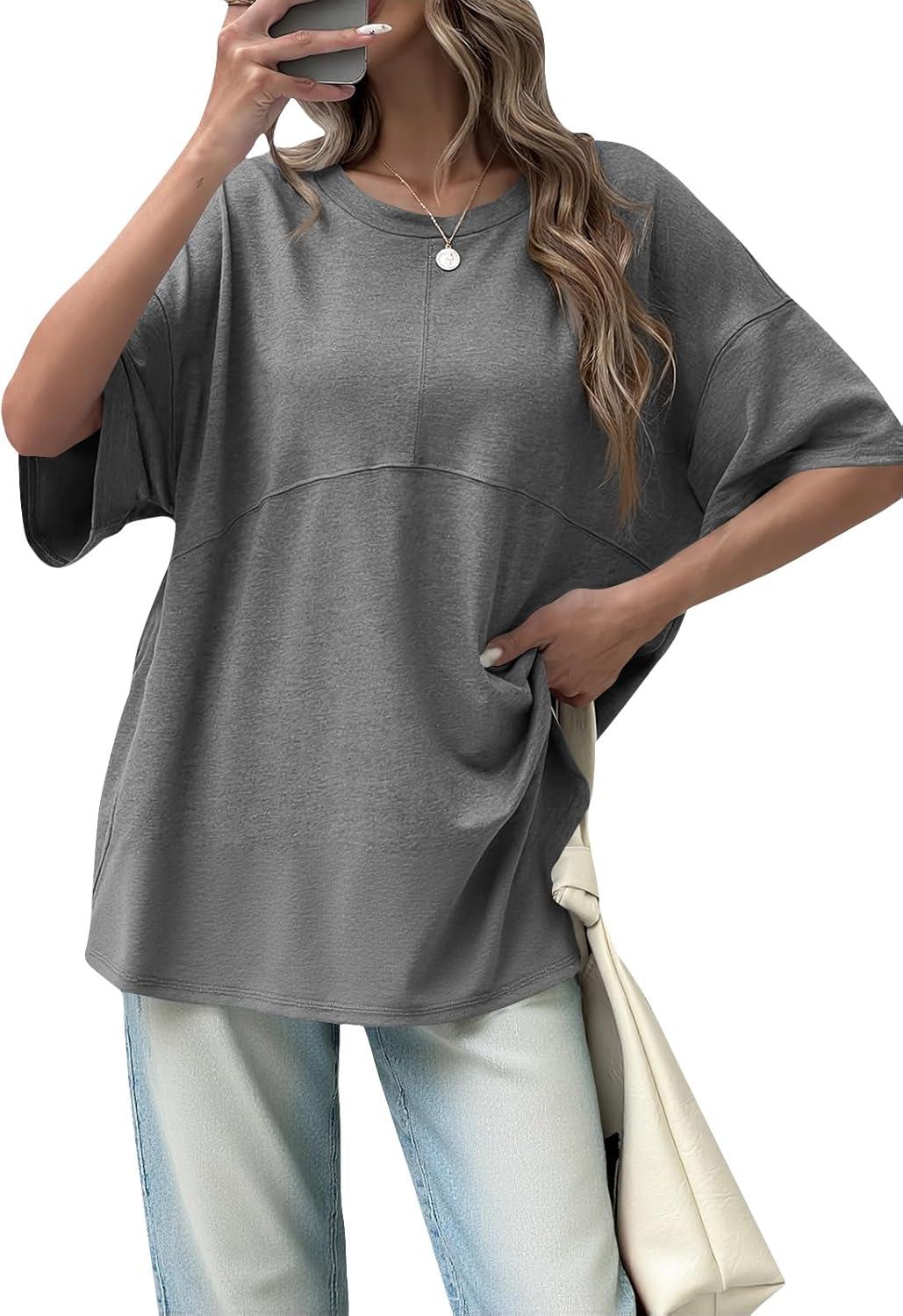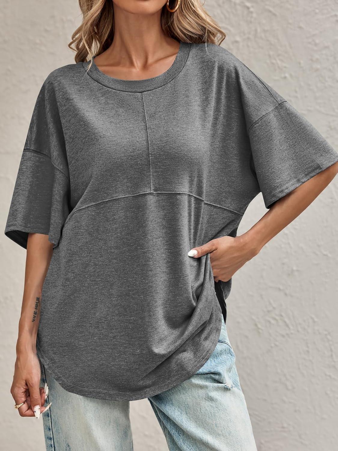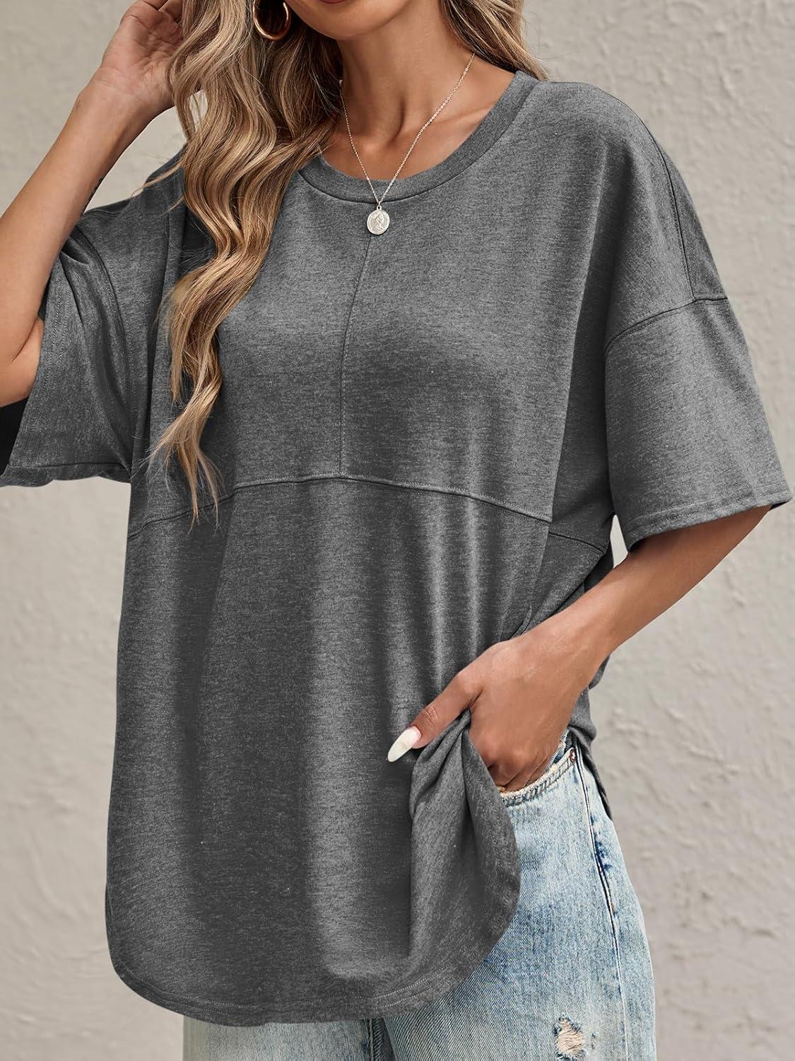 Tankaneo Womens Oversized Crewneck Shirts Short Sleeve Off The Shoulders Tops Curved Hem Tshirt(Black Grey)