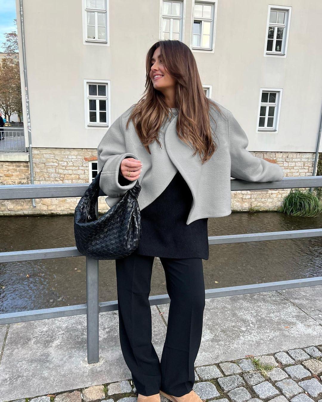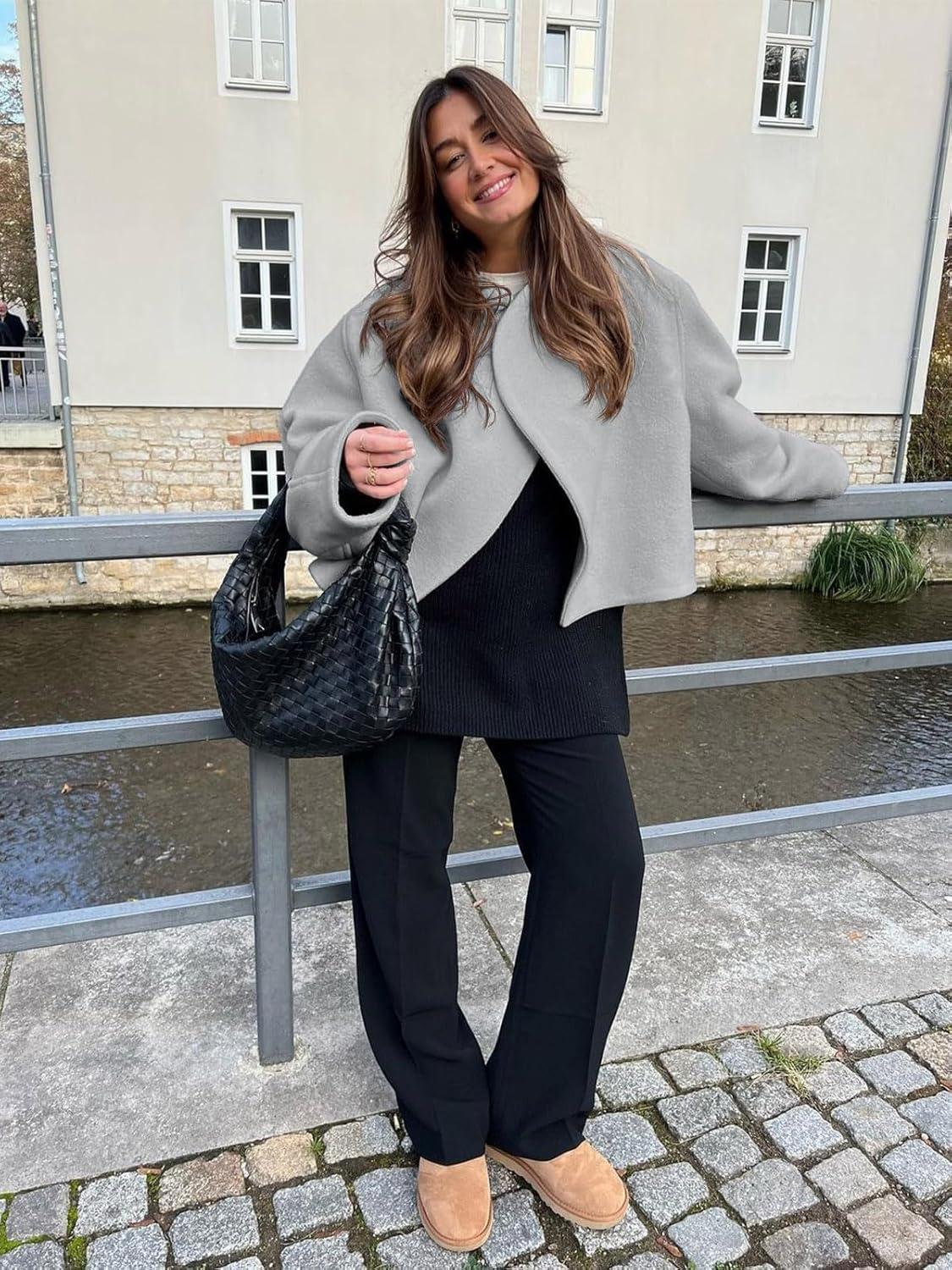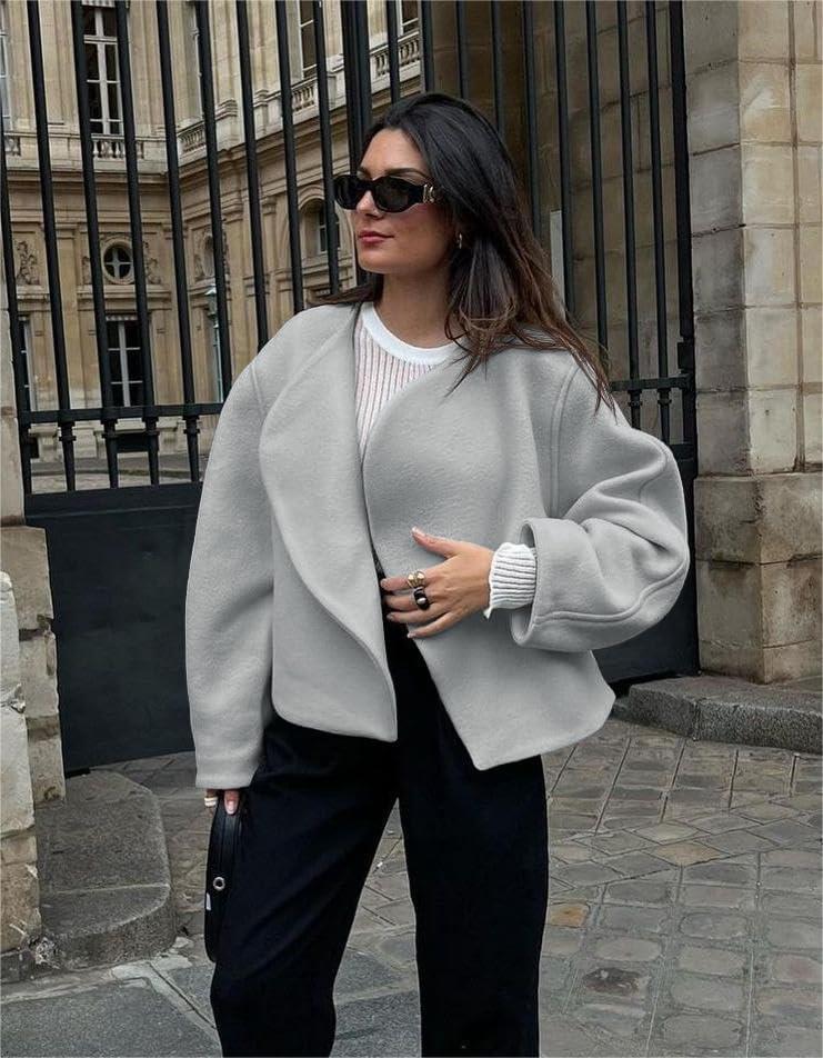 Tankaneo Womens Oversized Cropped Pea Coat Lapel Open Front Jacket Winter Short Outerwear(Light Grey)