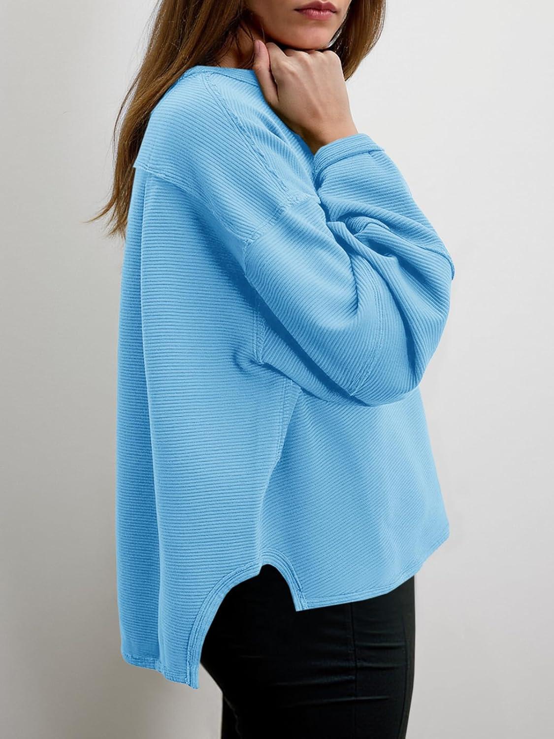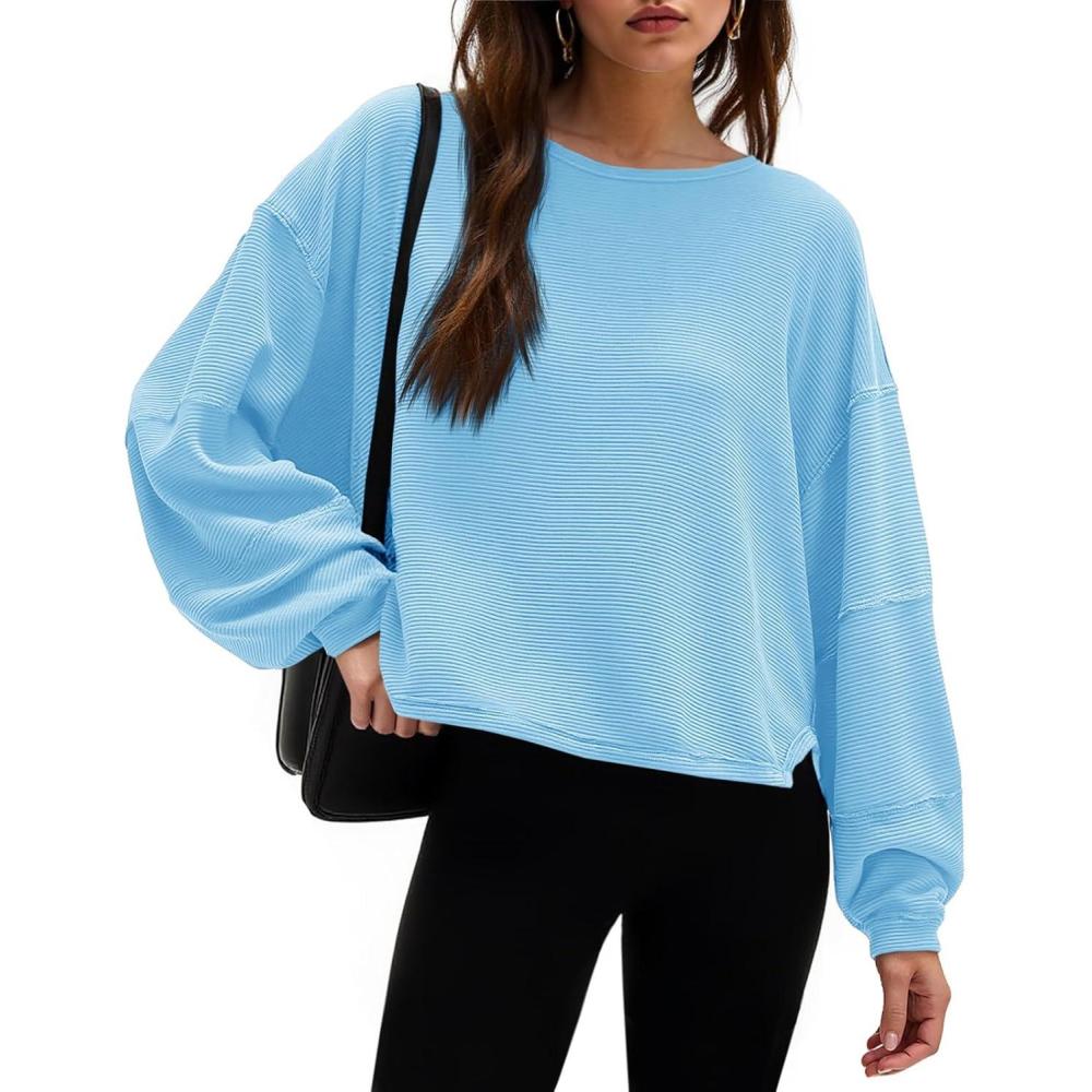 Tankaneo Womens Oversized Cropped T Shirts Ribbed Slit Sweatshirt Long Sleeve Pullover Tops Casual Loose Fit Boxy Tee Shirt(Blue)