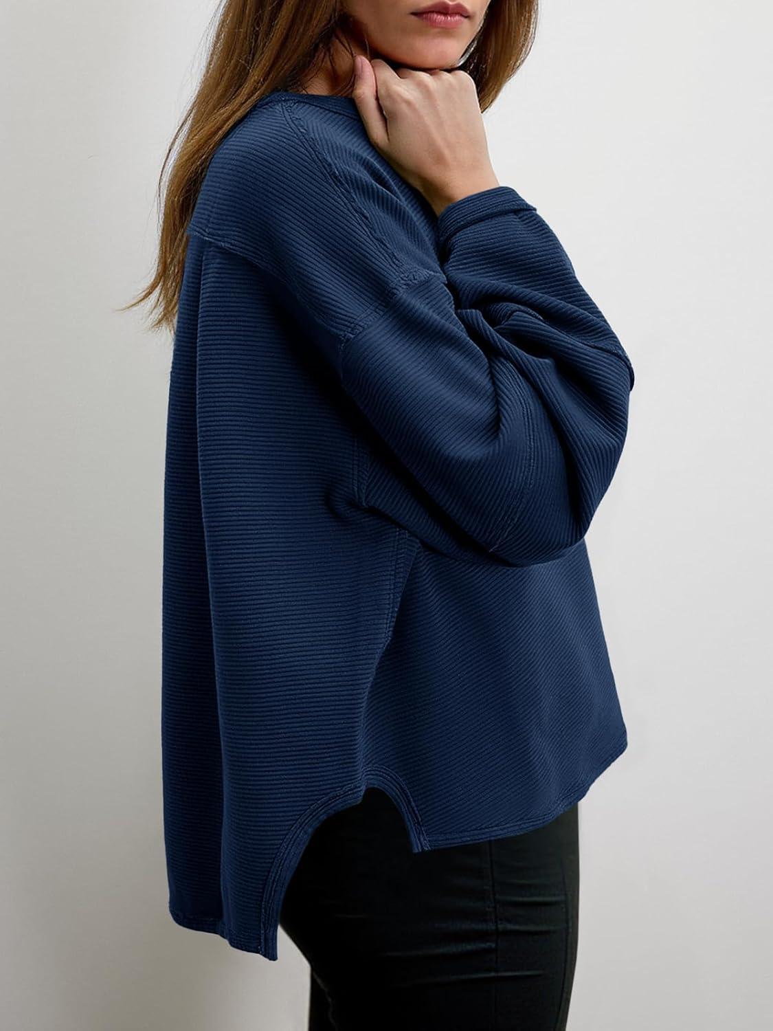 Tankaneo Womens Oversized Cropped T Shirts Ribbed Slit Sweatshirt Long Sleeve Pullover Tops Casual Loose Fit Boxy Tee Shirt(Navy)