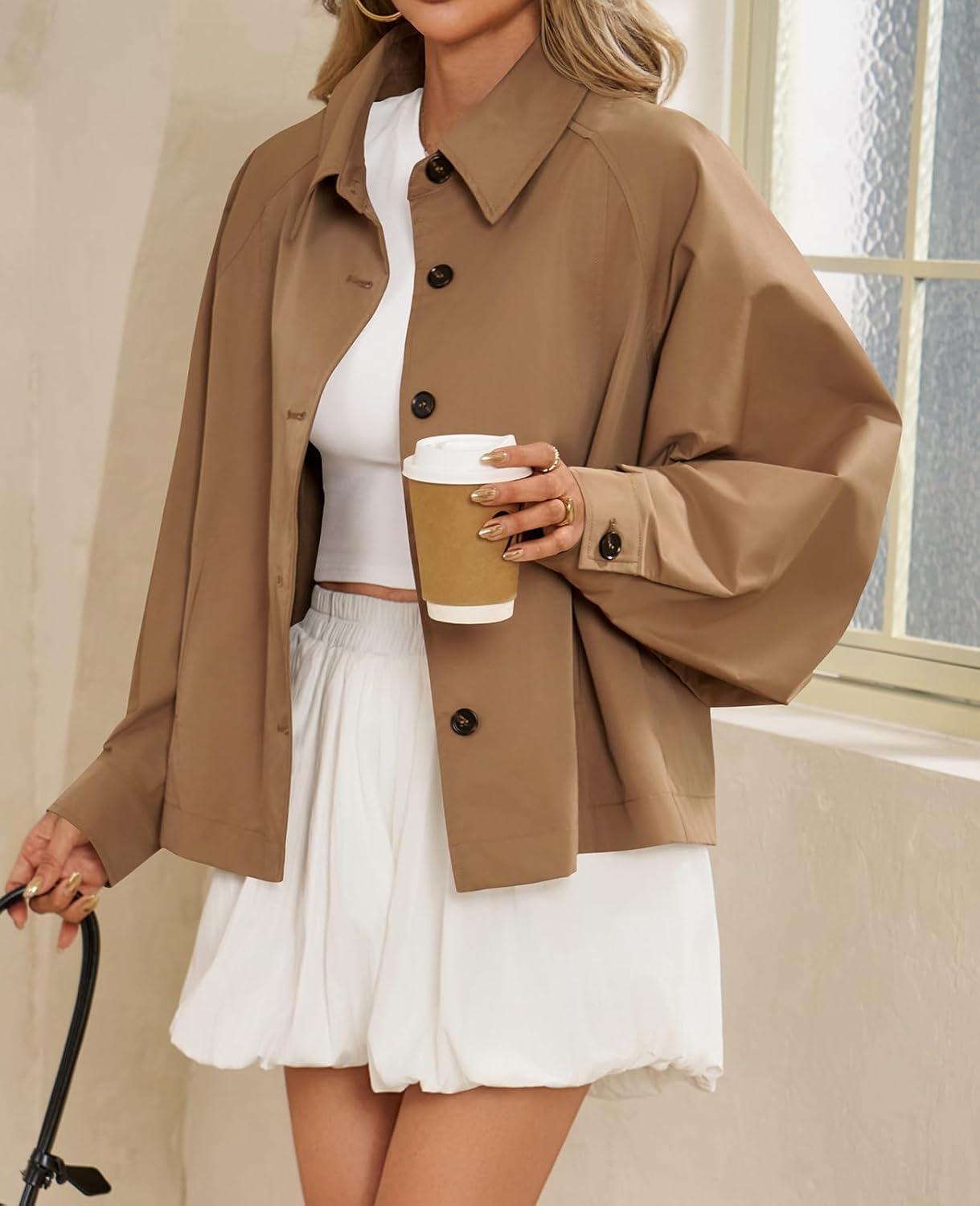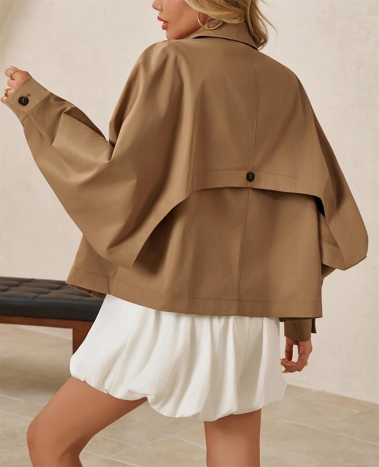 Tankaneo Womens Oversized Cropped Trench Coat Batwing Sleeve Single Breasted Lapel Casual Jackets Fall Button up Outerwear(Khaki)