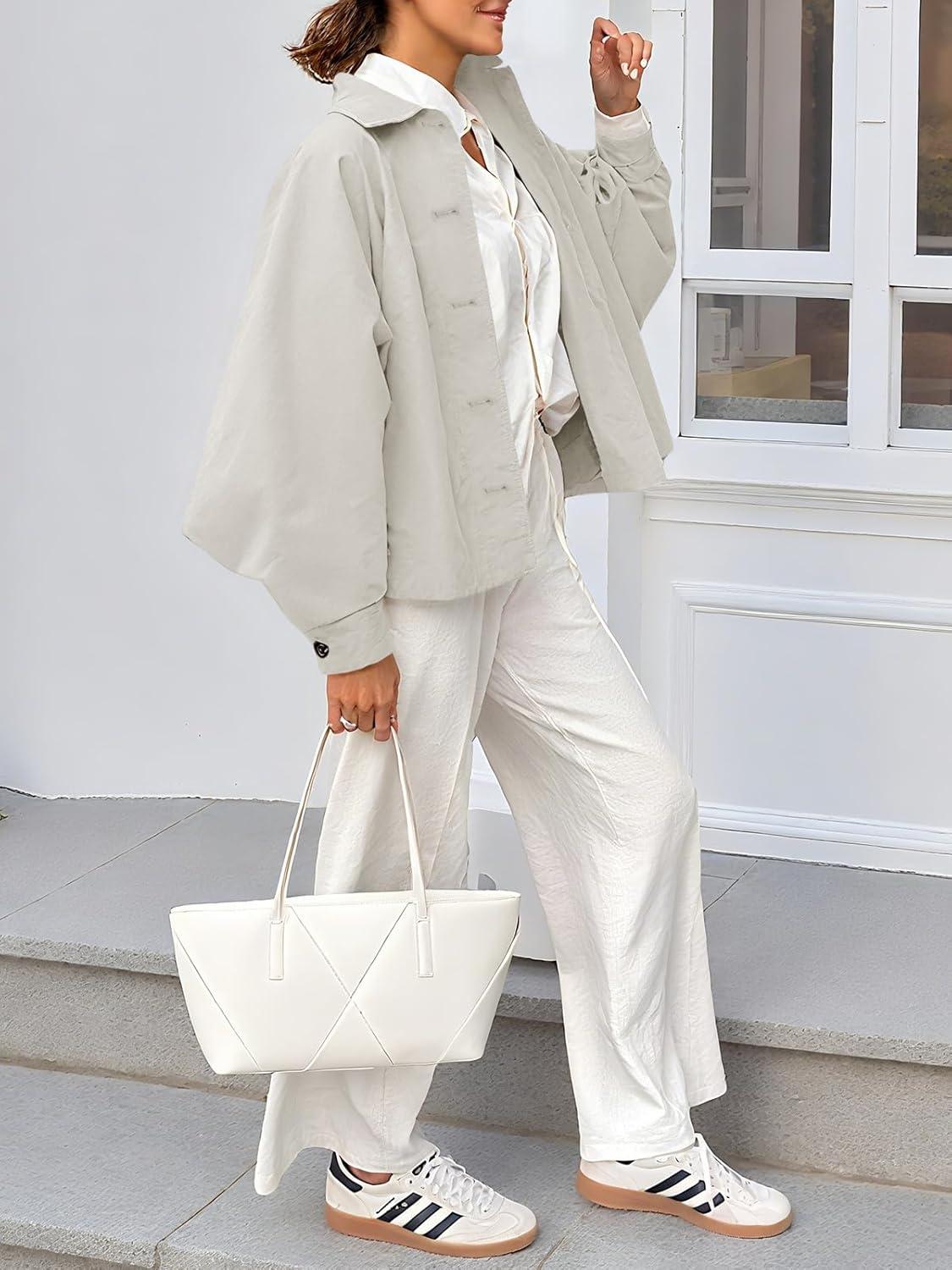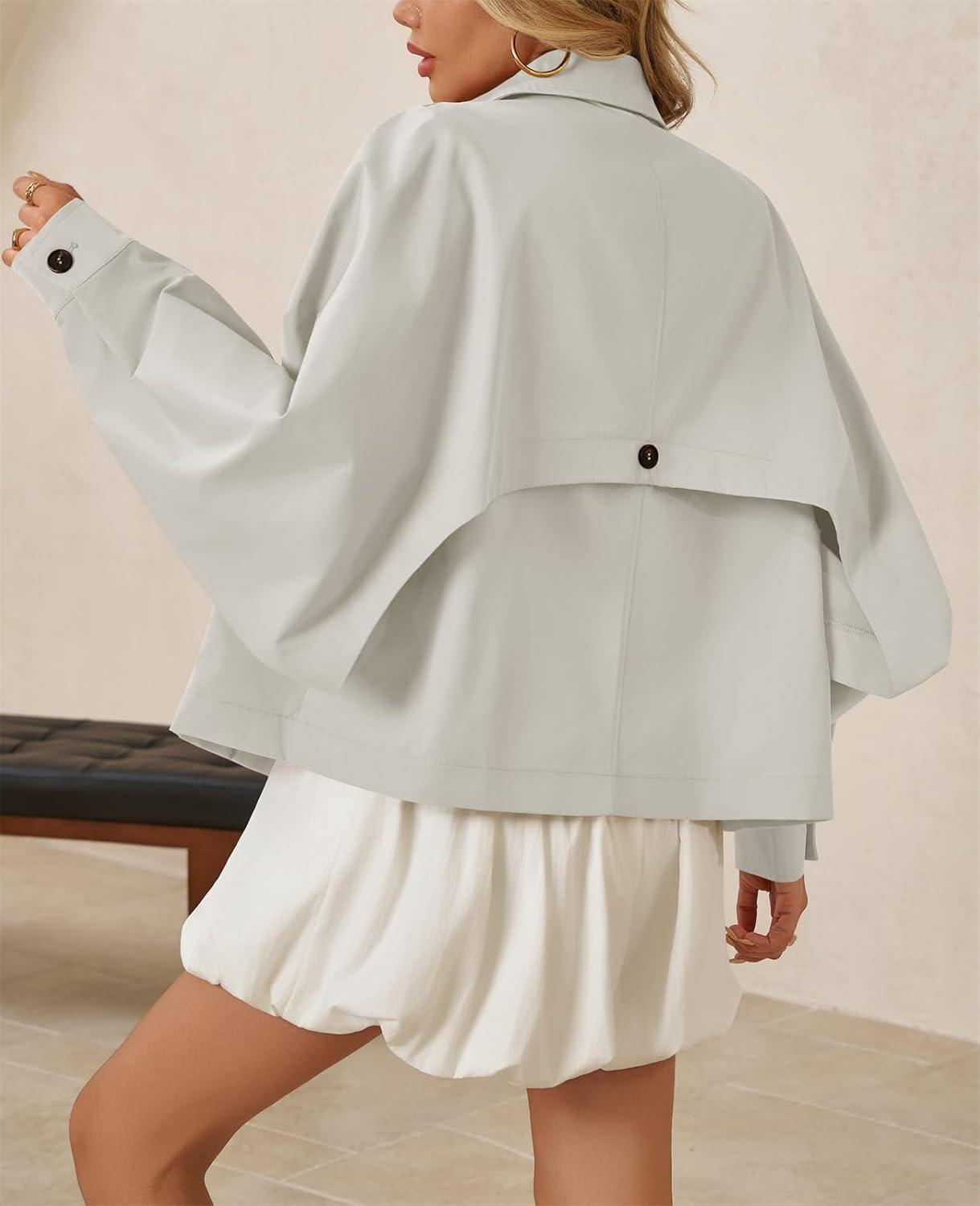 Tankaneo Womens Oversized Cropped Trench Coat Batwing Sleeve Single Breasted Lapel Casual Jackets Fall Button up Outerwear(Light Grey)