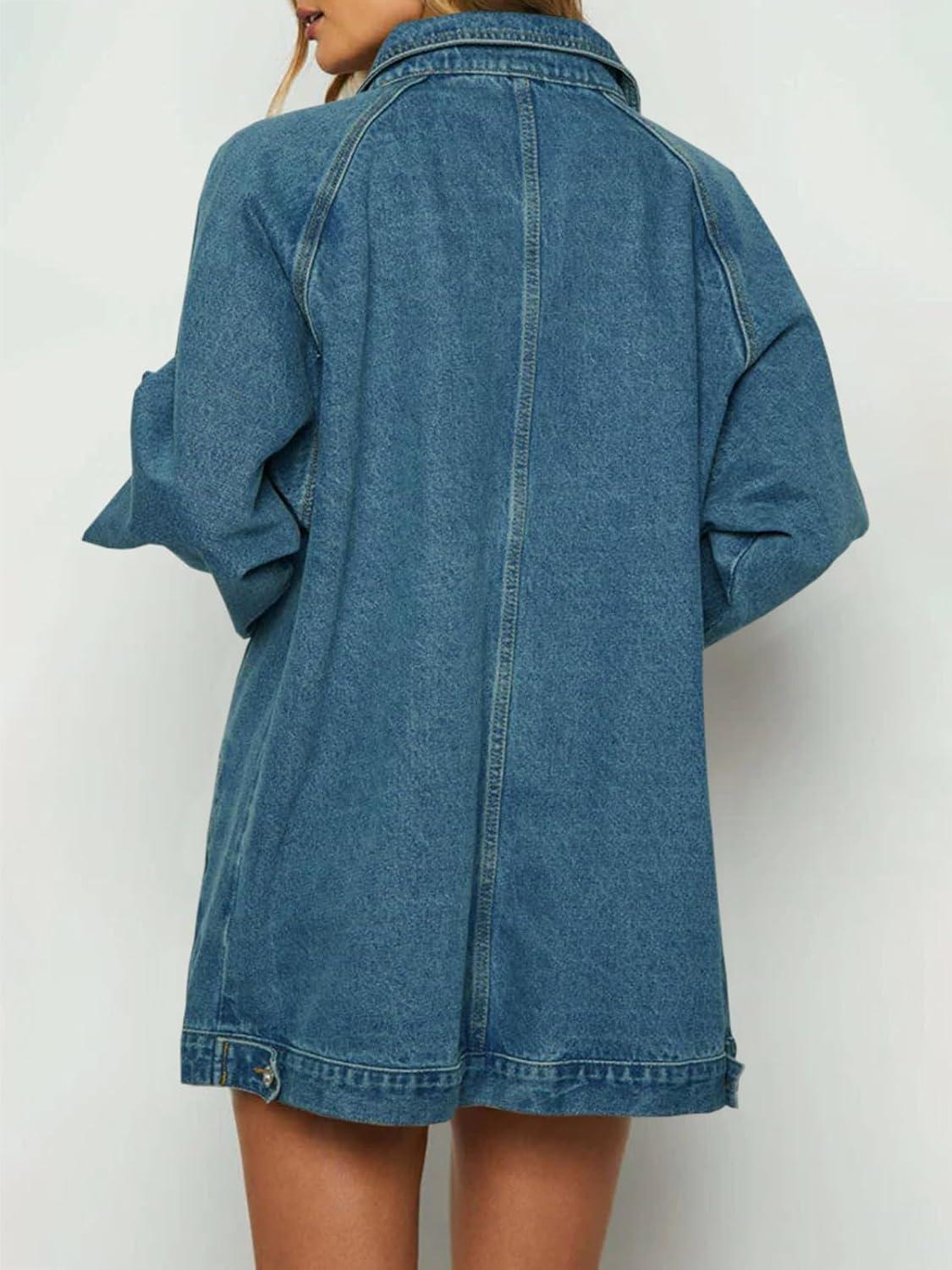 Tankaneo Womens Oversized Denim Jackets Casual Zip up Spring Long Sleeve Jean Jacket with Pocket(Blue)