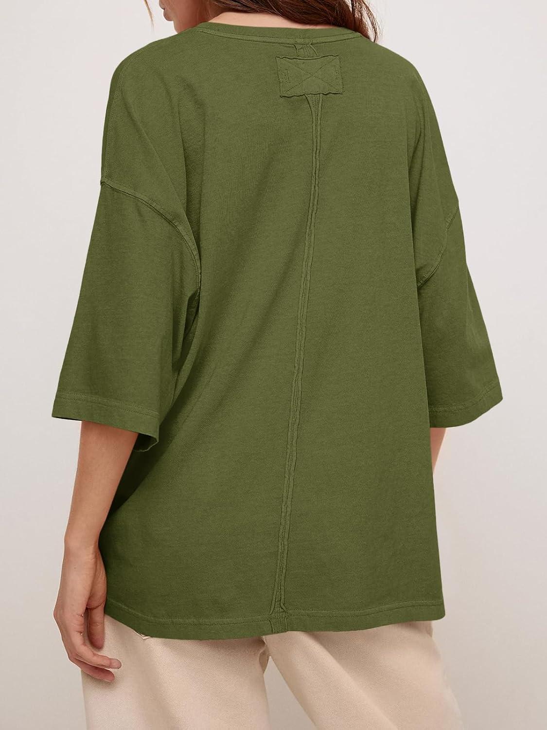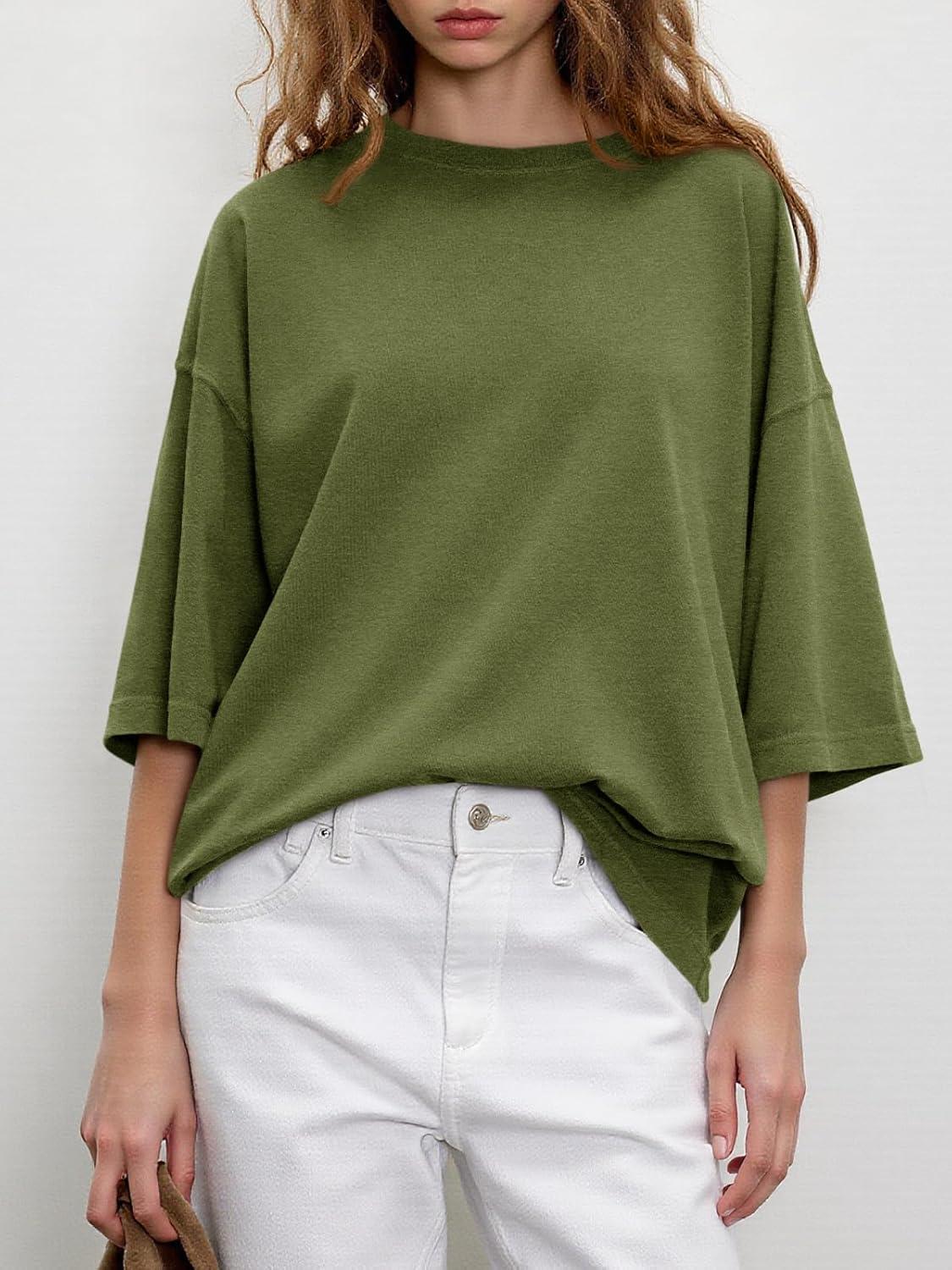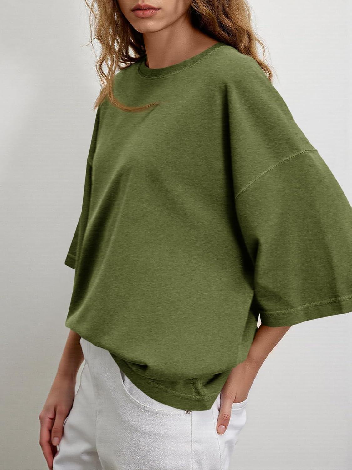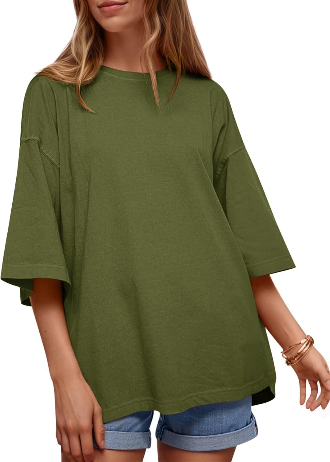 Tankaneo Womens Oversized Half Sleeve T-Shirts Summer Casual Crew Neck Tunic Tops Loose Fit Boxy Basic Tees(Army Green)