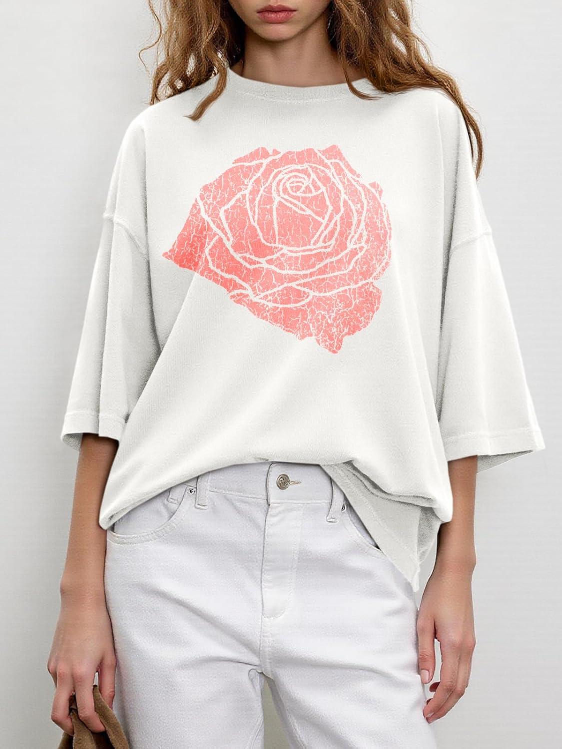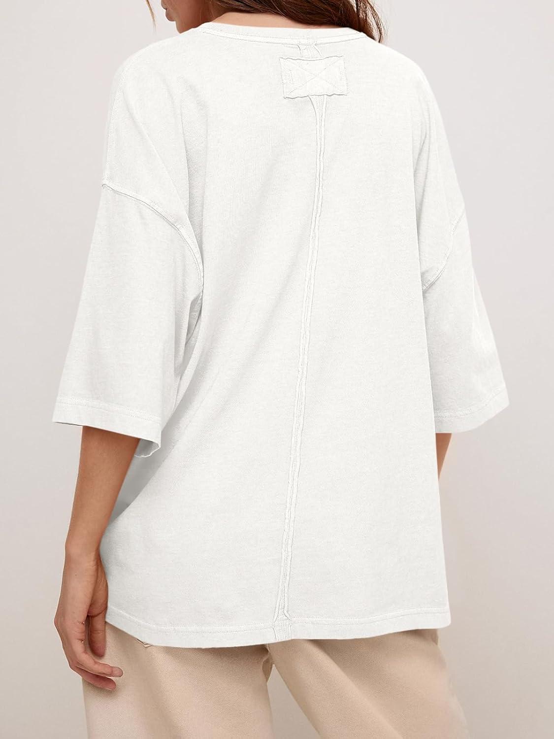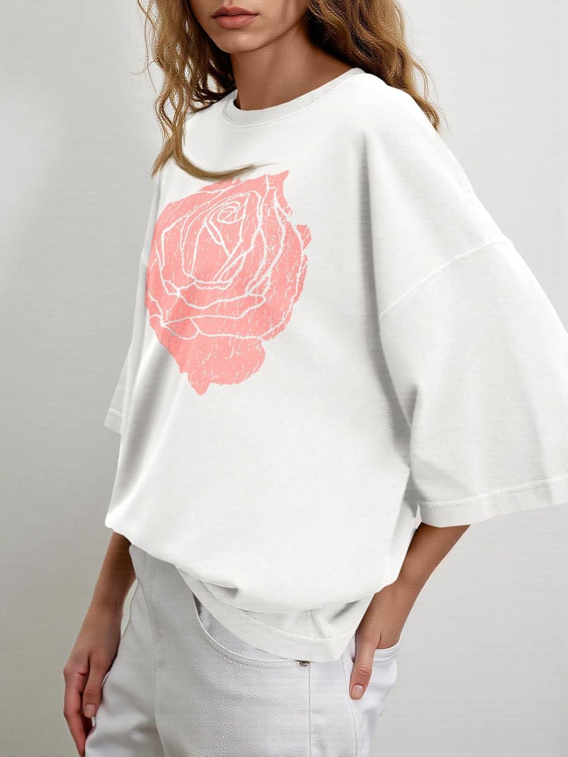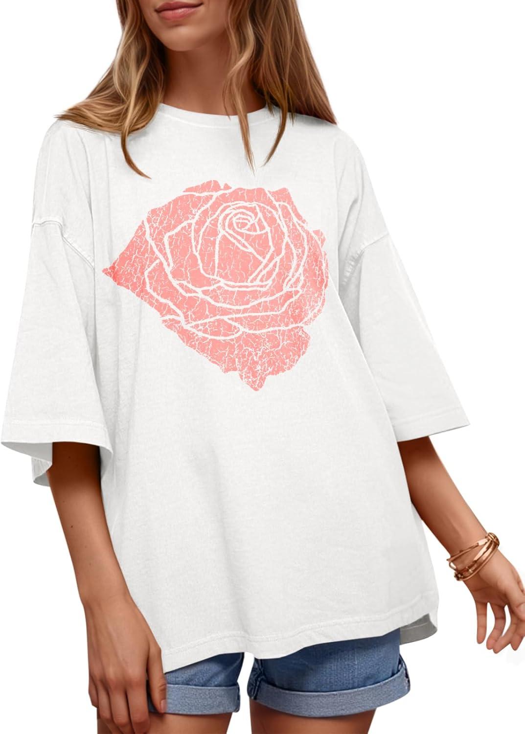 Tankaneo Womens Oversized Half Sleeve T-Shirts Summer Casual Crew Neck Tunic Tops Loose Fit Boxy Basic Tees(Floral-white)