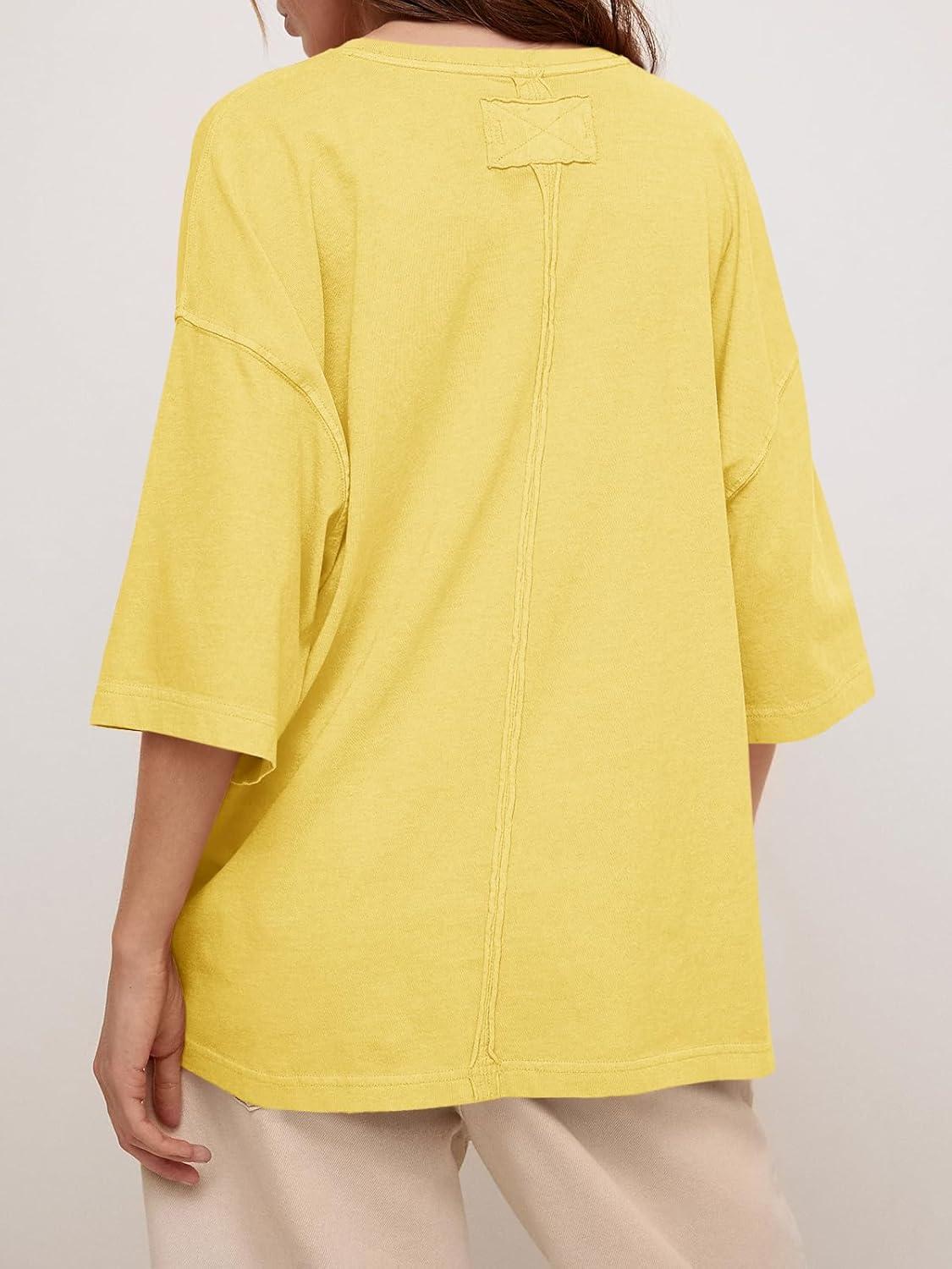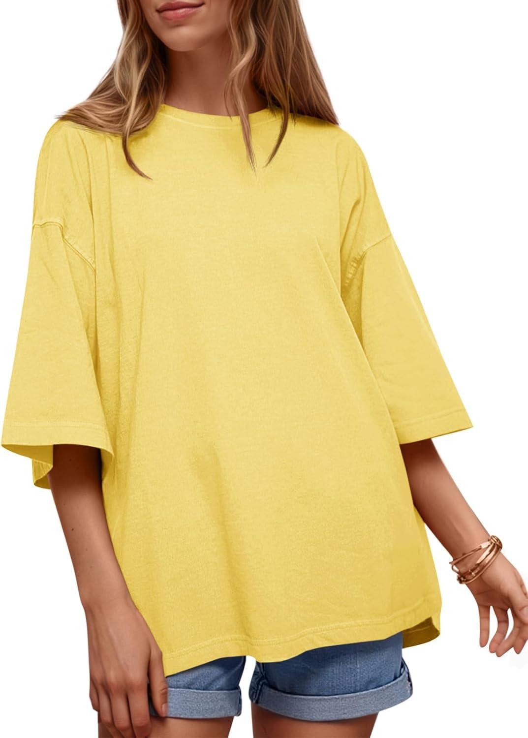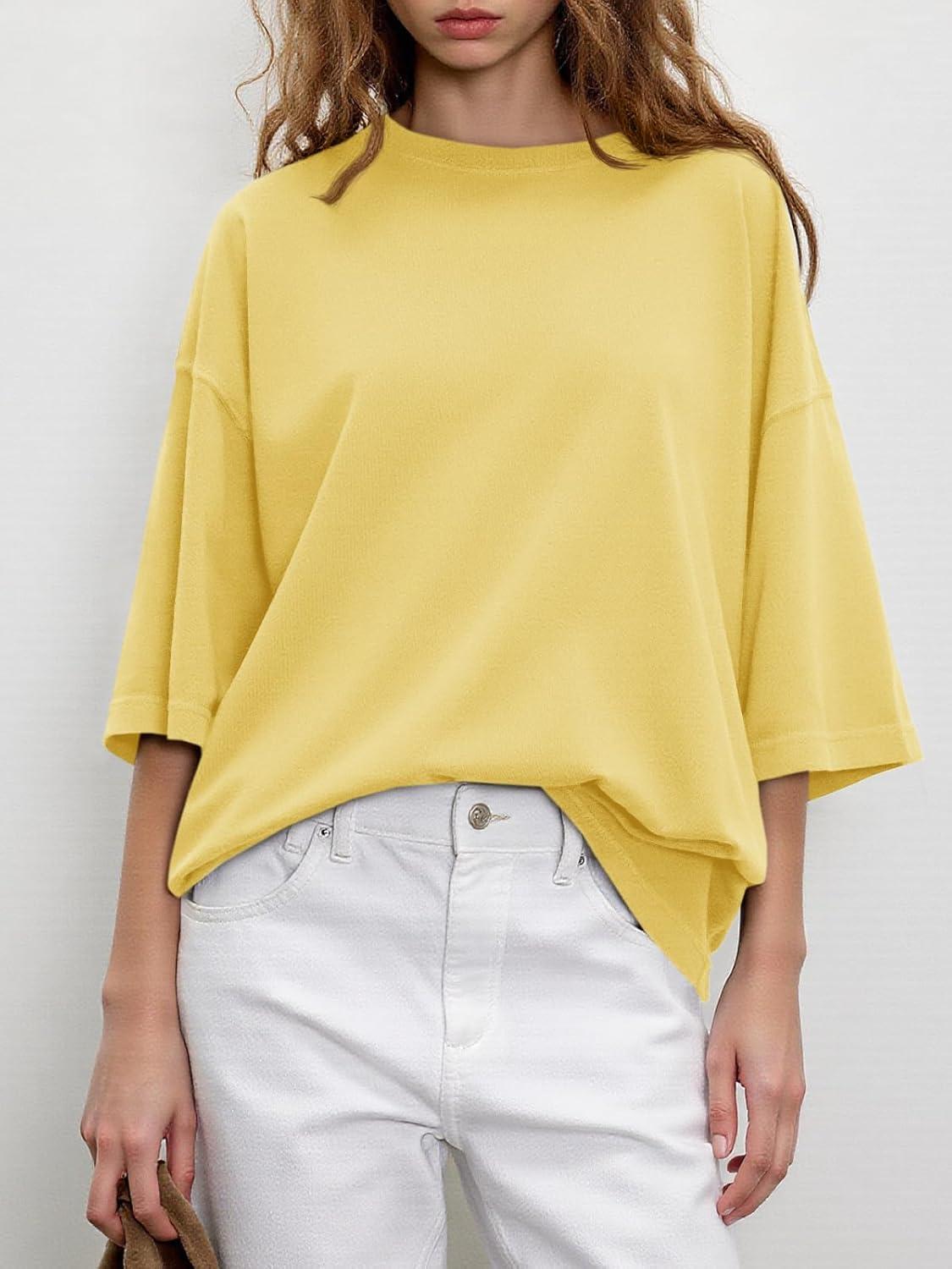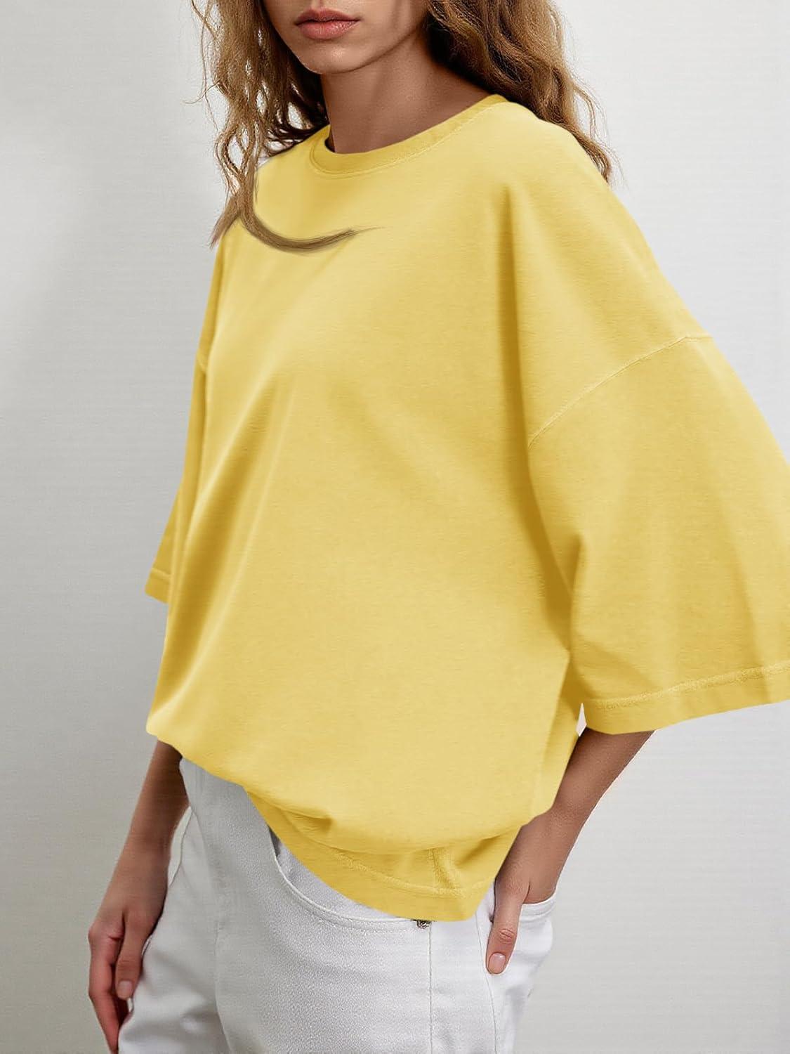 Tankaneo Womens Oversized Half Sleeve T-Shirts Summer Casual Crew Neck Tunic Tops Loose Fit Boxy Basic Tees(Light Yellow)