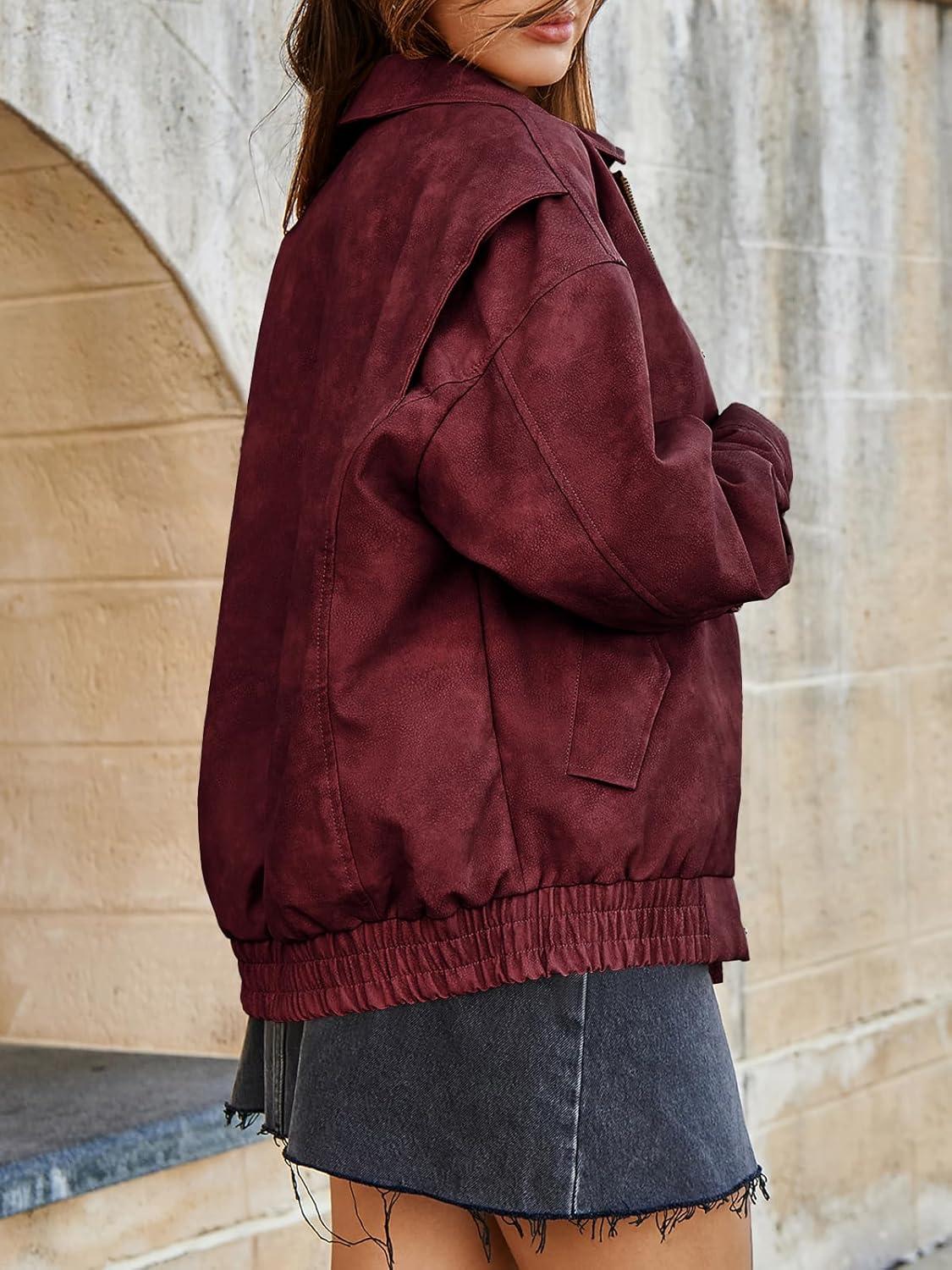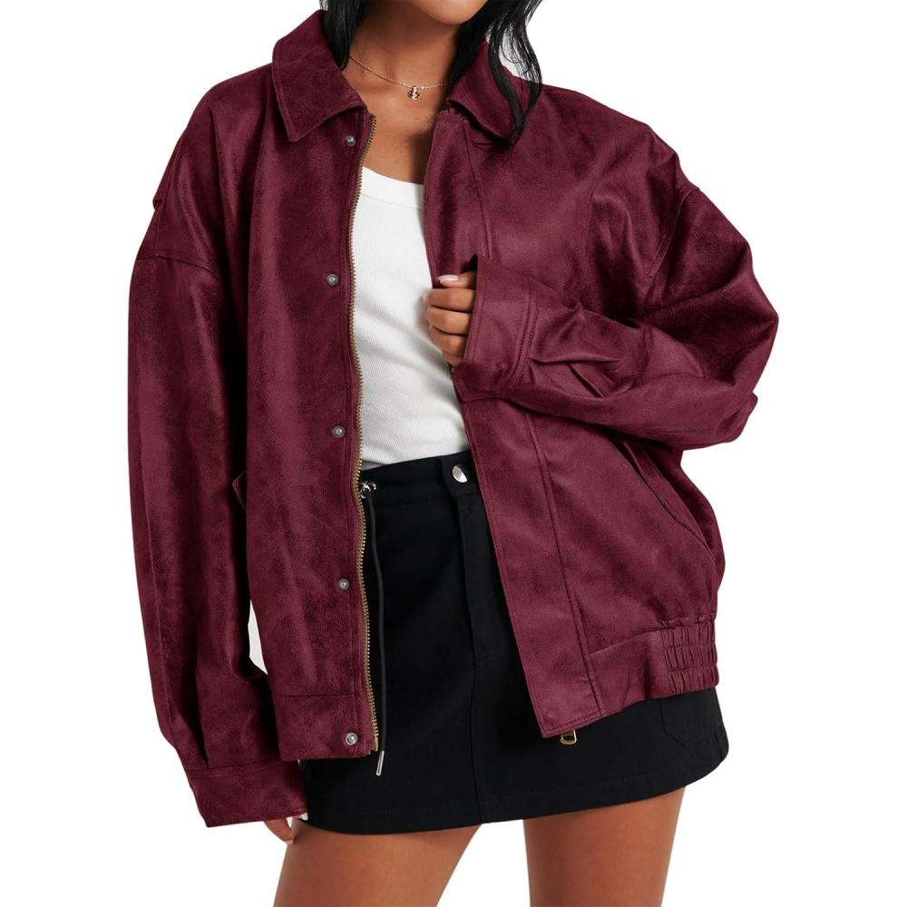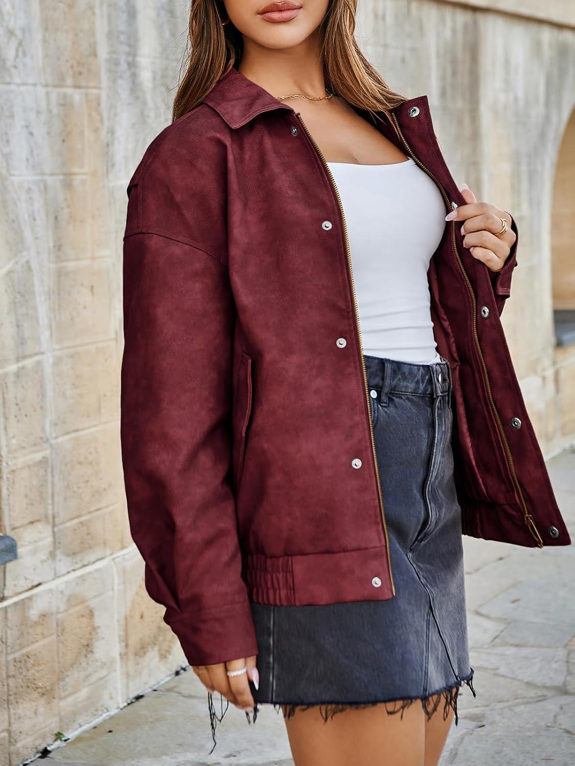 Tankaneo Womens Oversized Leather Jackets Trendy Zip up Bomber Motorcycle Coat 2025 Going out Outfits(Burgundy)
