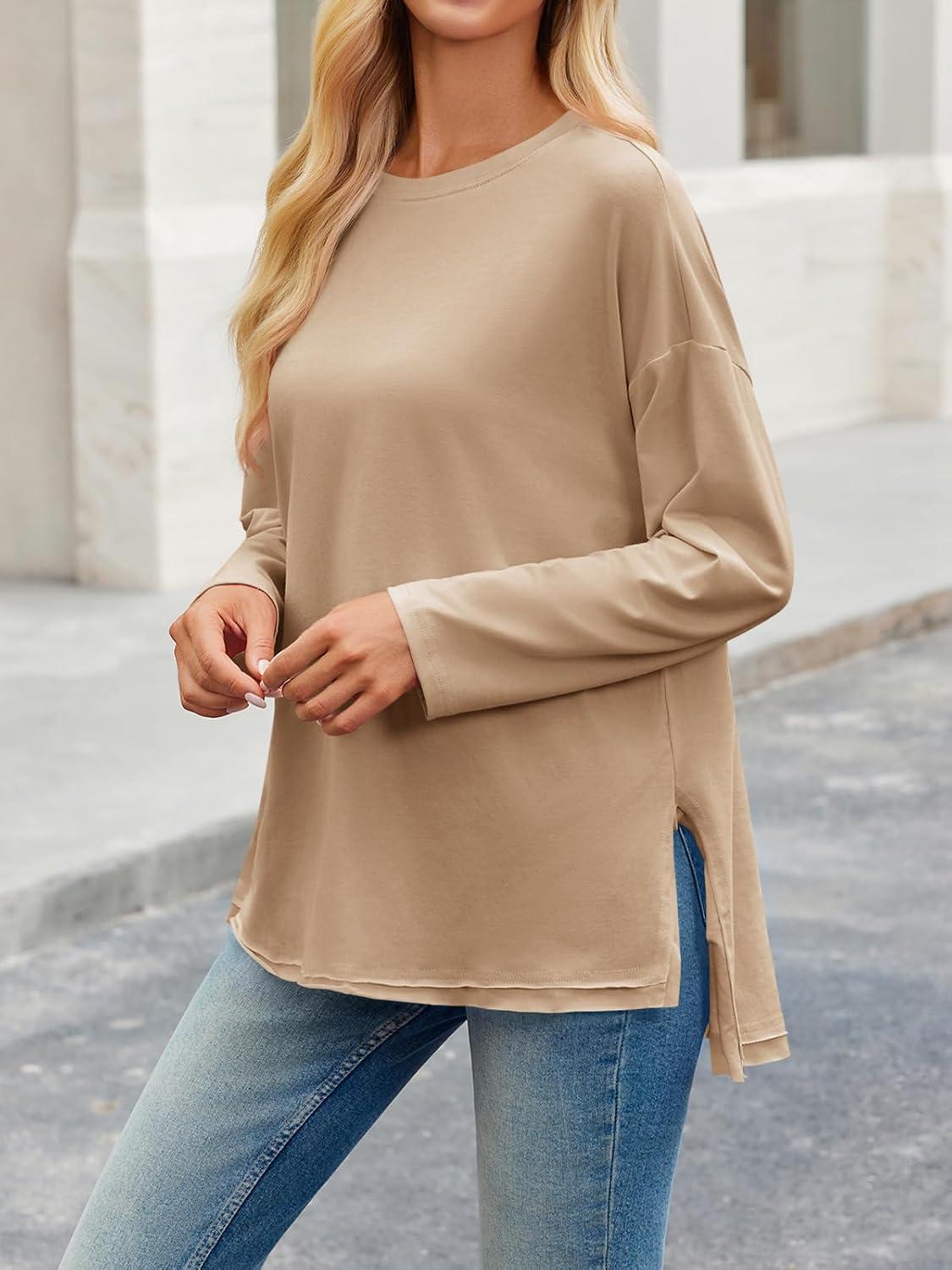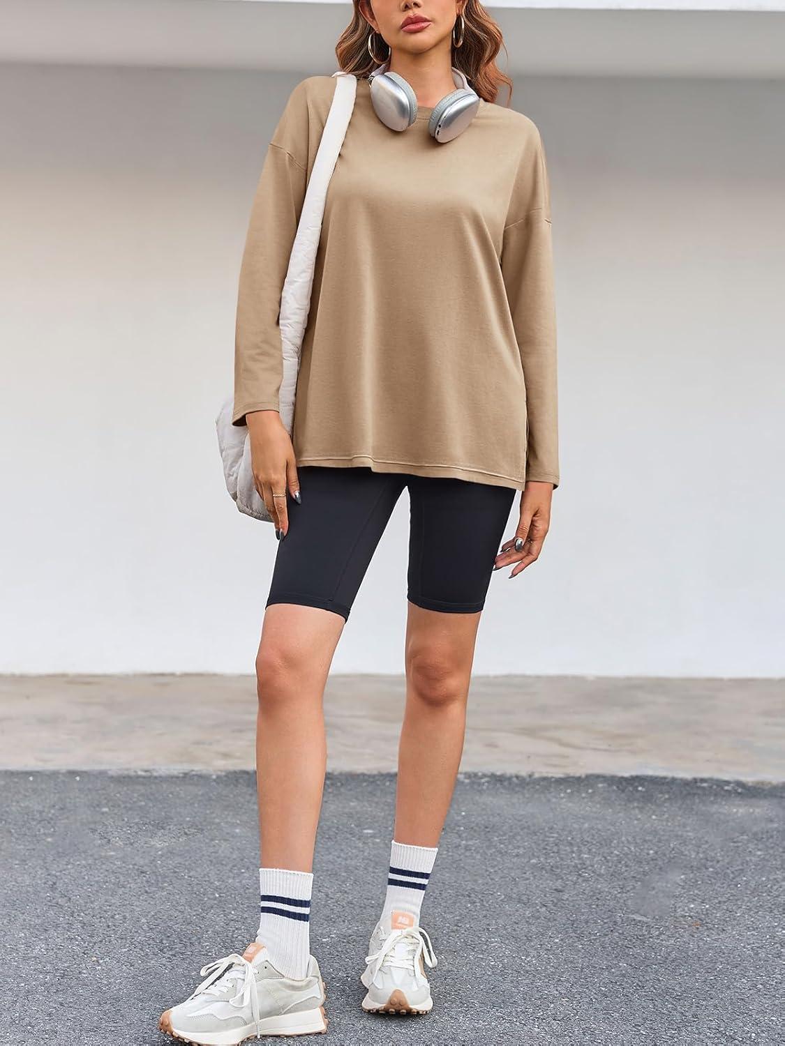 Tankaneo Womens Oversized Long Sleeve T Shirts 2025 Crewneck Basic Tee Loose Fit Tunic Tops Casual Fall Workout Clothes(Khaki)