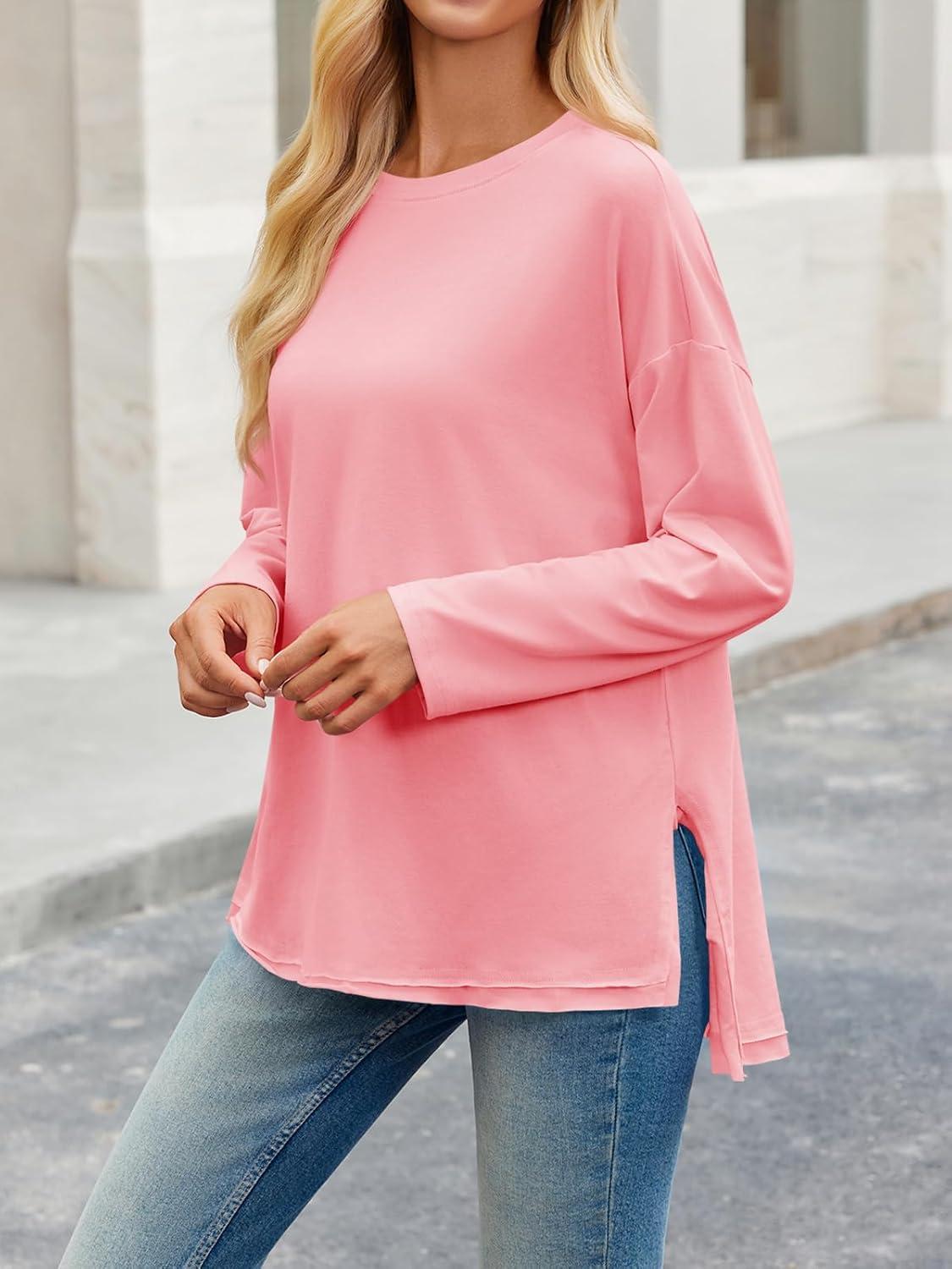 Tankaneo Womens Oversized Long Sleeve T Shirts 2025 Crewneck Basic Tee Loose Fit Tunic Tops Casual Fall Workout Clothes(Light Pink)