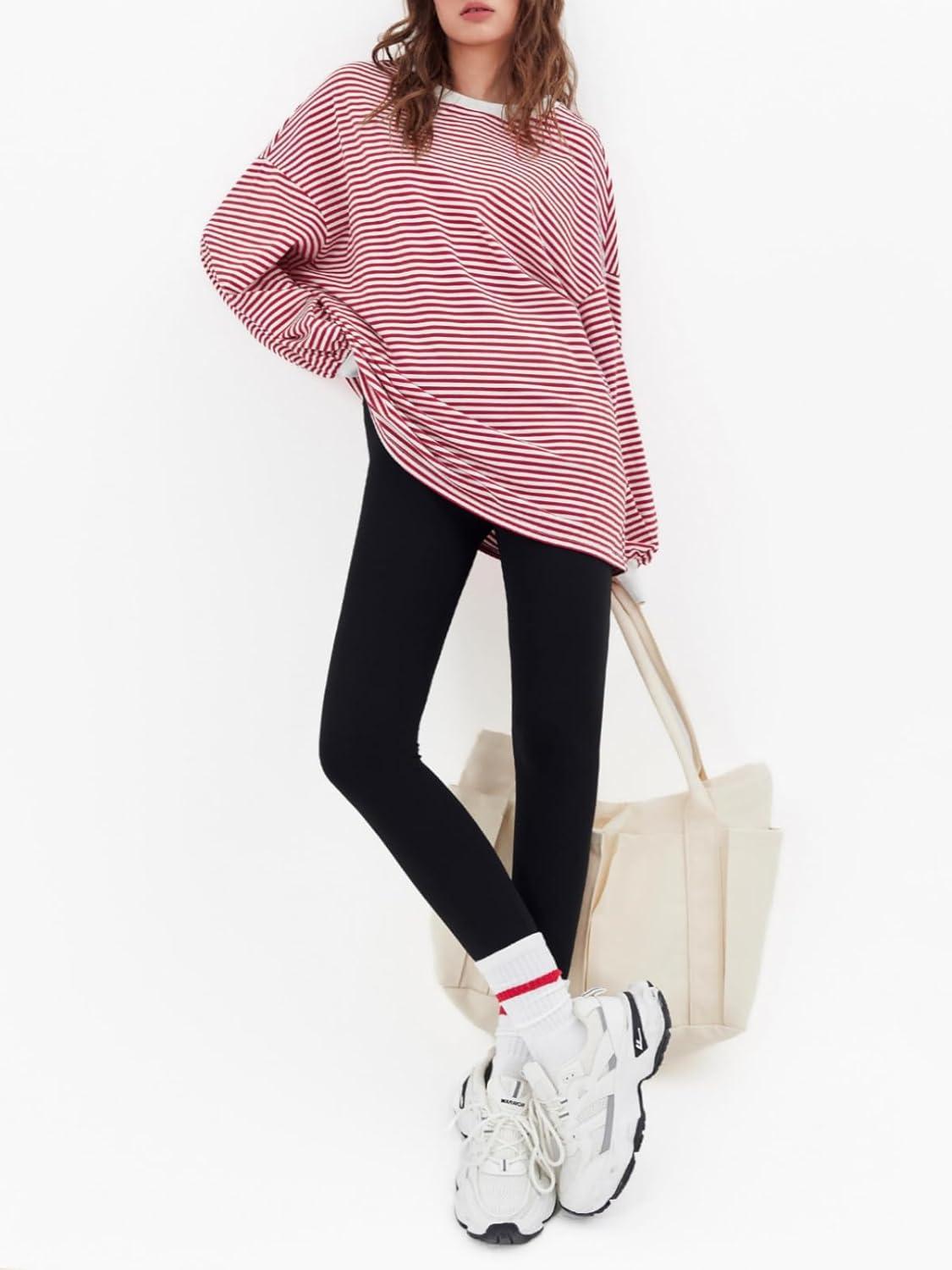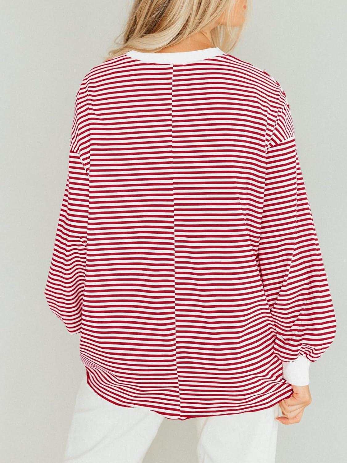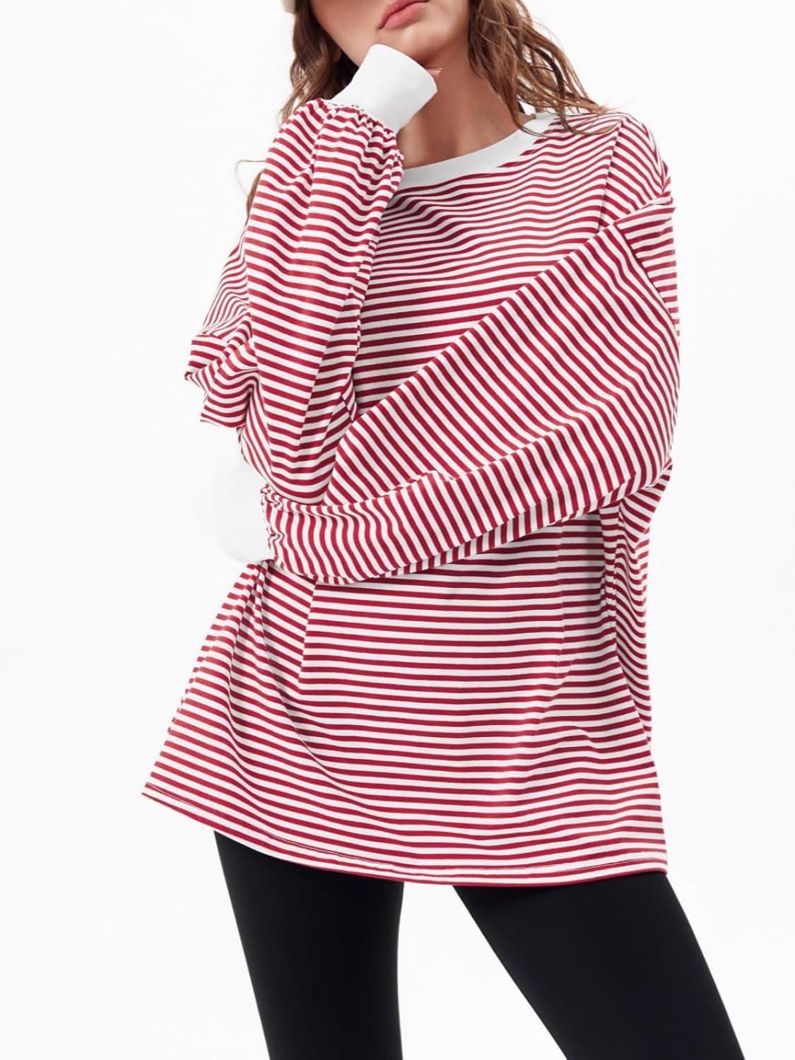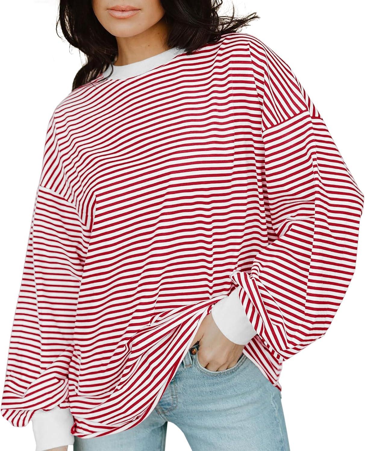 Tankaneo Womens Oversized Long Sleeve T Shirts Striped Color Block Cotton Tunic Tops Loose Fit Fall Crewneck Sweatshirt(Red)