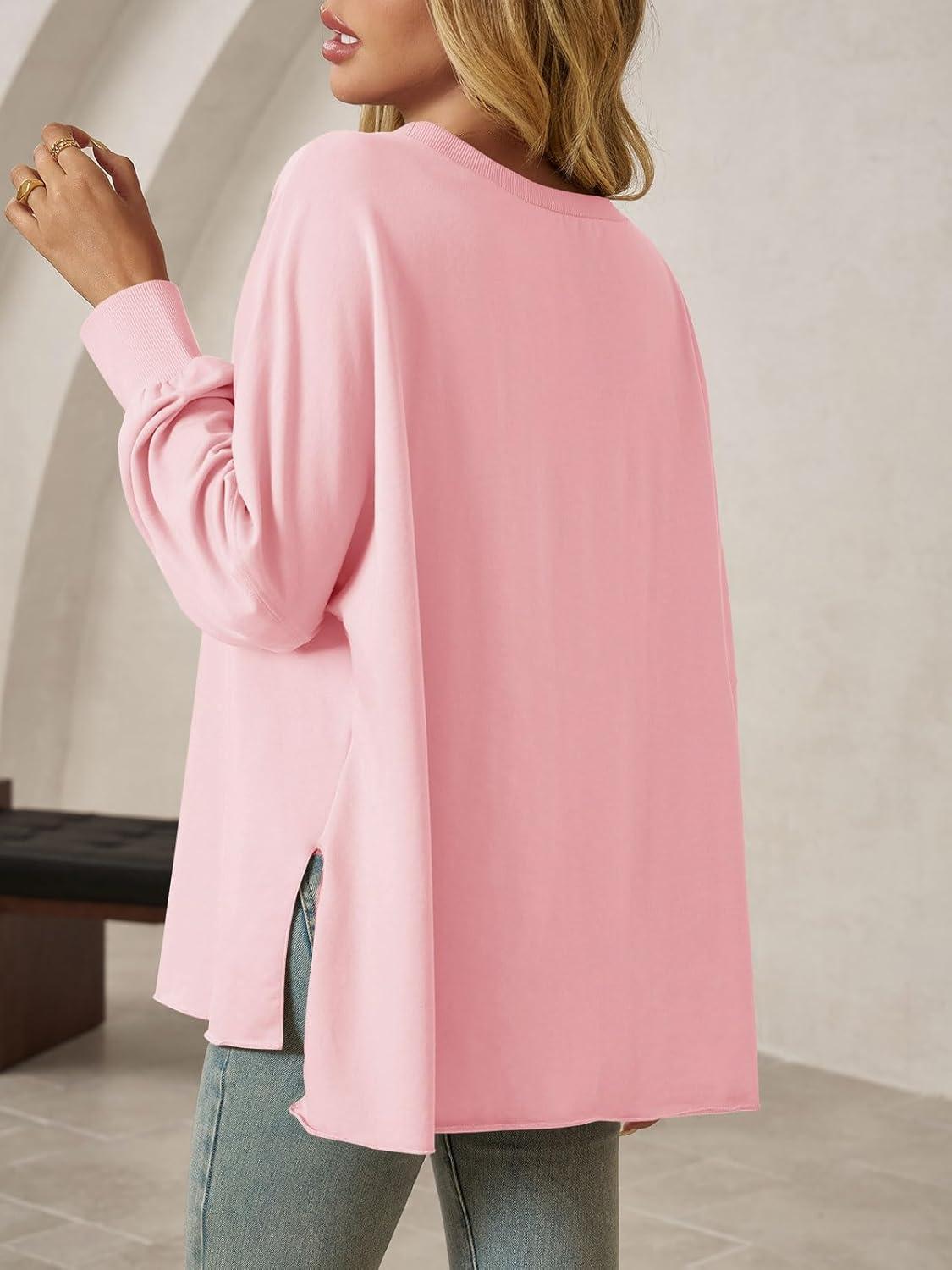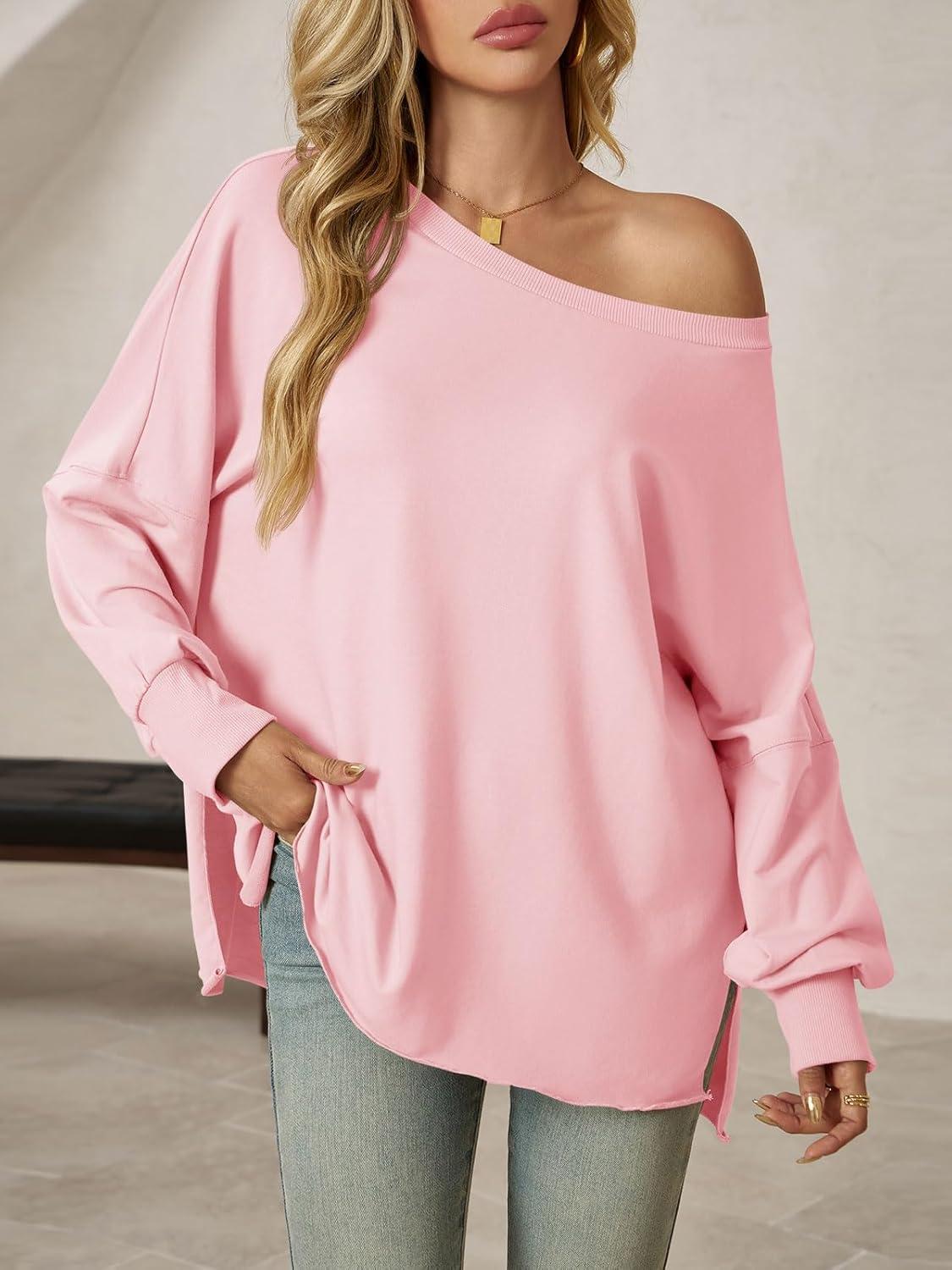 Tankaneo Womens Oversized Off The Shoulder Tops Long Sleeve Trendy Casual T-Shirts Side Slit Loose Fit Tunic Shirts(Pink)