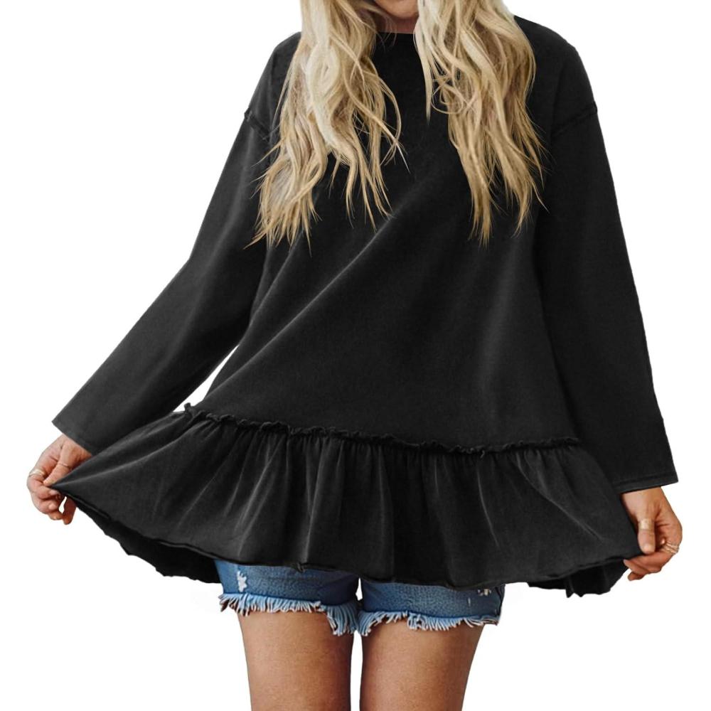 Tankaneo Womens Oversized Peplum Tunic Tops Long Sleeve Babydoll Tops Casual Pleated Shirts Crew Neck Flowy Loose Fit Tees(Black)