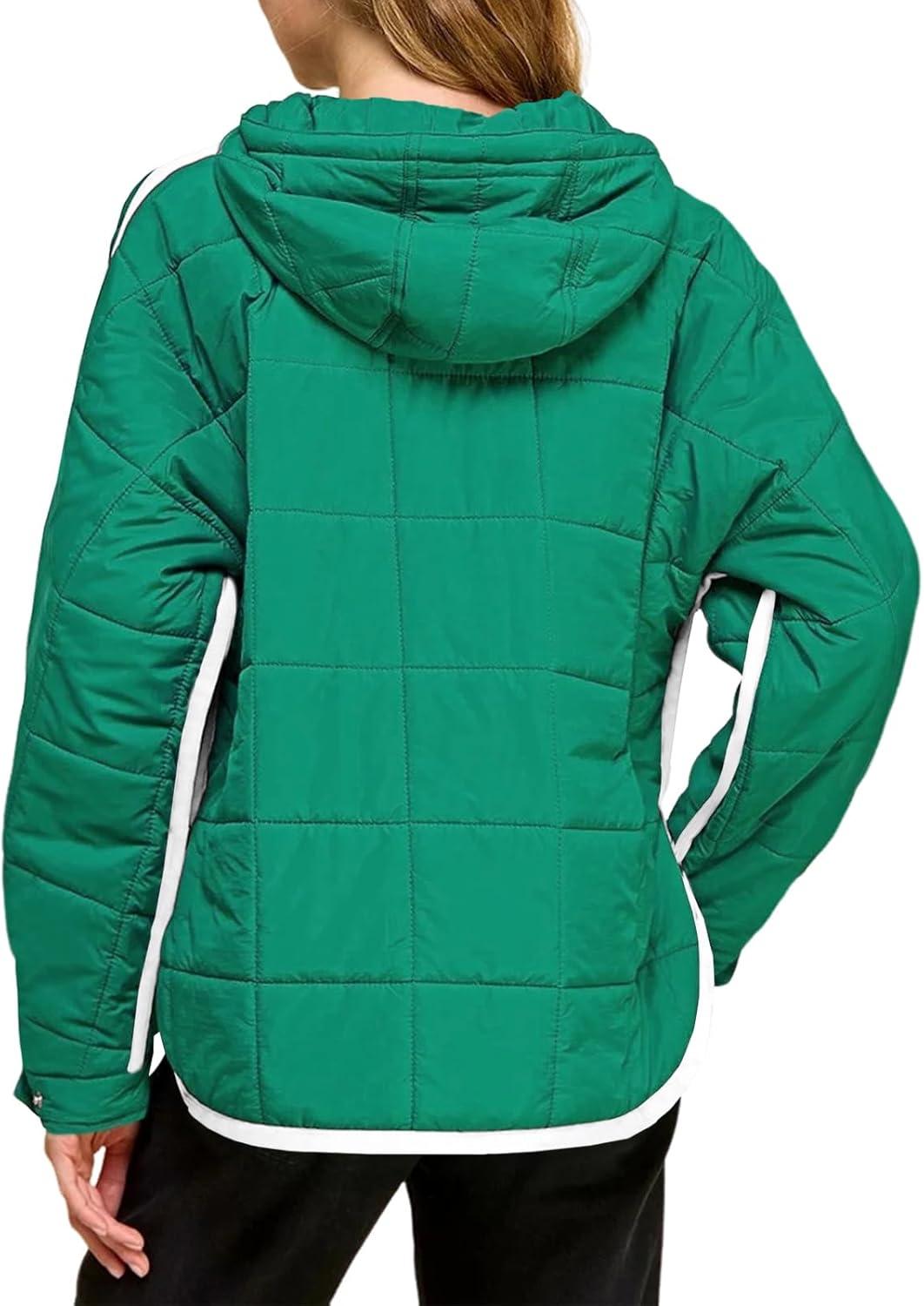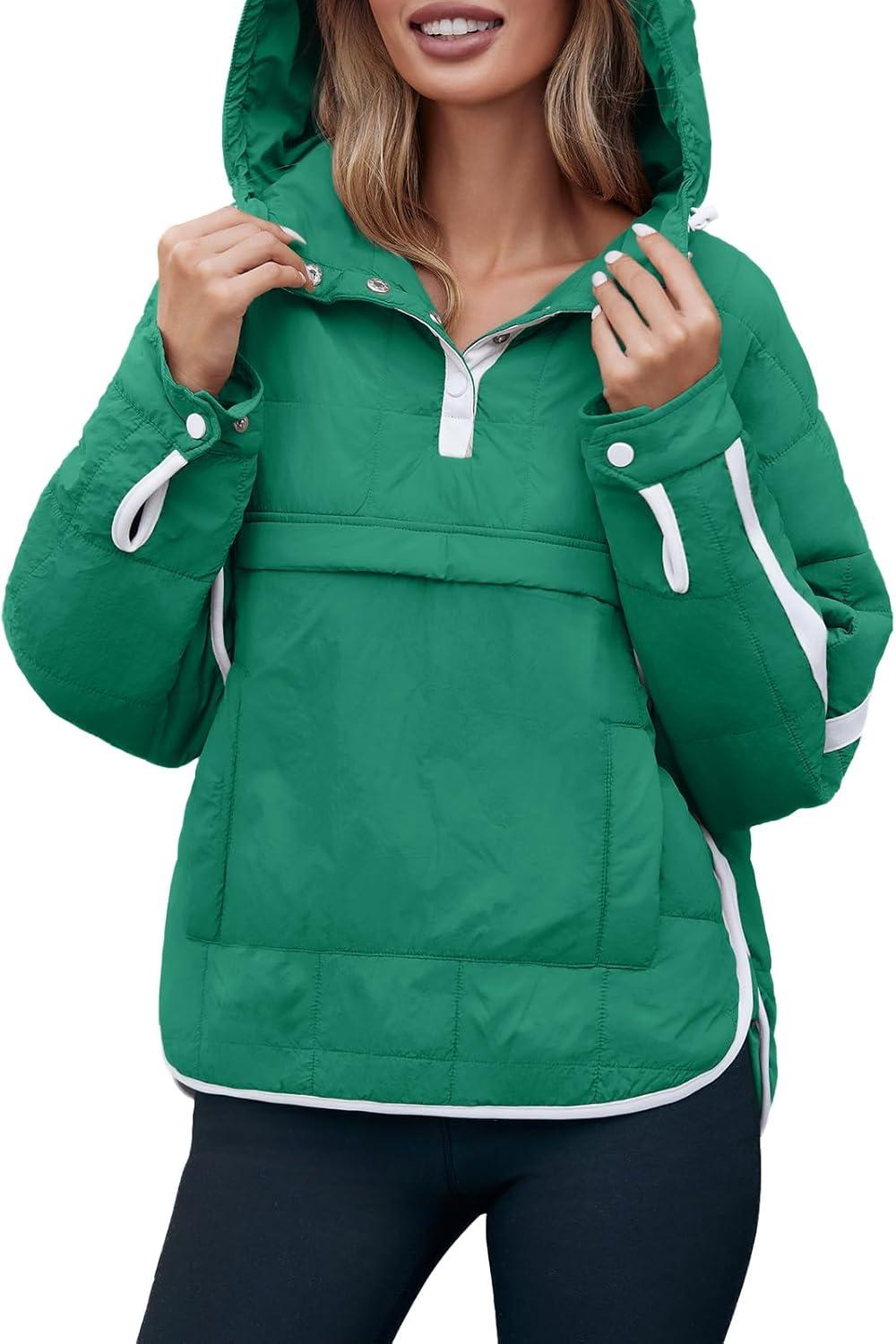 Tankaneo Womens Oversized Puffer Pullover Jacket Quilted Color Block Puffy Hooded Coat Fall Hoodies Outerwear with Pockets(Green)