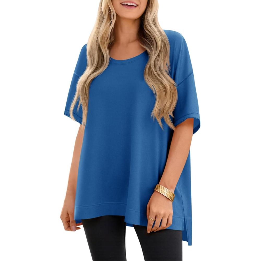 Tankaneo Womens Oversized Scoop Neck Tshirts Summer Casual Short Sleeve Tops Side Slit Loose Fit Basic Tee Shirts(Blue)