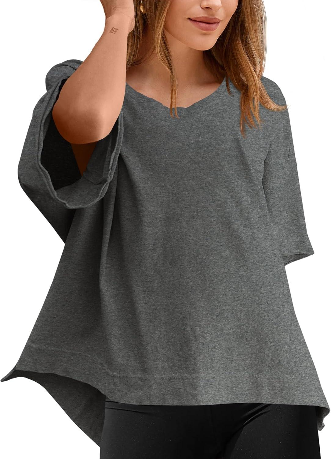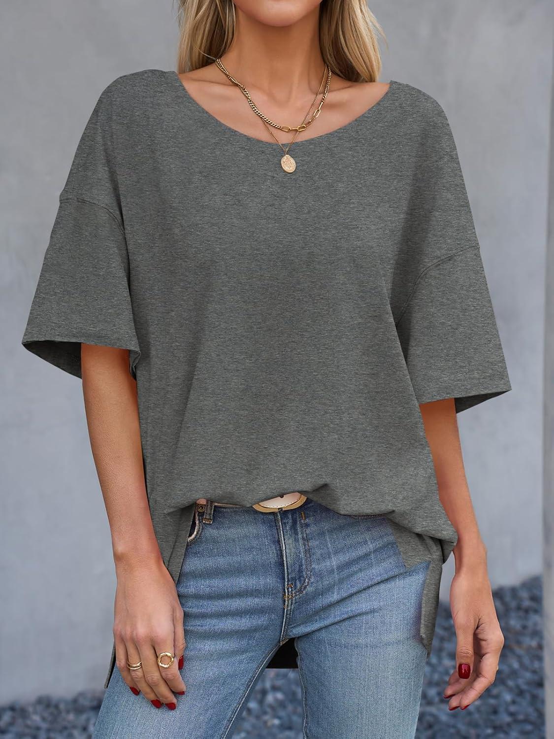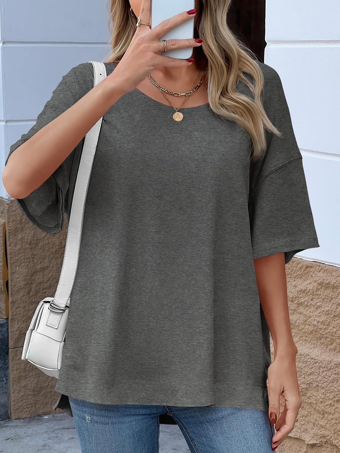 Tankaneo Womens Oversized Scoop Neck Tshirts Summer Casual Short Sleeve Tops Side Slit Loose Fit Basic Tee Shirts(Dark Grey)