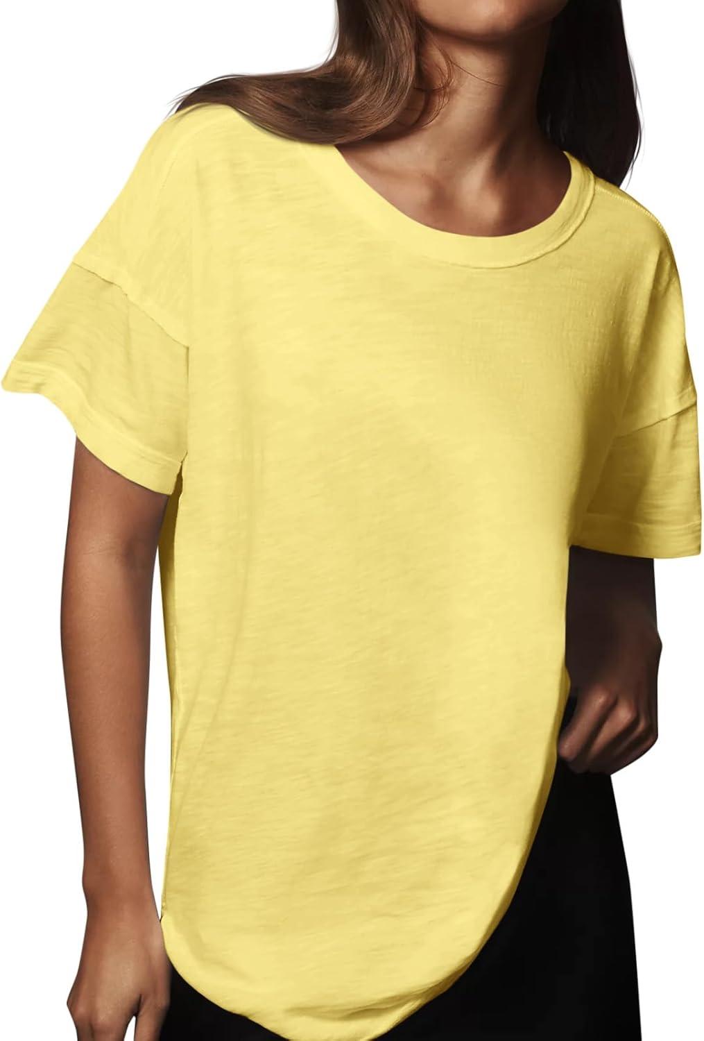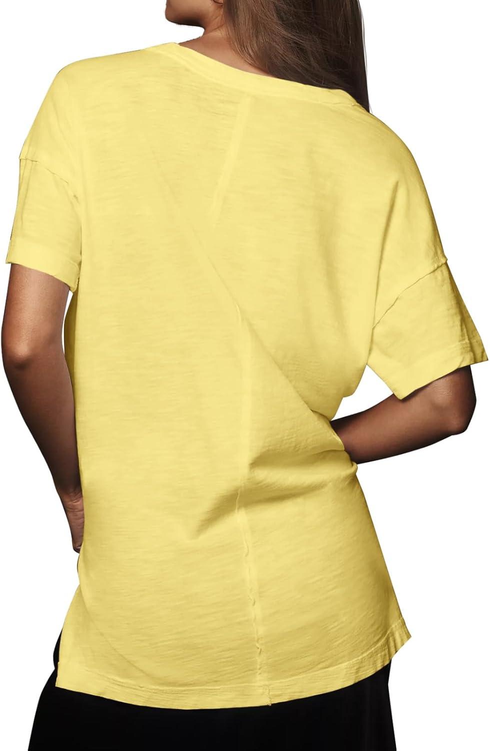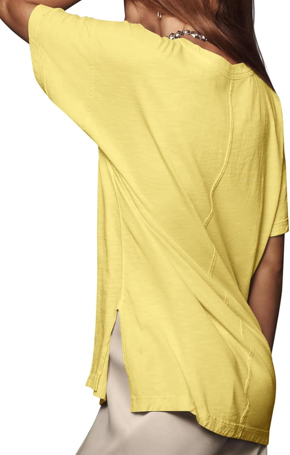 Tankaneo Womens Oversized Short Sleeve T Shirts Summer Casual Crew Neck Tunic Tops Loose Fit Basic Side Split Tees(Yellow)