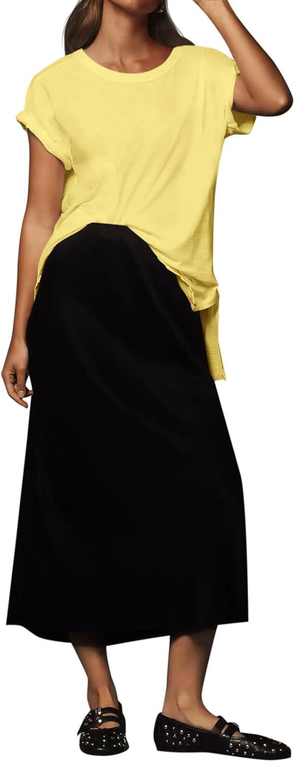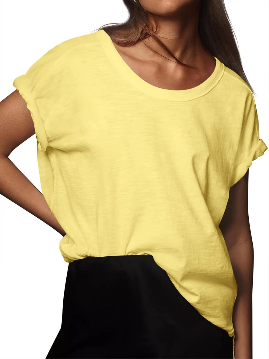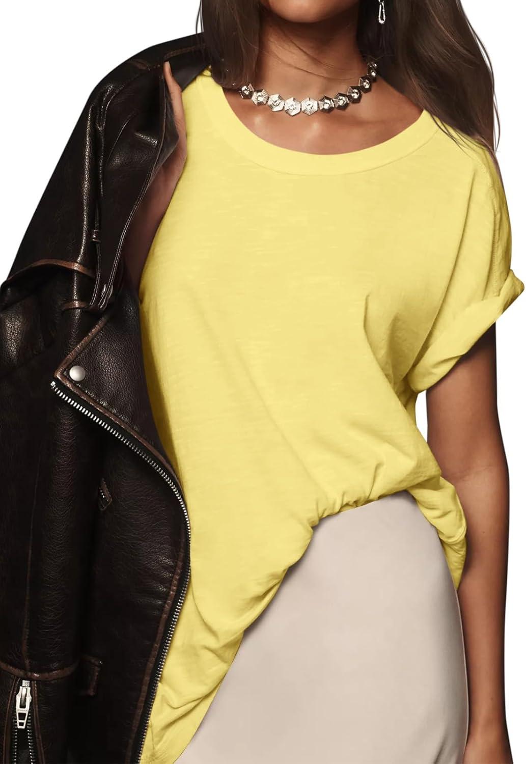 Tankaneo Womens Oversized Short Sleeve T Shirts Summer Casual Crew Neck Tunic Tops Loose Fit Basic Side Split Tees(Yellow)