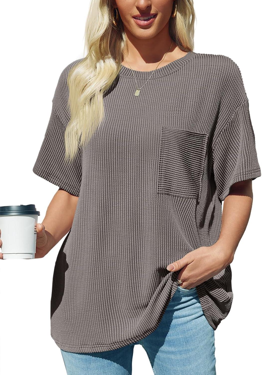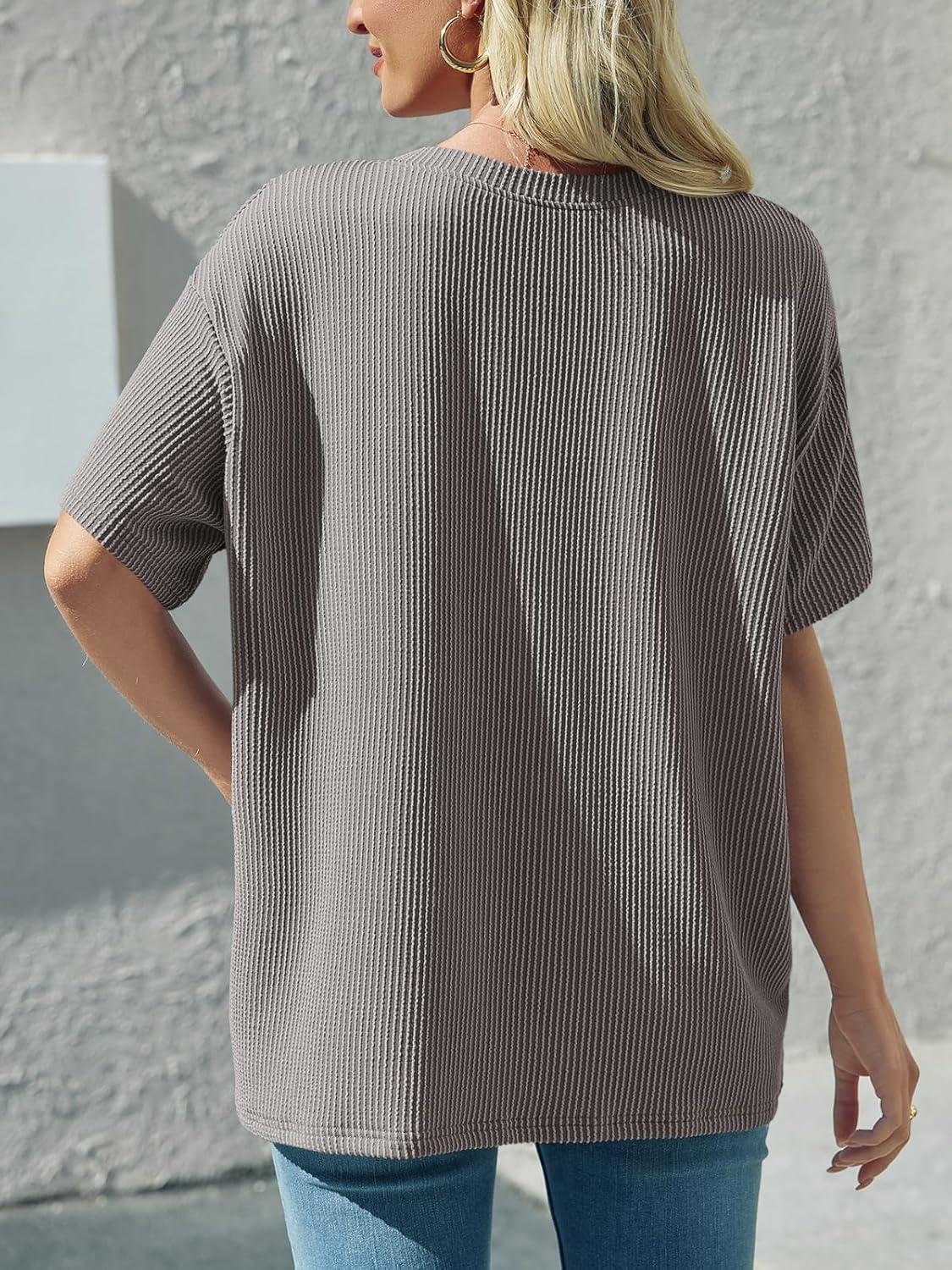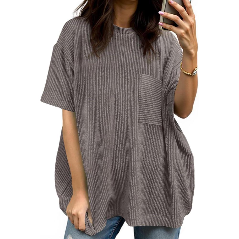 Tankaneo Womens Oversized Short Sleeve Tops Summer Textured Crew Neck T Shirt Ribbed Casual Basic Tees(Grey)