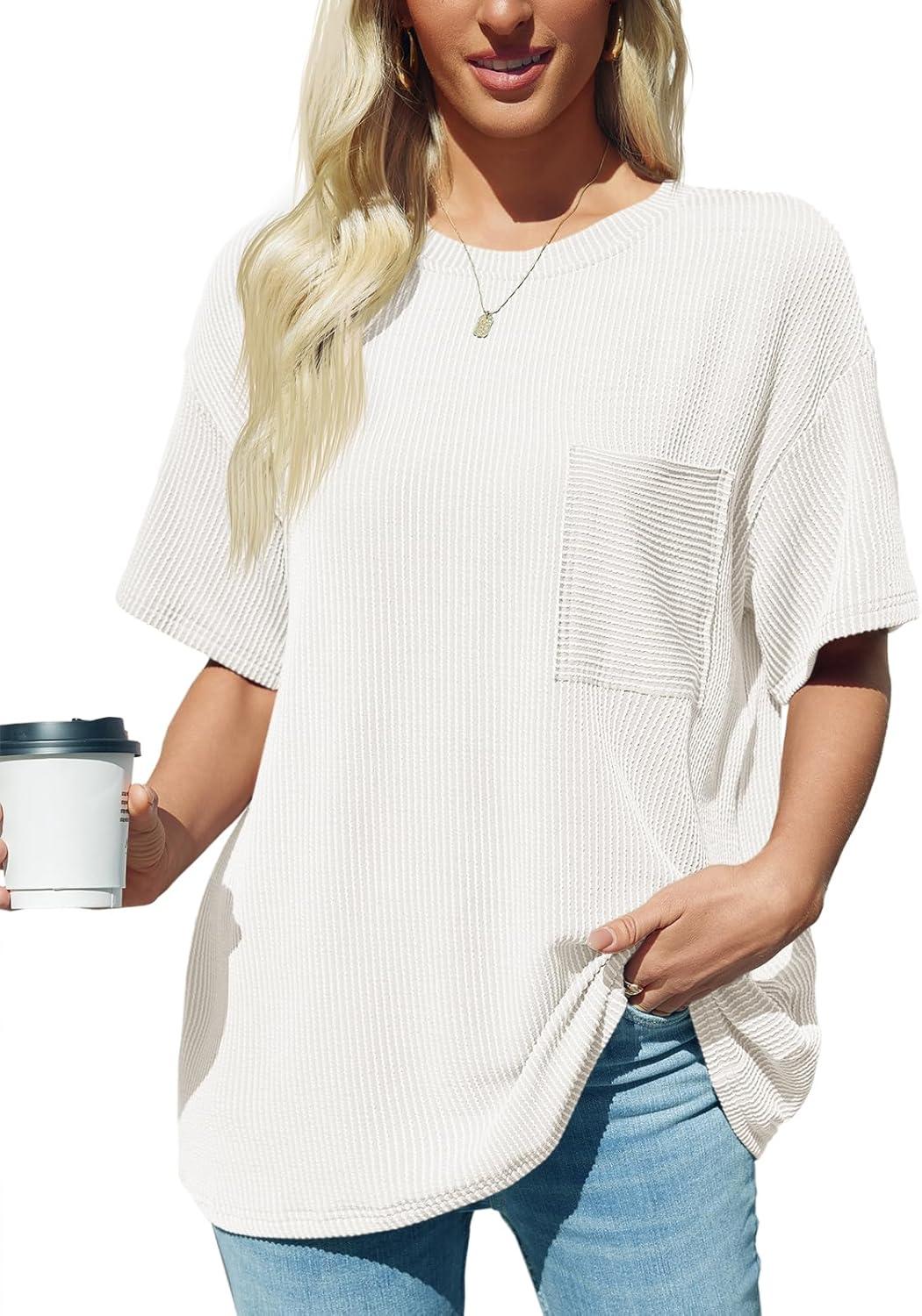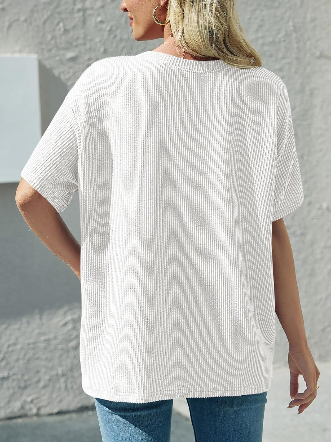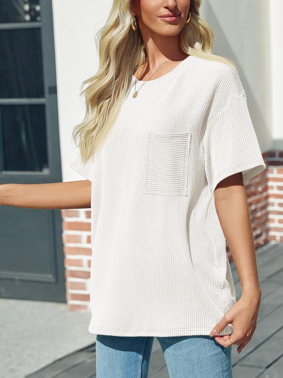 Tankaneo Womens Oversized Short Sleeve Tops Summer Textured Crew Neck T Shirt Ribbed Casual Basic Tees(White)