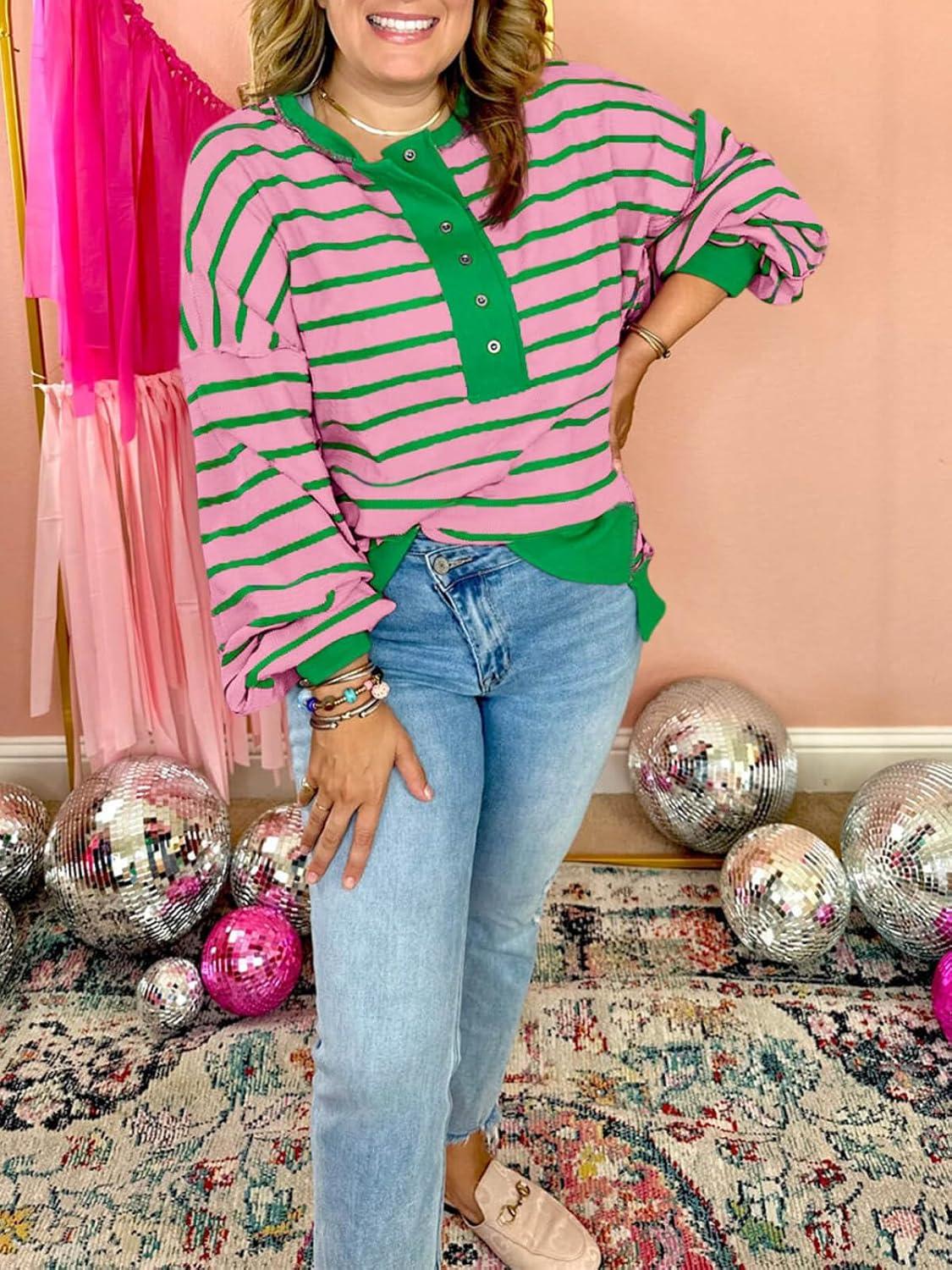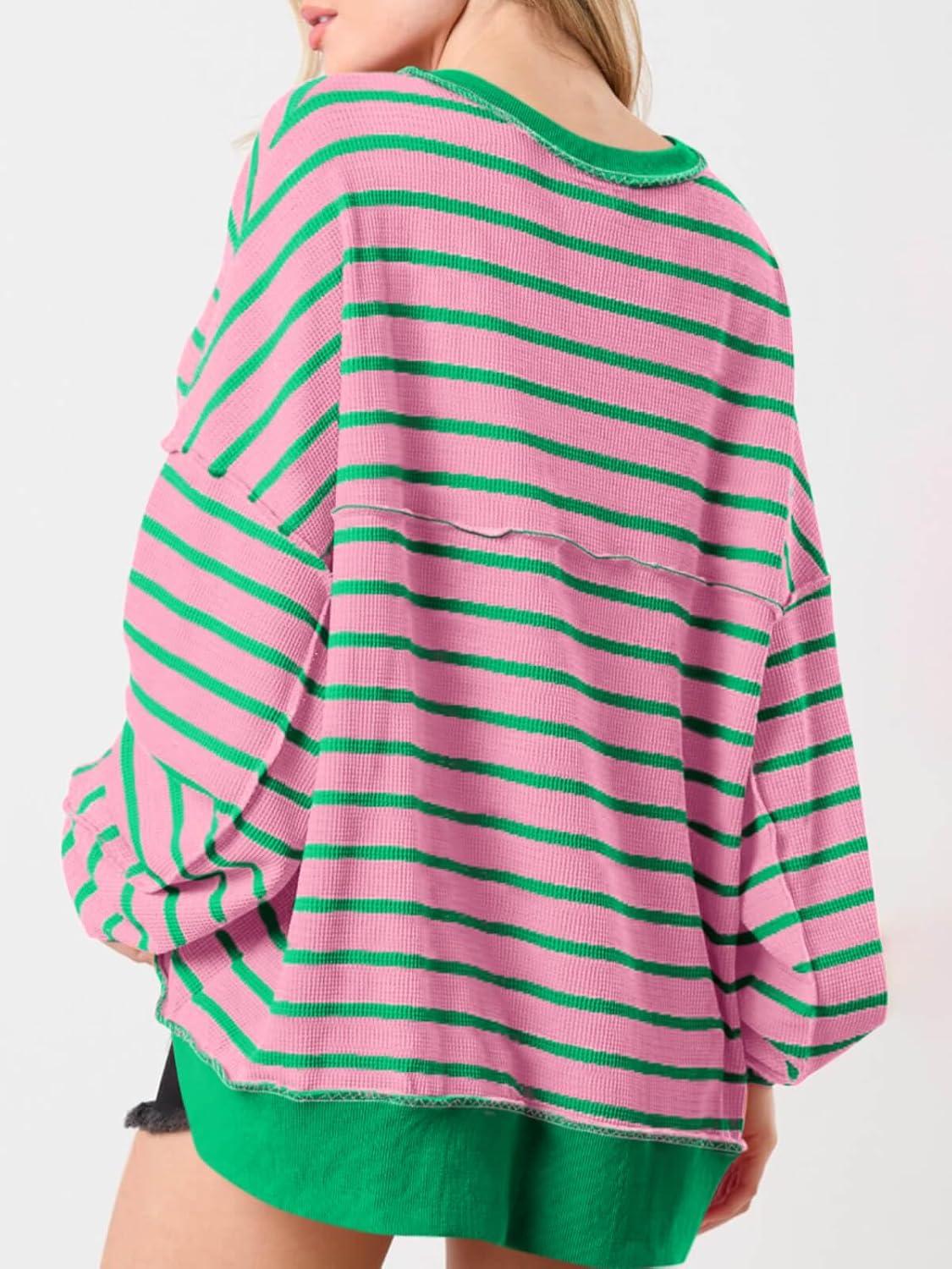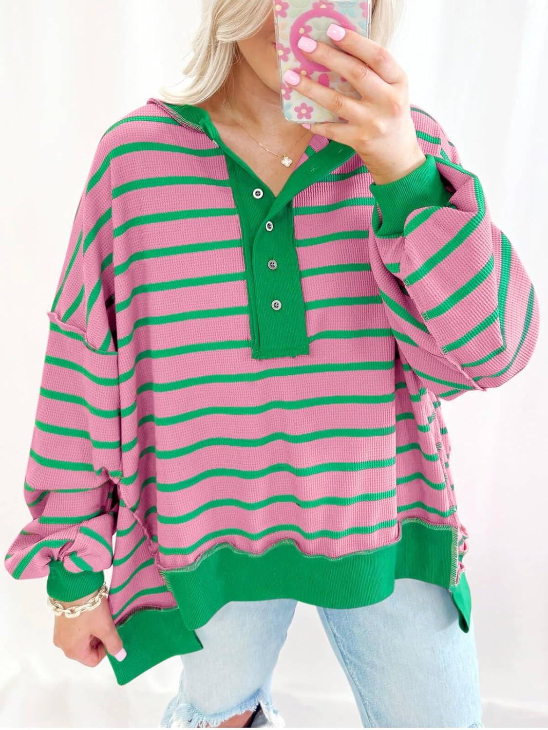 Tankaneo Womens Oversized Striped Sweatshirts Henley Shirts Color Block Casual Pullover Waffle Knit Tops(Pink Green)