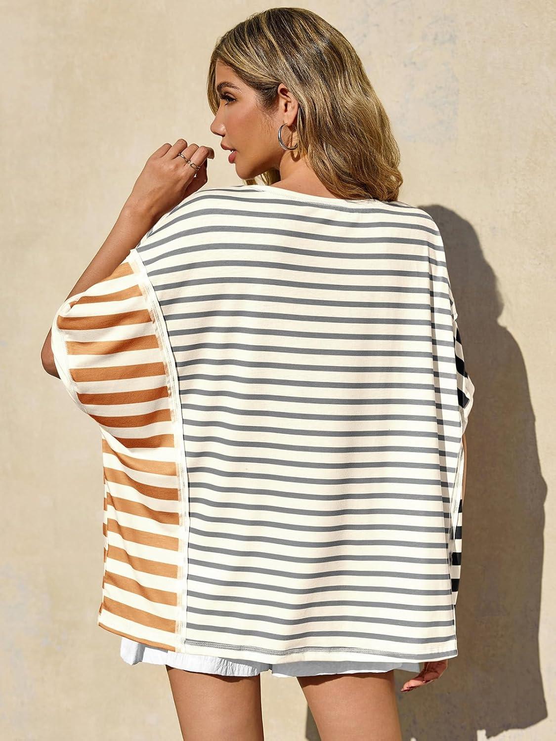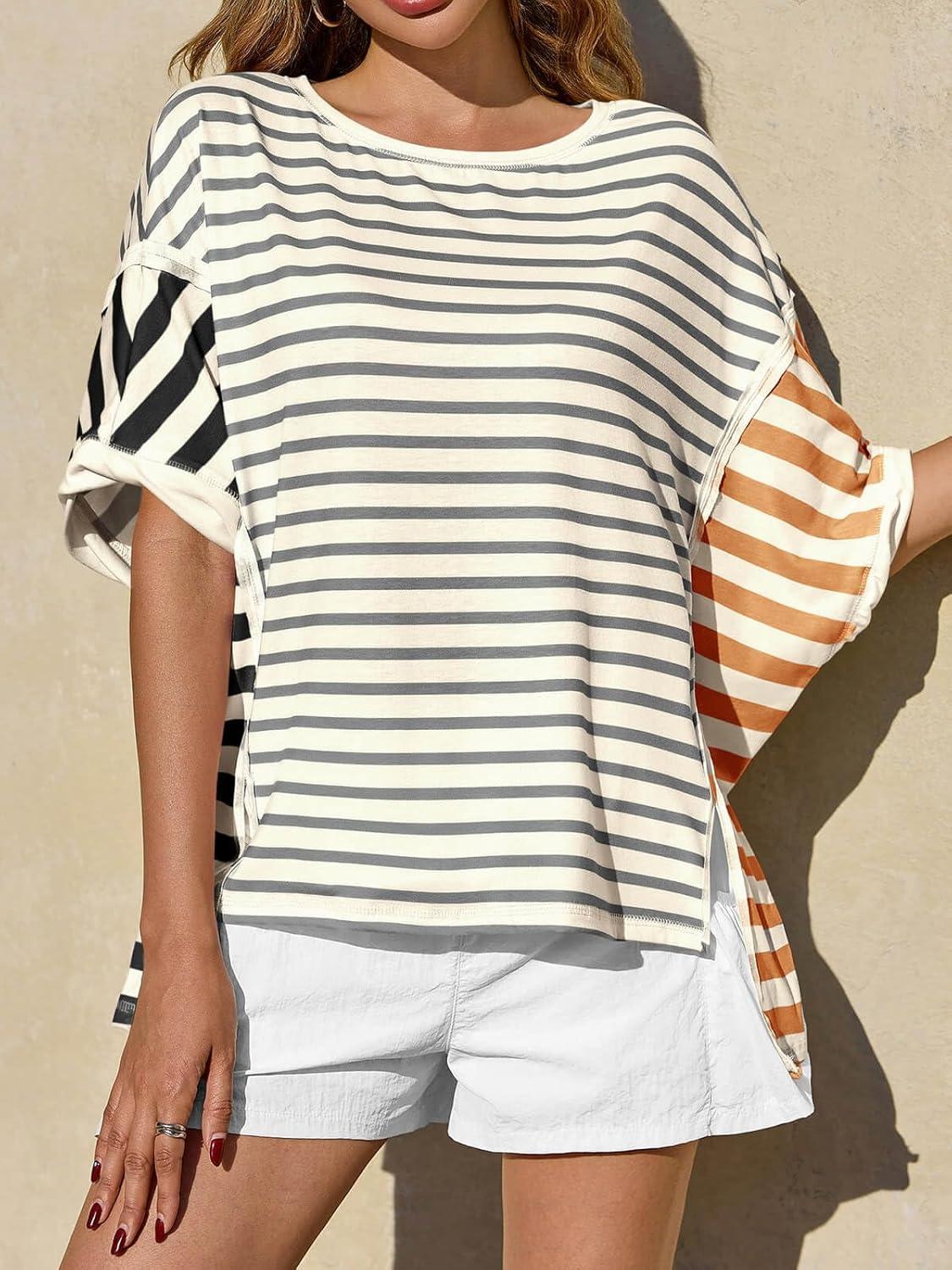 Tankaneo Womens Oversized Striped T-Shirts Color Block Short Sleeve Tee Tops Summer Casual High Low Hem Shirts(Light Grey)