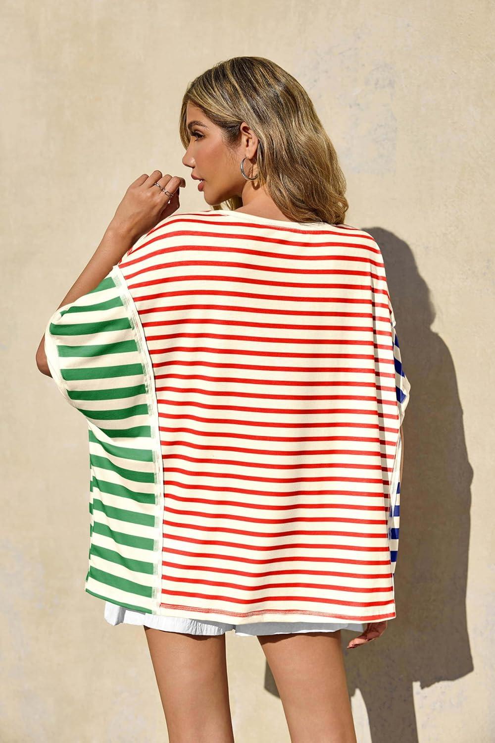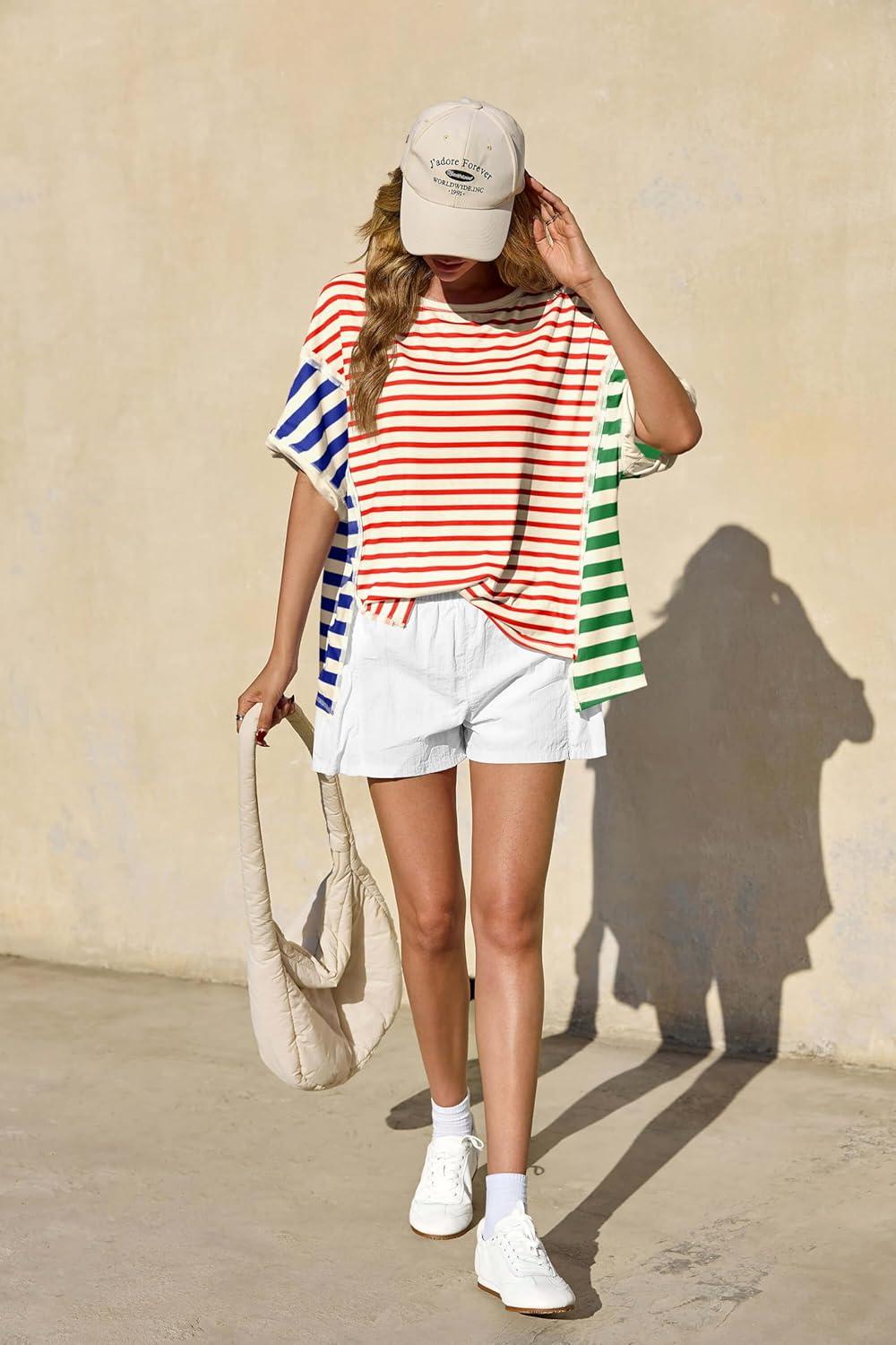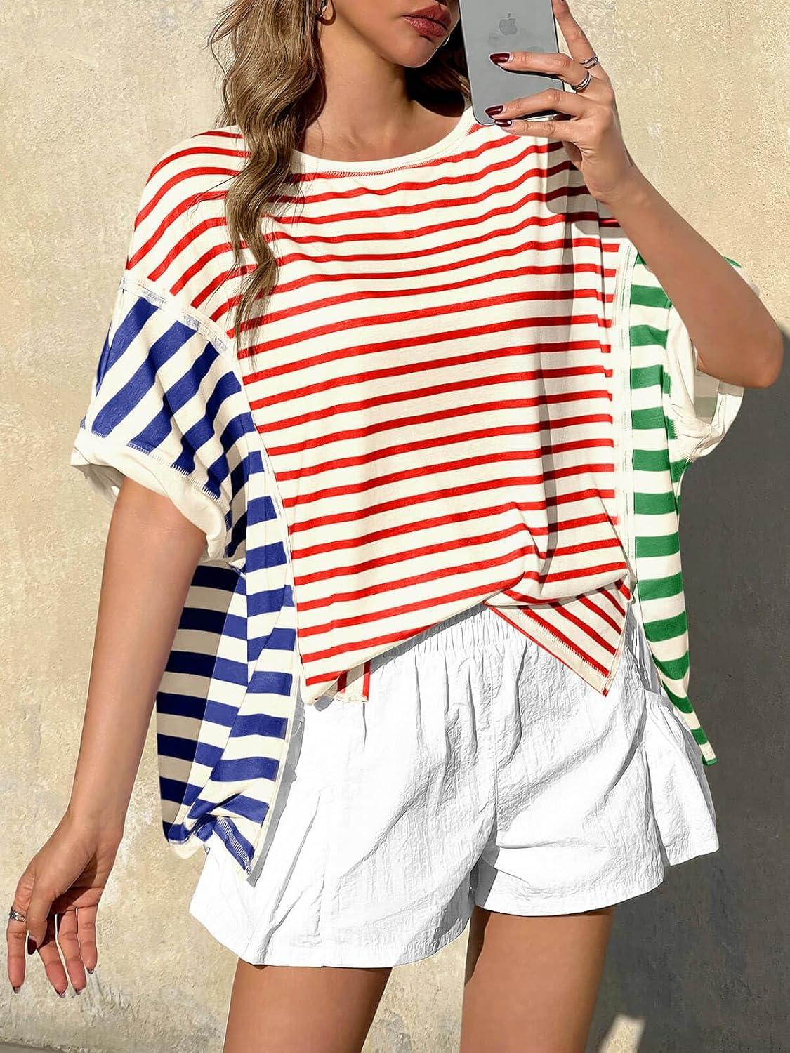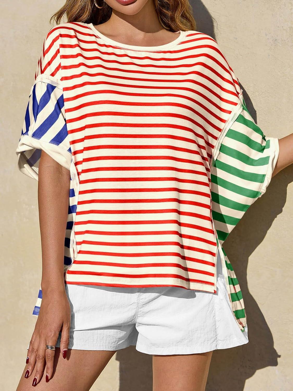 Tankaneo Womens Oversized Striped T-Shirts Color Block Short Sleeve Tee Tops Summer Casual High Low Hem Shirts(Red)